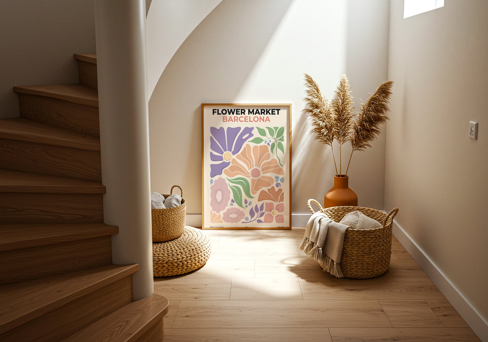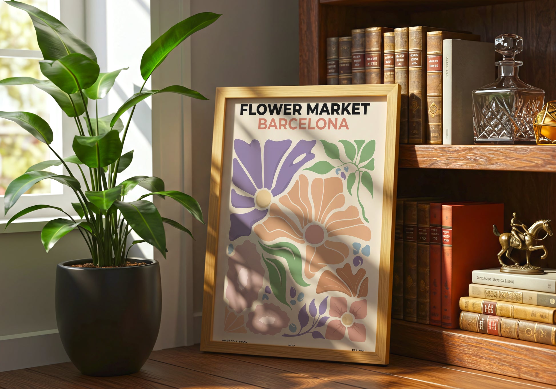 Poster dal gusto moderno e delicato, ispirato ai mercati dei fiori di Barcellona. La composizione di fiori stilizzati in tonalità pastello crea un’atmosfera fresca, luminosa e decorativa. Perfetto per aggiungere colore e morbidezza agli ambienti.