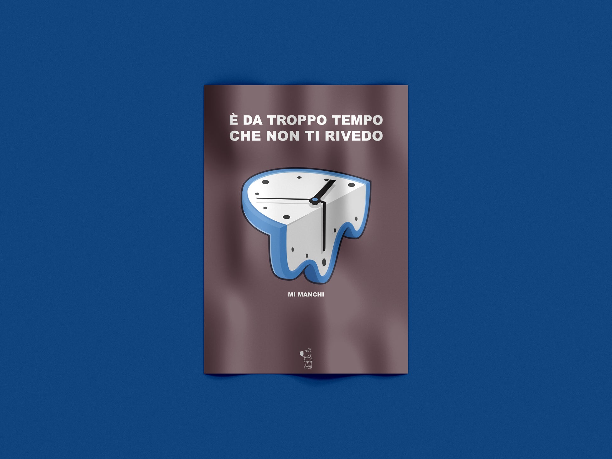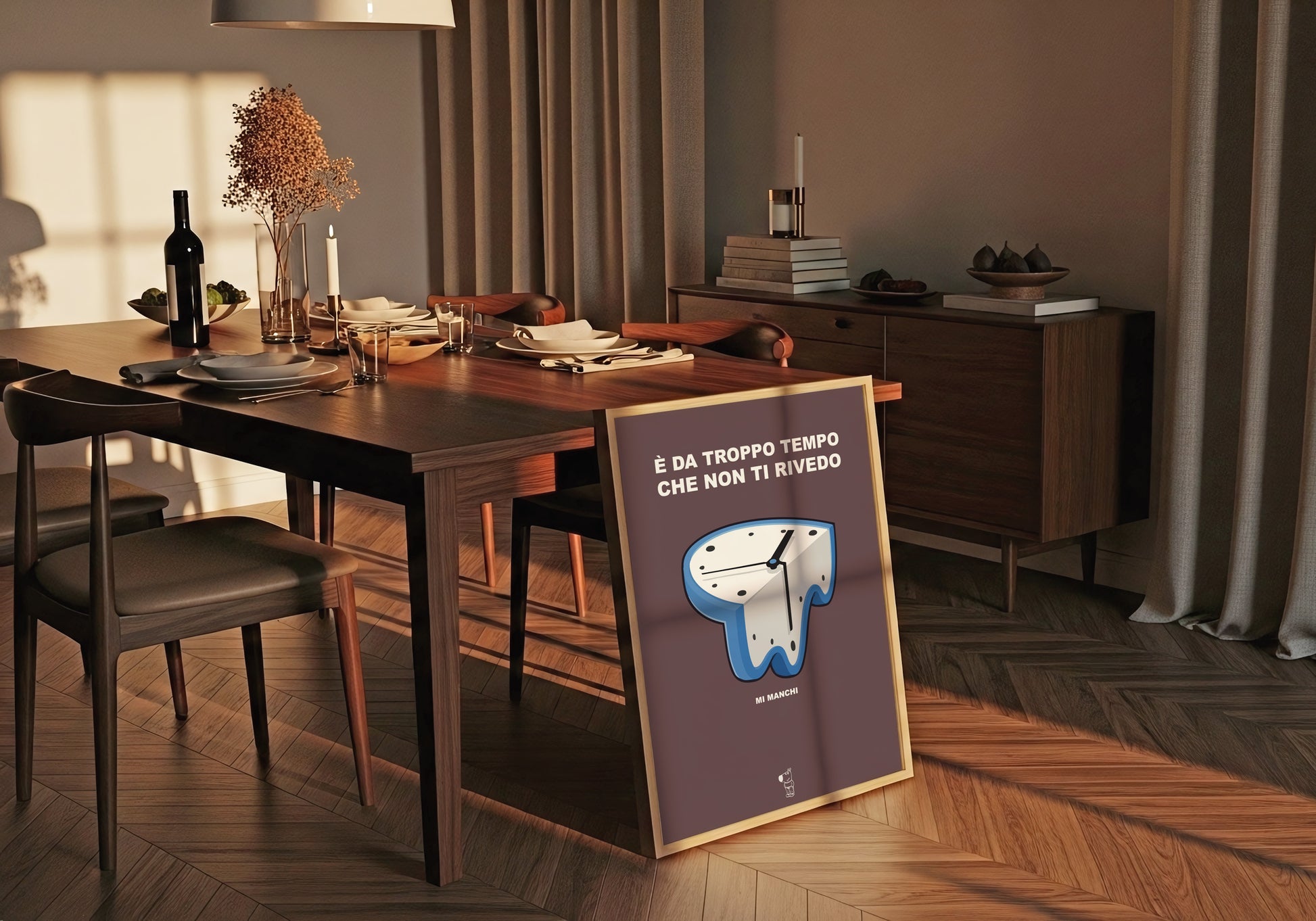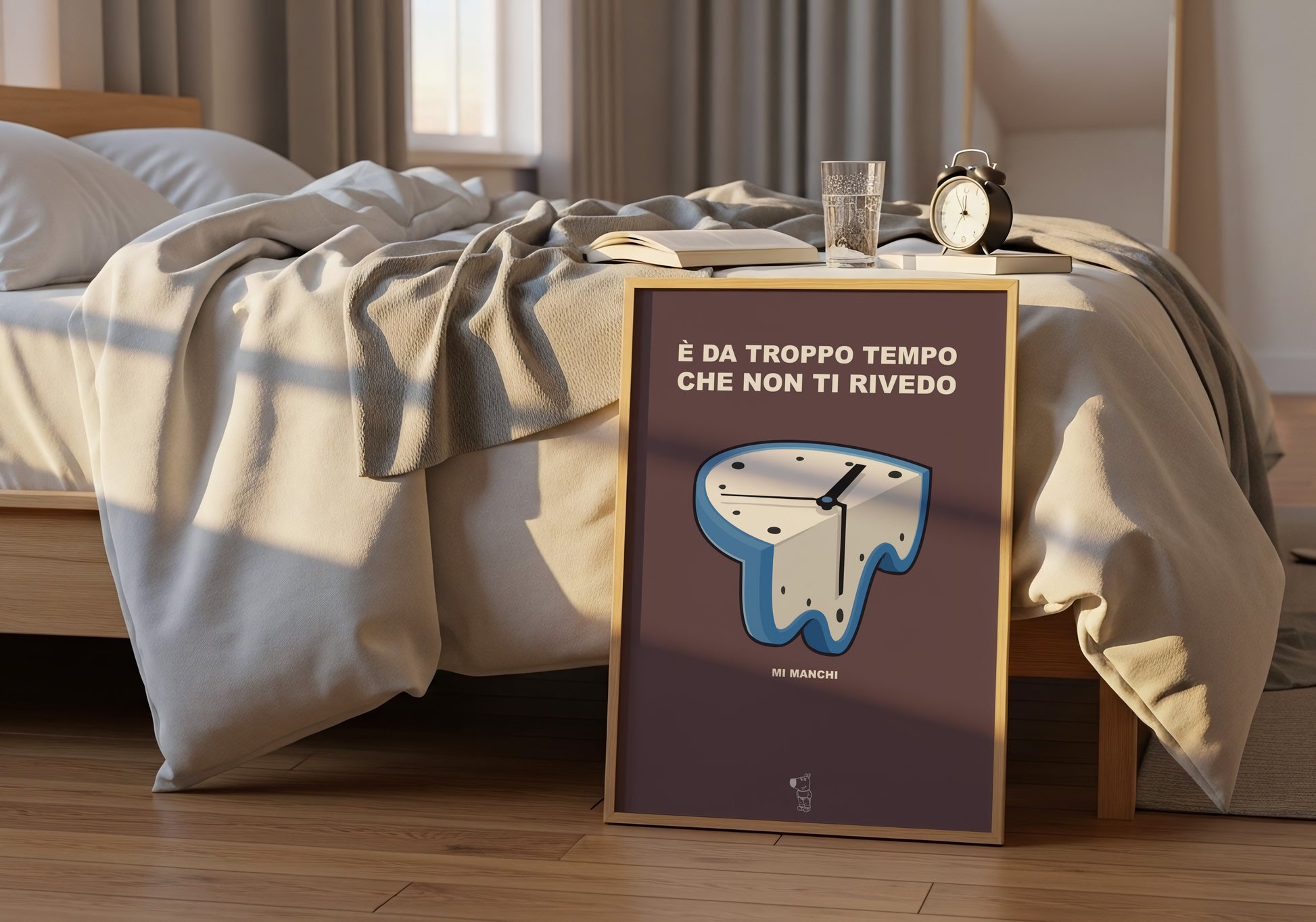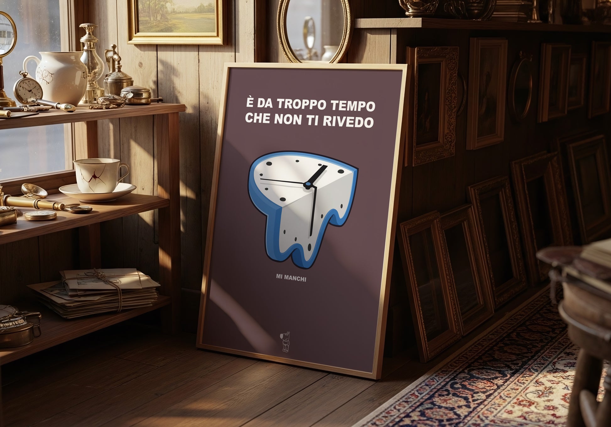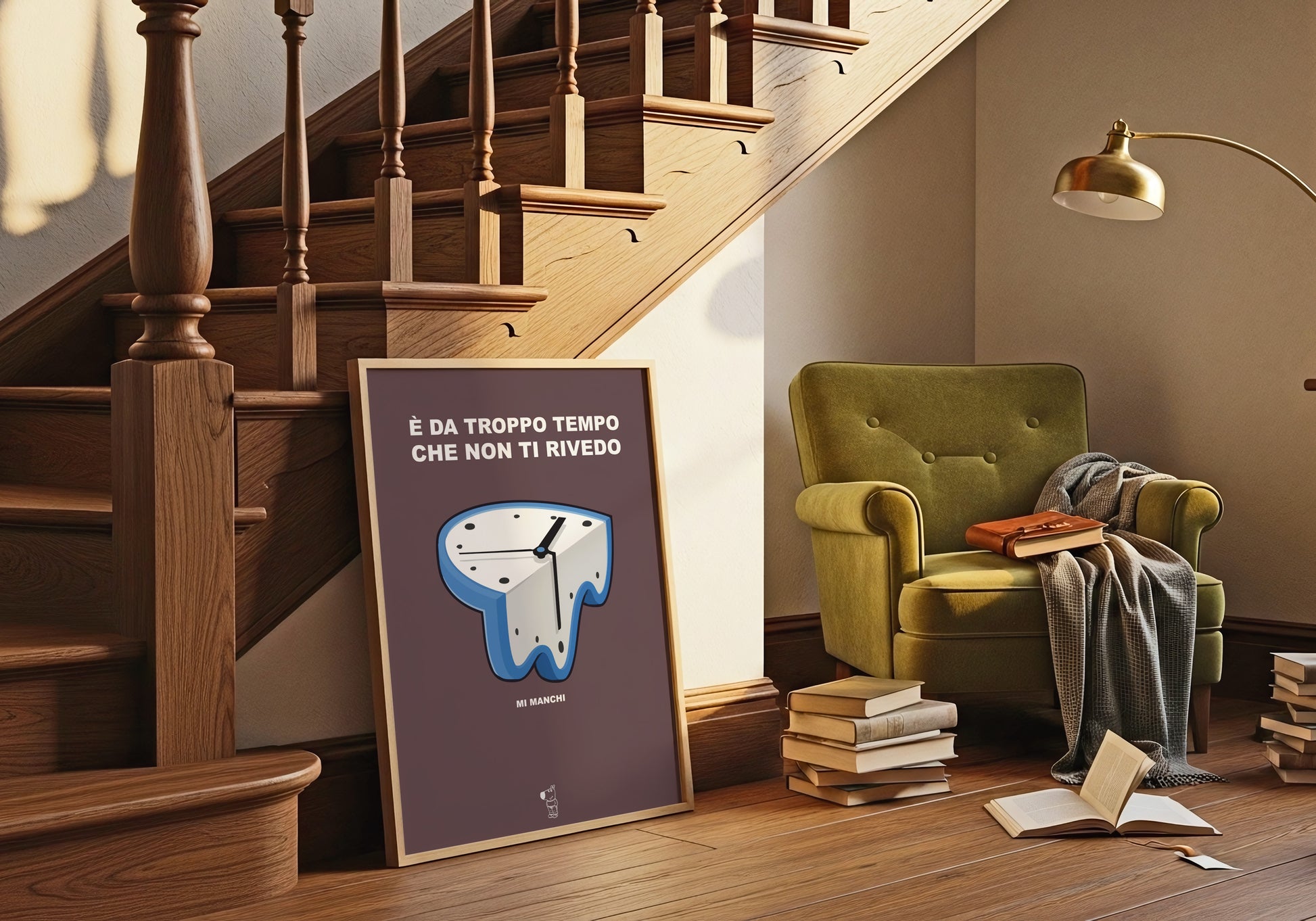 Un poster dolce e ironico: un orologio sciolto che sembra cedere al peso dell’attesa, accompagnato dalla frase “È da troppo tempo che non ti rivedo — mi manchi”. Un mix tra surrealismo e sentimento, perfetto per chi vuole regalare (o regalarsi) un messaggio tenero ma diverso dal solito.
