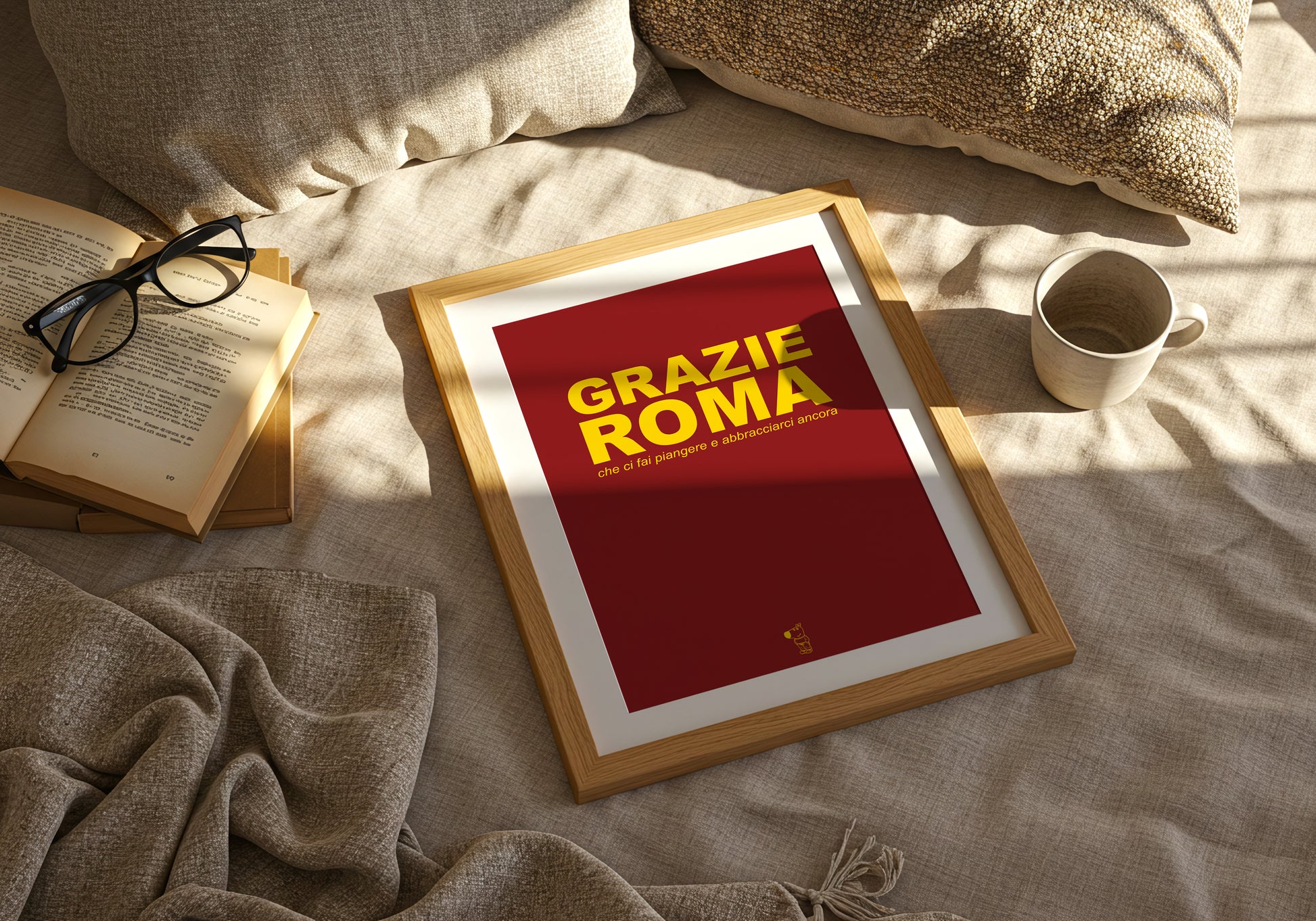 Un poster dedicato a una delle frasi più iconiche e cantate di sempre. “Grazie Roma” risalta in giallo su fondo rosso, celebrando emozioni, cori da stadio e quella nostalgia bella che solo la capitale sa dare. Un pezzo semplice ma pieno di sentimento, perfetto per chi ama Roma e tutto ciò che rappresenta.