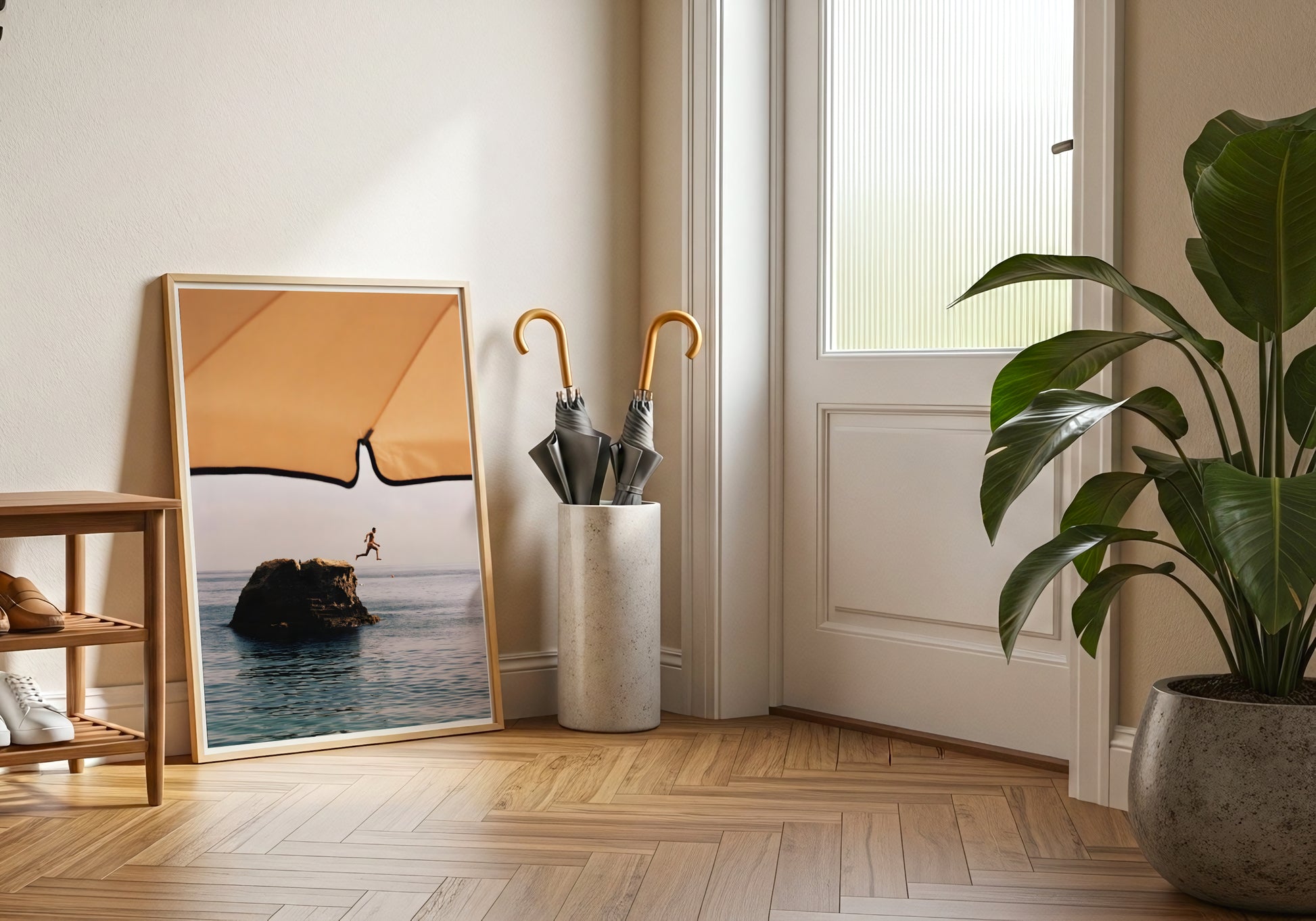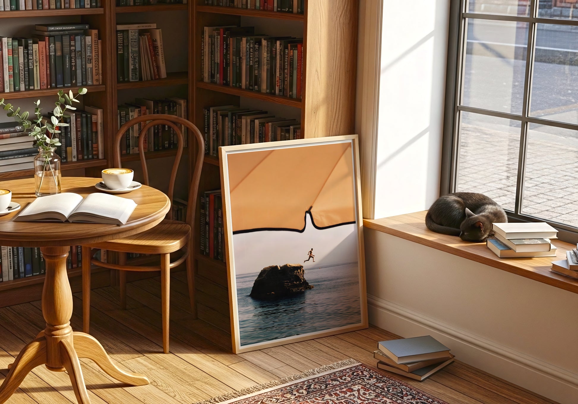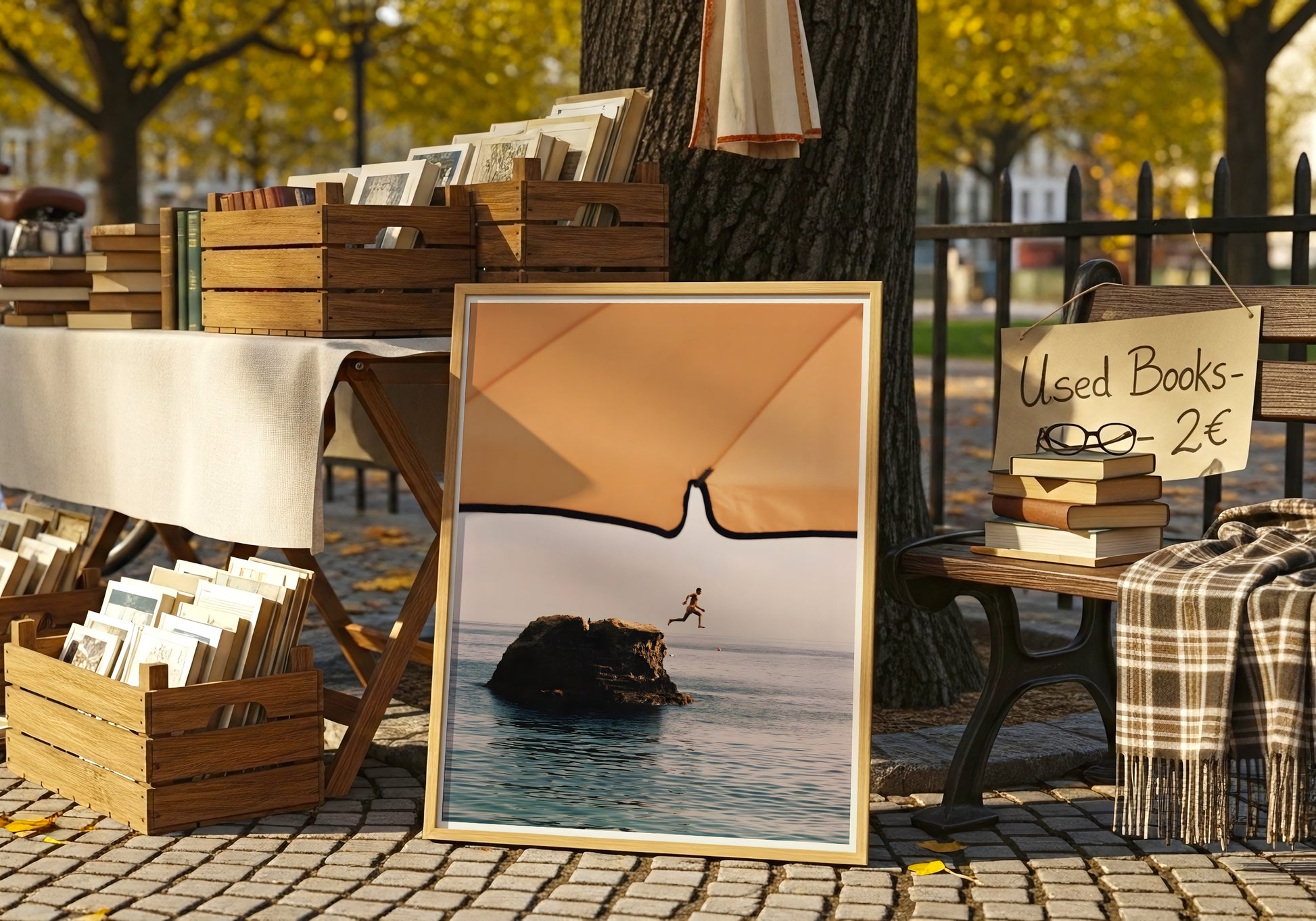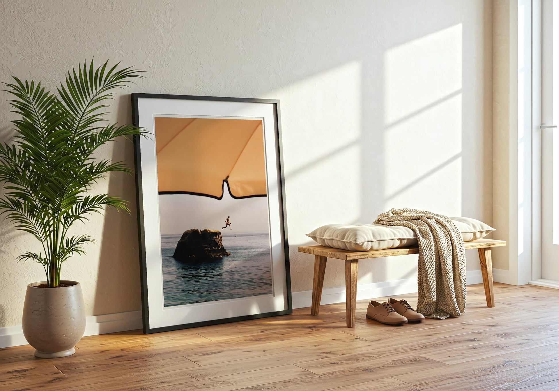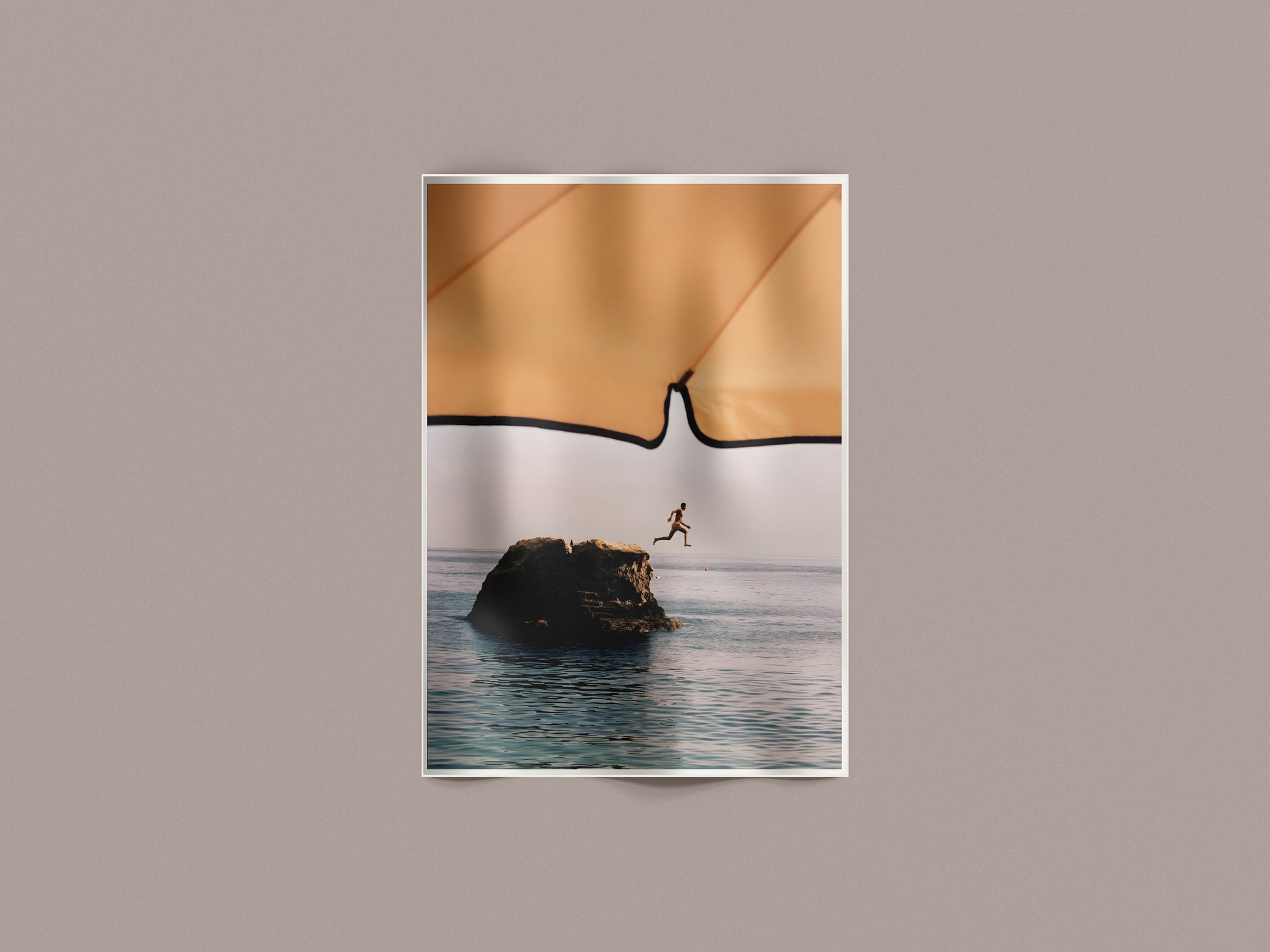 Una fotografia che profuma d’estate: un ragazzo che si lancia da una roccia nel mare, mentre un ombrellone color pesca incornicia la scena dall’alto. Un mix di energia, libertà e leggerezza che racconta alla perfezione quei momenti sospesi in cui il tempo sembra fermarsi.