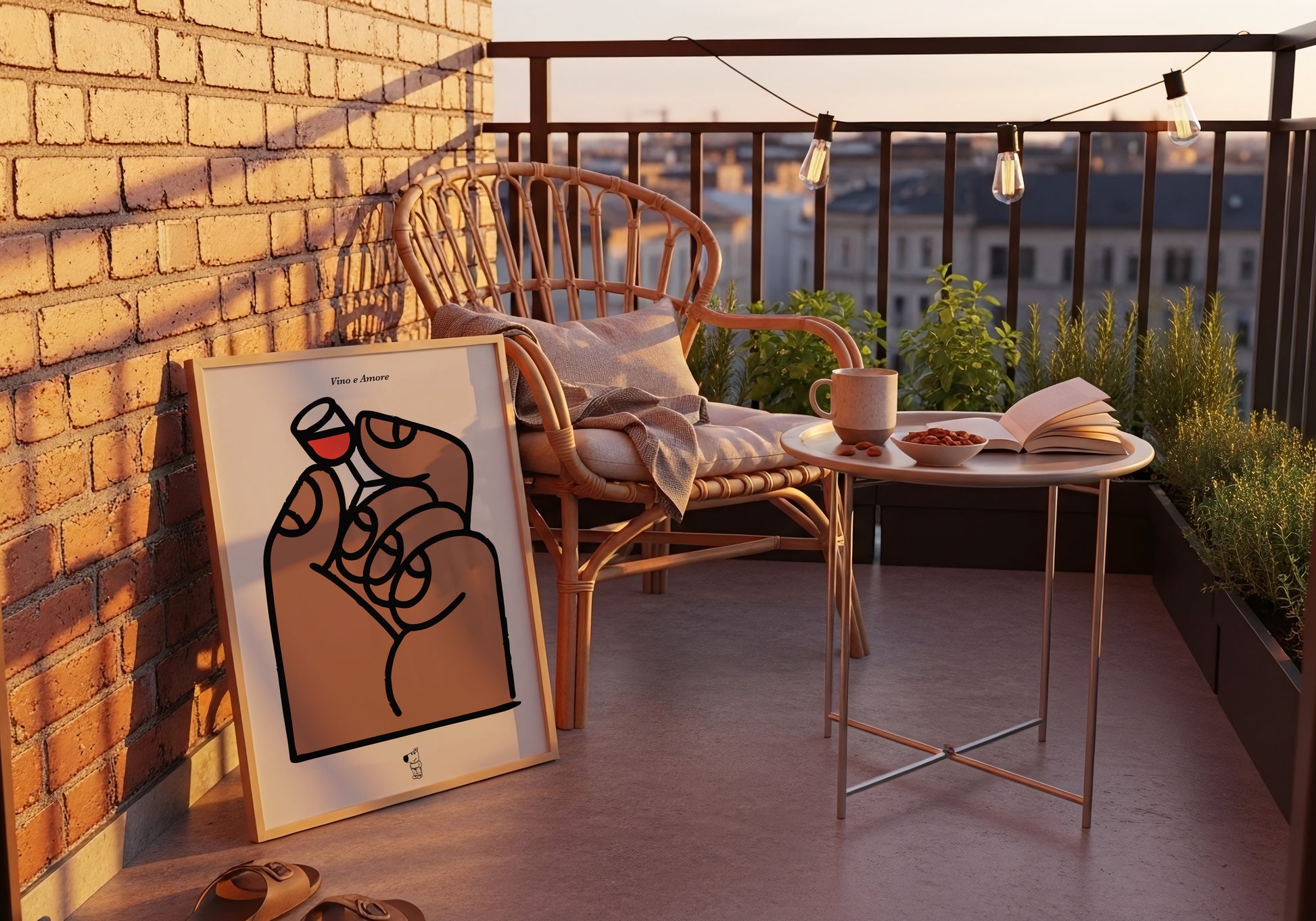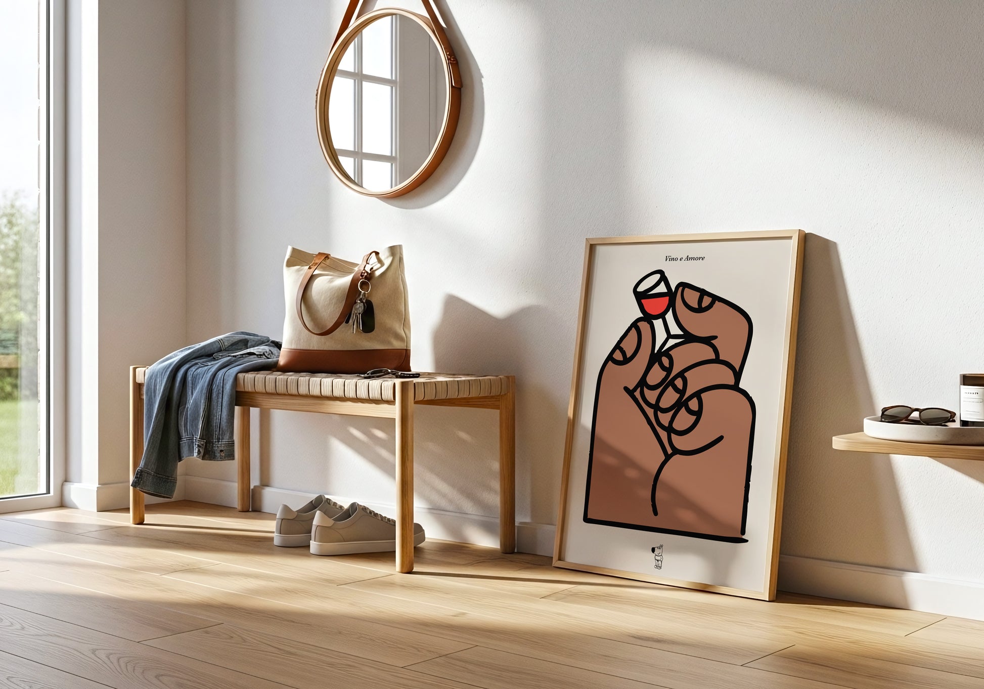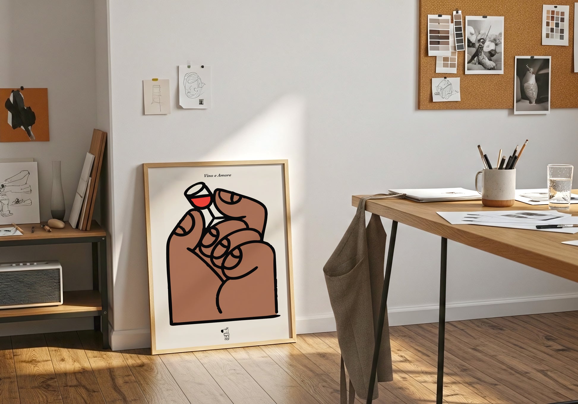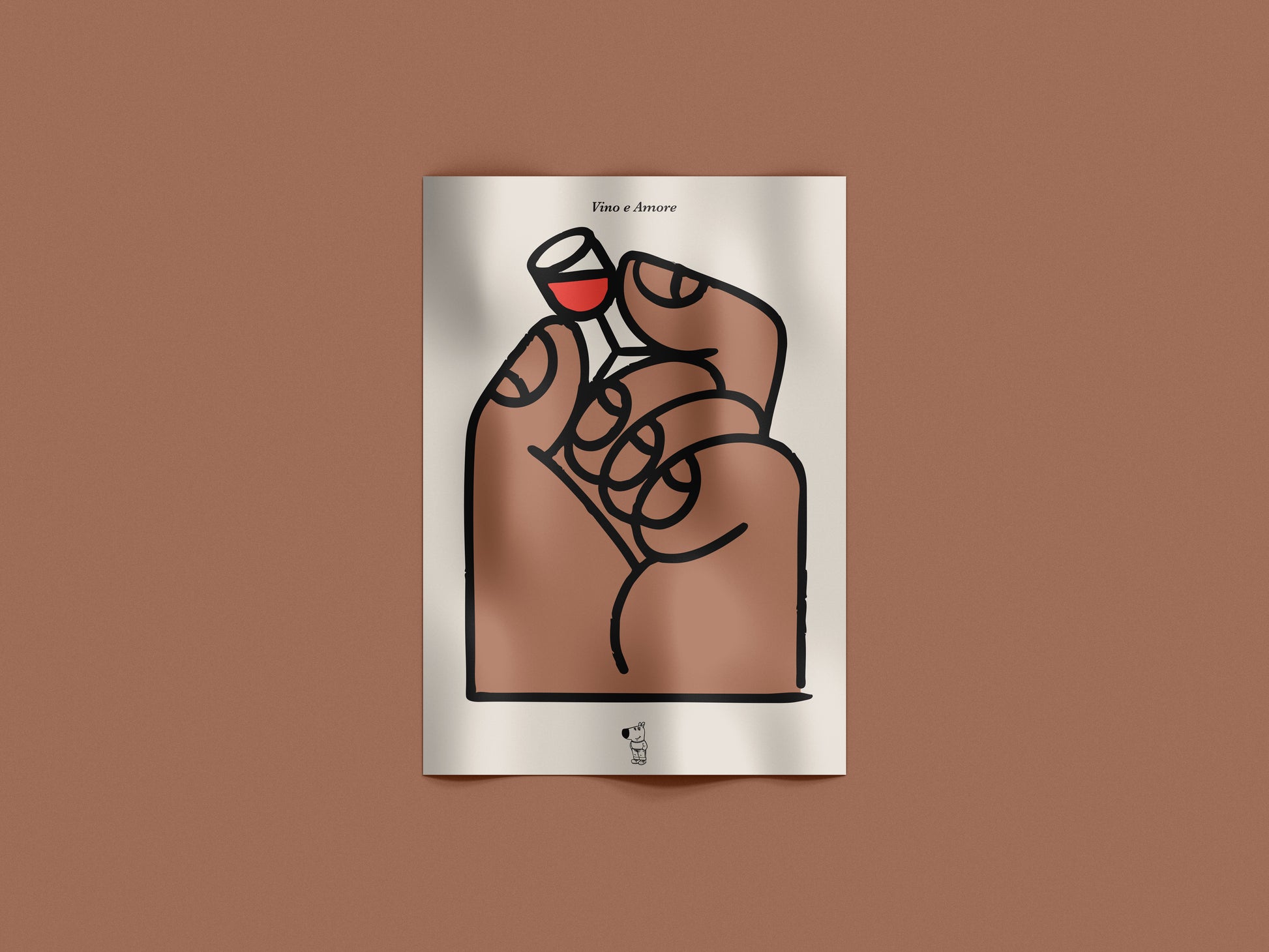 Un gesto piccolo che dice tanto: una mano che solleva un minuscolo calice di vino, in un’illustrazione essenziale dalle linee morbide e dal tono affettuoso. Un poster perfetto per chi ama i dettagli semplici, il buon vino e le immagini che fanno sorridere senza troppi fronzoli.