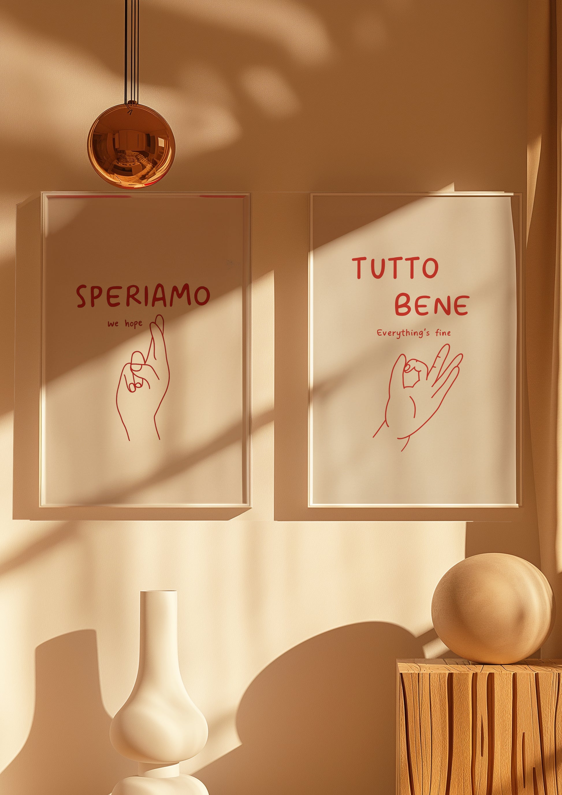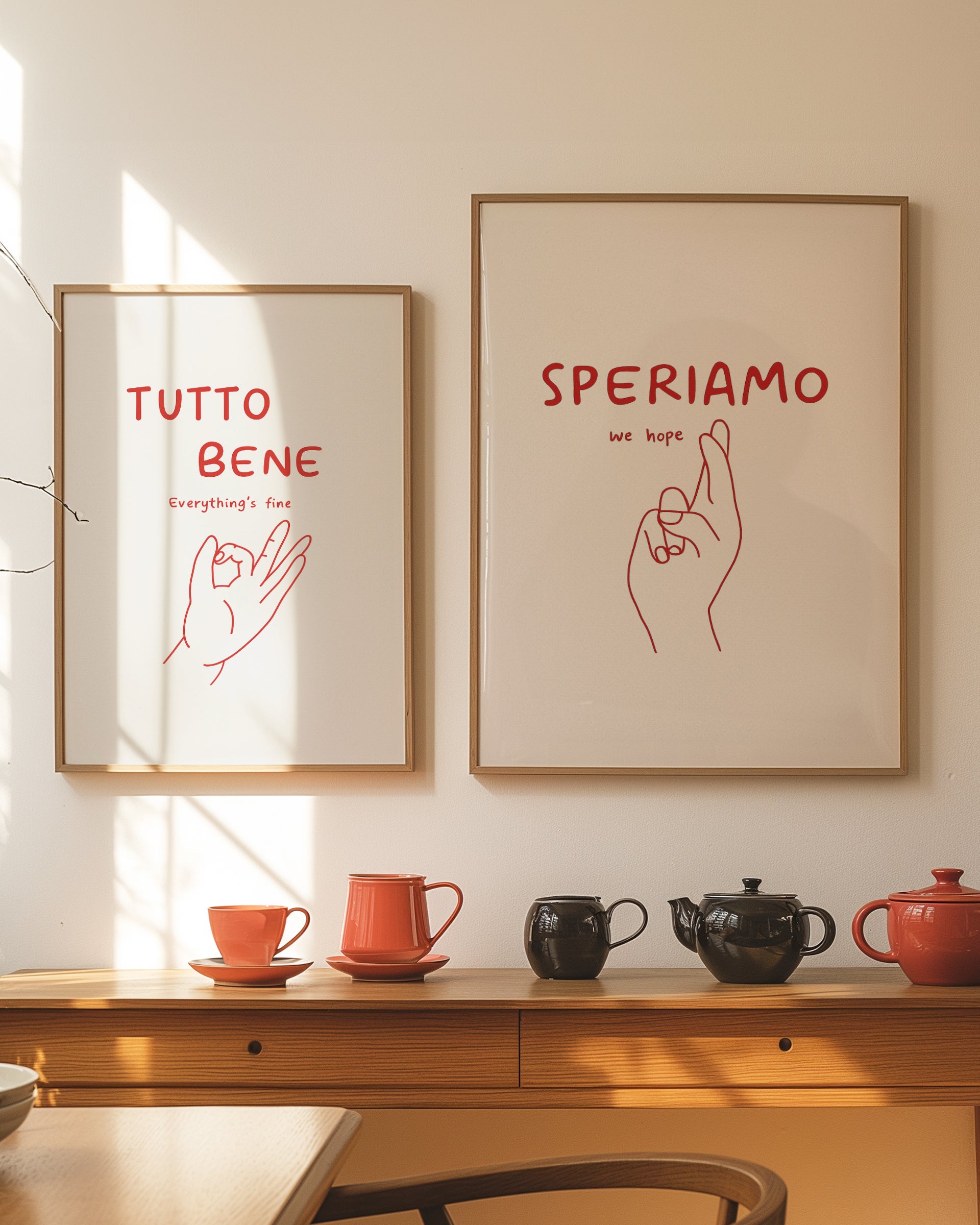 Un gesto universale di speranza, espresso con il calore e l’ironia tipici italiani. Il poster “Speriamo” unisce semplicità grafica e significato profondo, diventando un simbolo di ottimismo quotidiano.