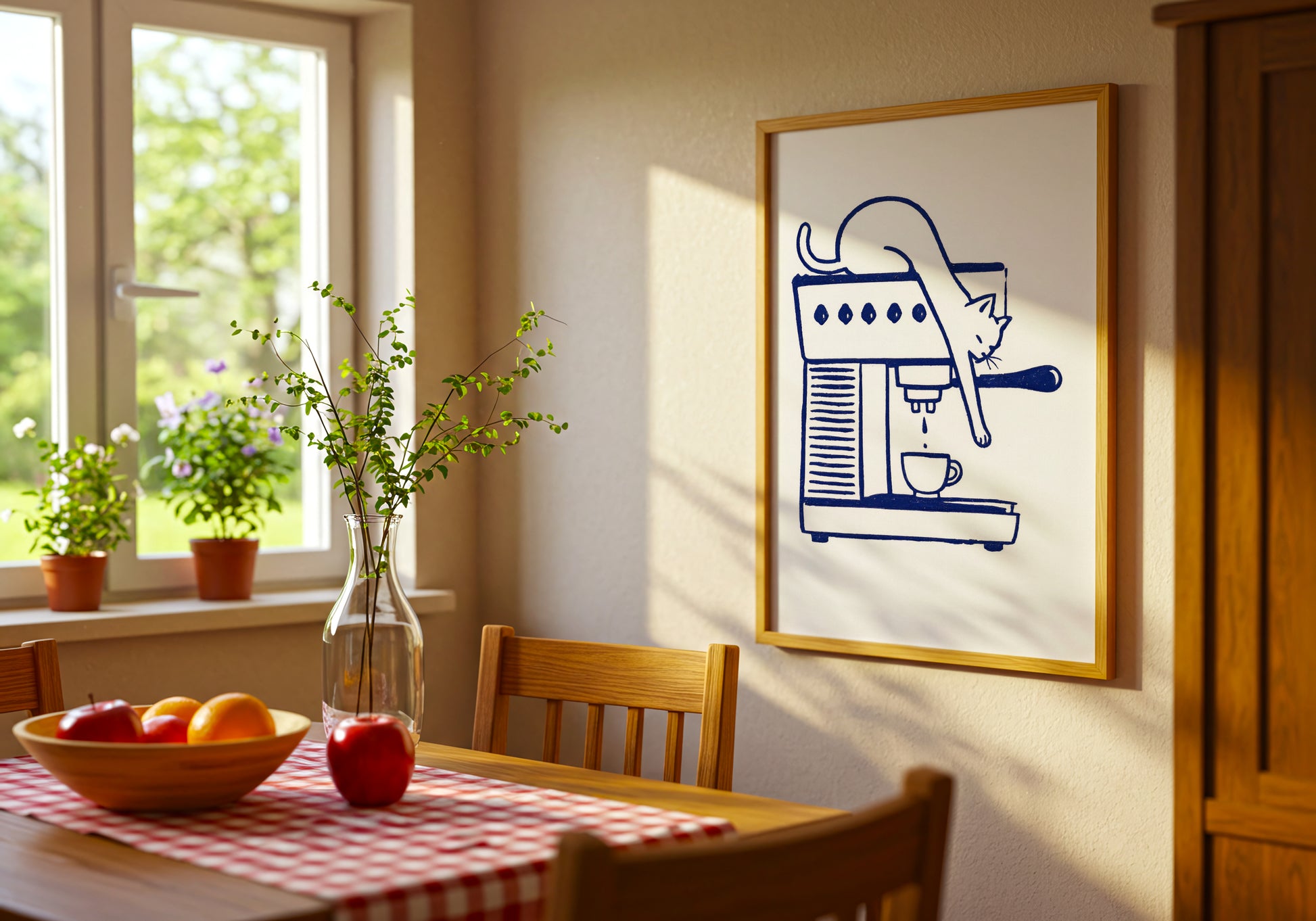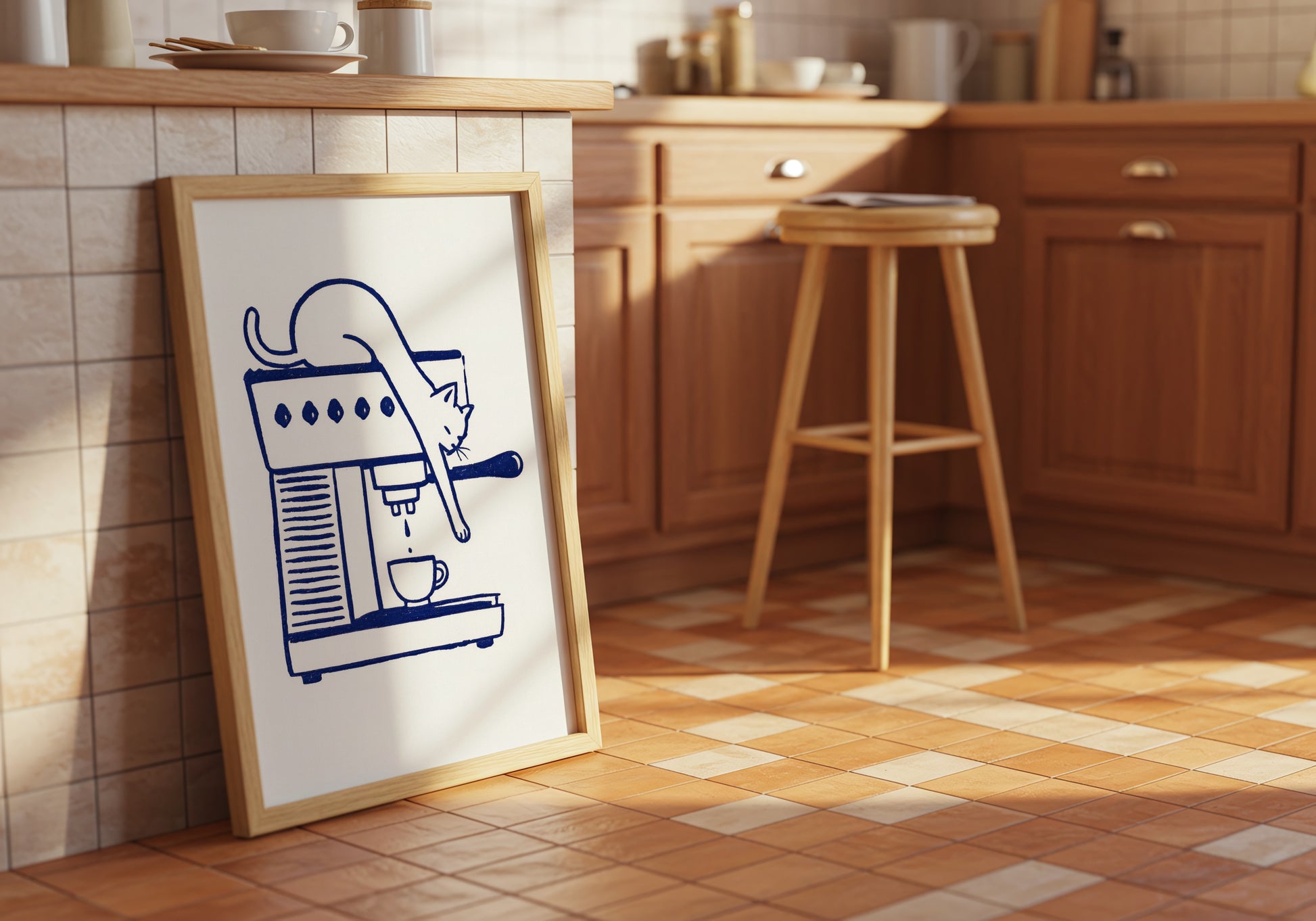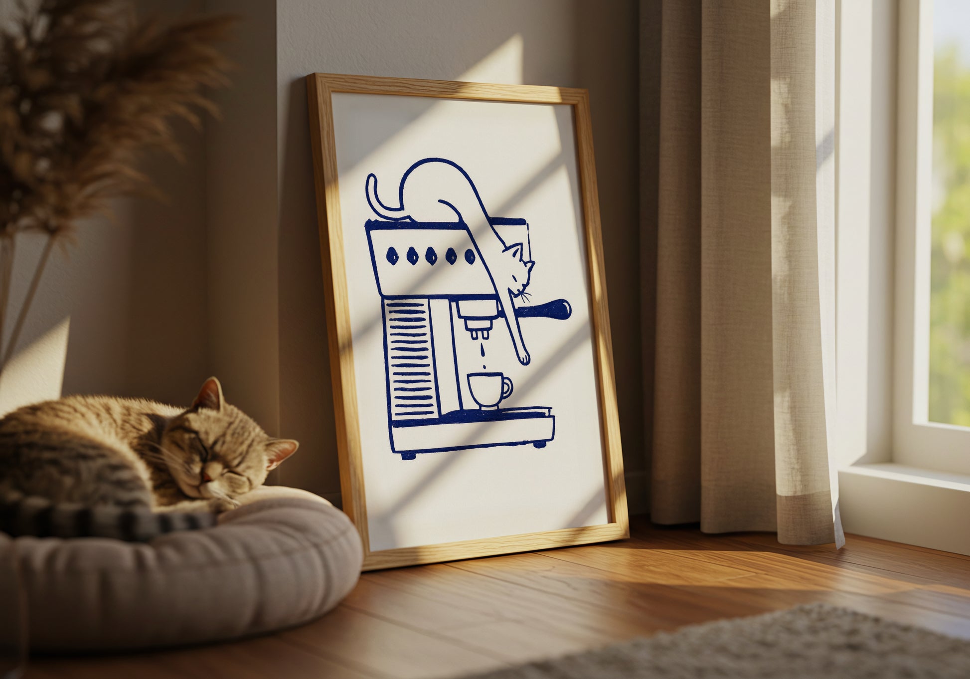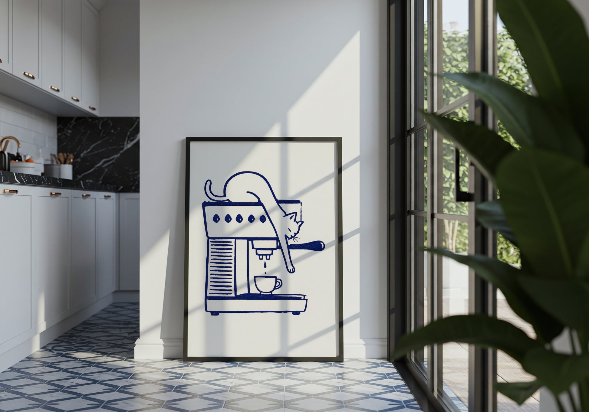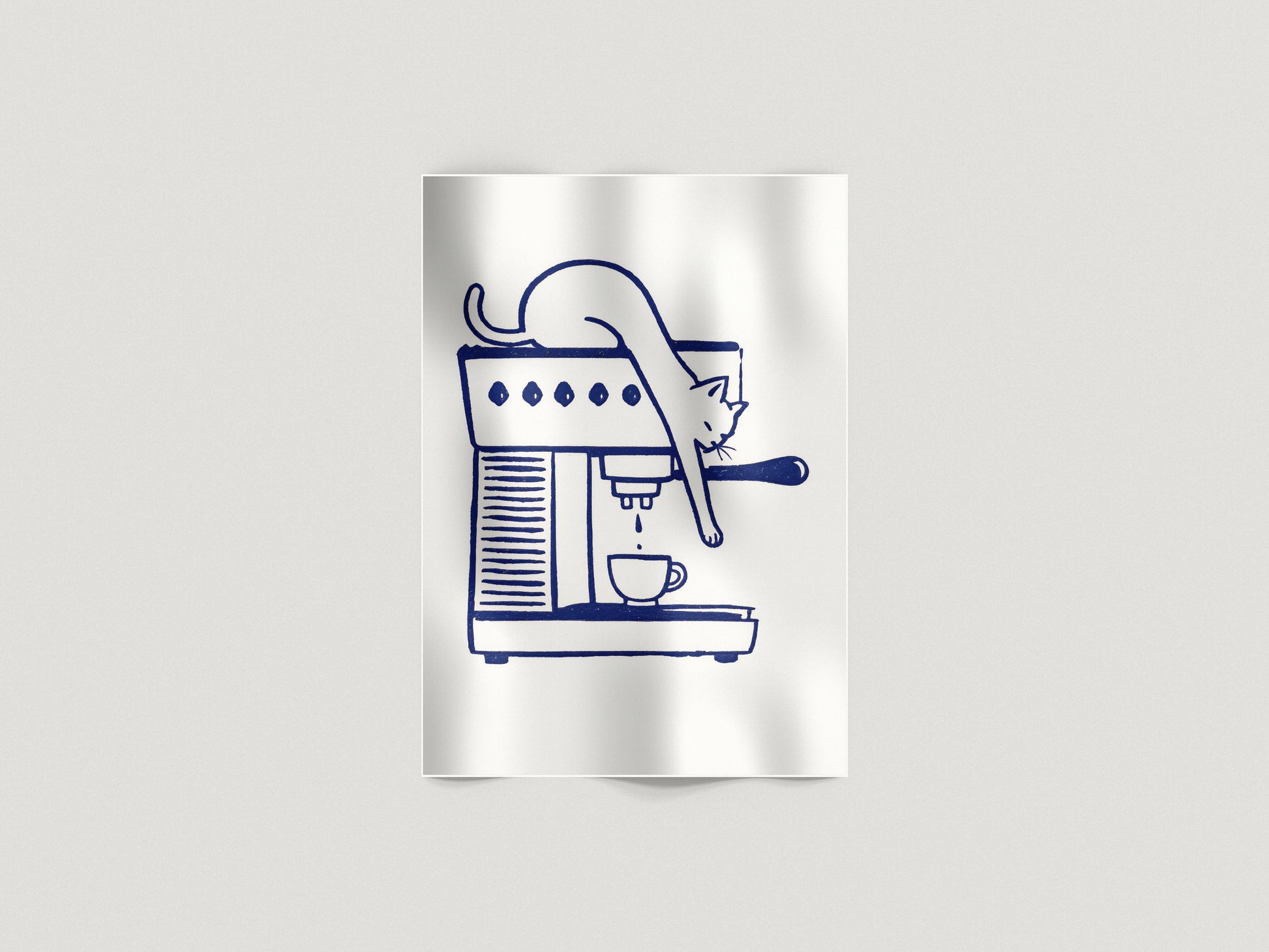 Il poster raffigura un gatto disteso sopra una macchina espresso, con la zampa che penzola proprio sopra la tazzina, mentre le gocce di caffè scendono lentamente. Il tratto semplice, blu e pulito dona alla scena un tocco moderno e giocoso, ideale per cucine, angoli colazione o spazi creativi.