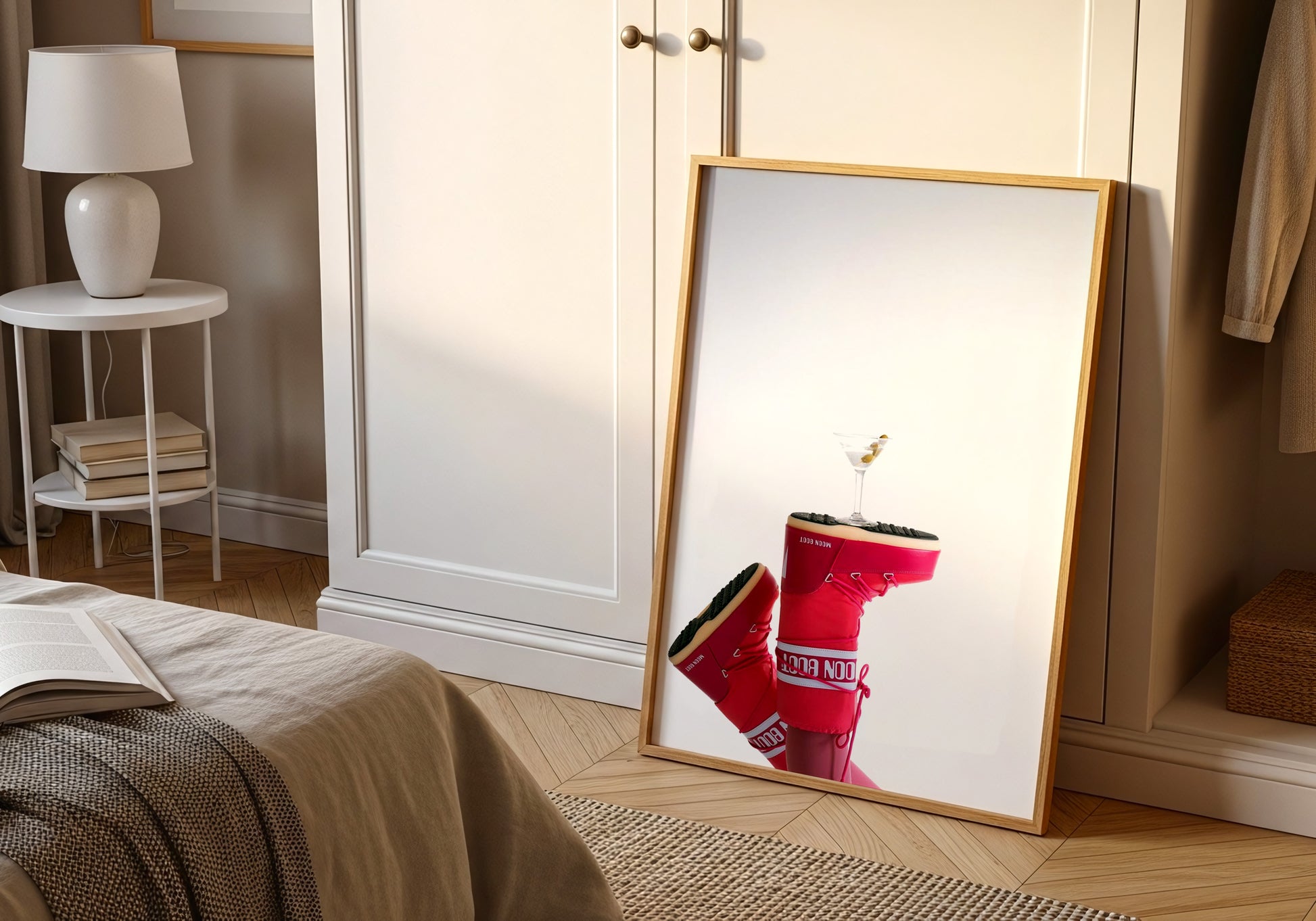 Un poster ironico e sofisticato che unisce moda e leggerezza: un paio di iconici Moon Boots rossi che sorreggono un elegante bicchiere di Martini. Un’immagine pop e moderna, perfetta per ambienti dallo stile contemporaneo, minimal o glamour.