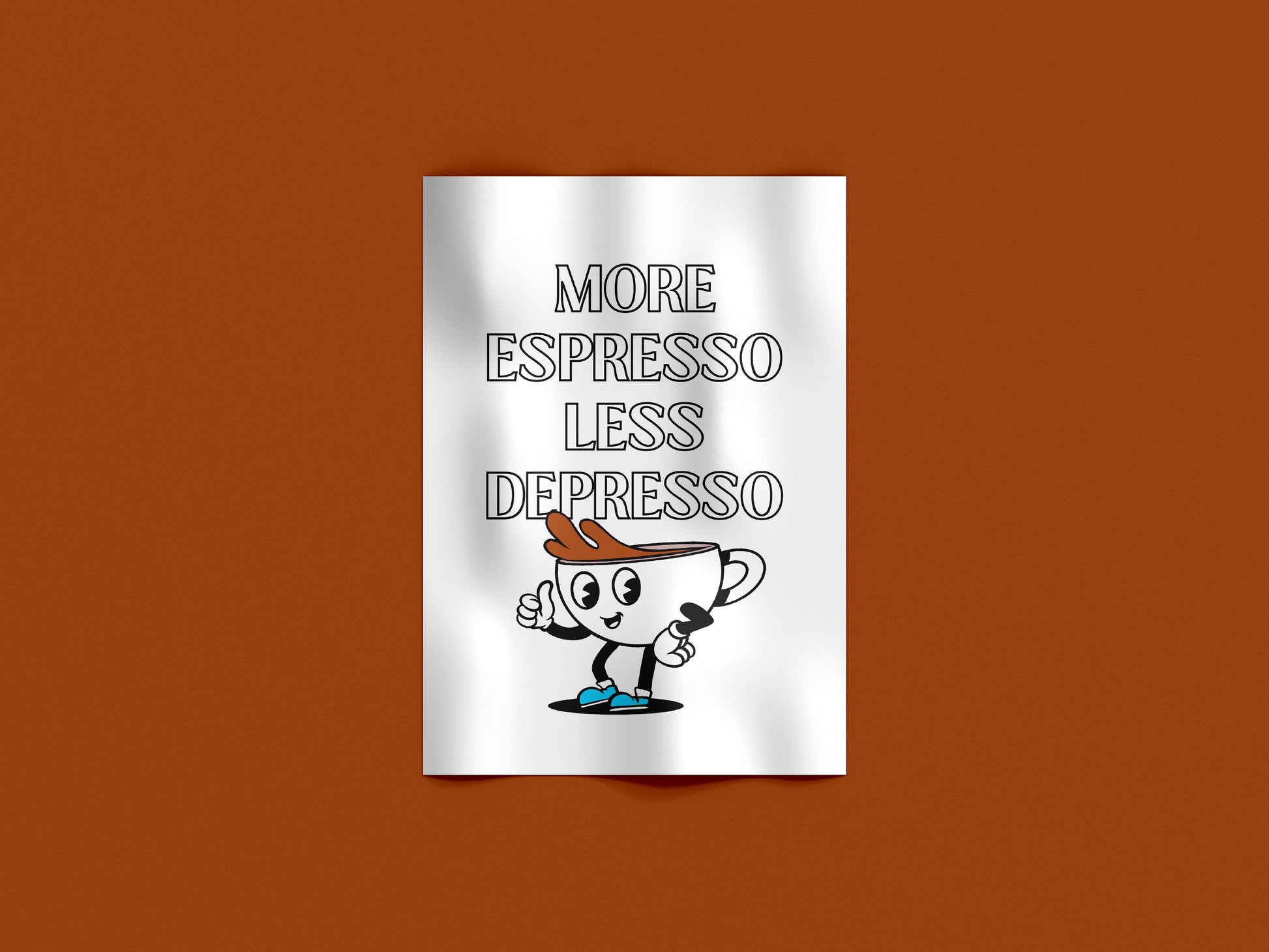 Poster dal tono ironico e vivace con la scritta “More Espresso Less Depresso” e un simpatico personaggio a forma di tazzina. Un design fresco e giocoso che celebra la carica del caffè e la leggerezza del buonumore. Perfetto per decorare cucine, bar o uffici con un tocco di energia positiva.