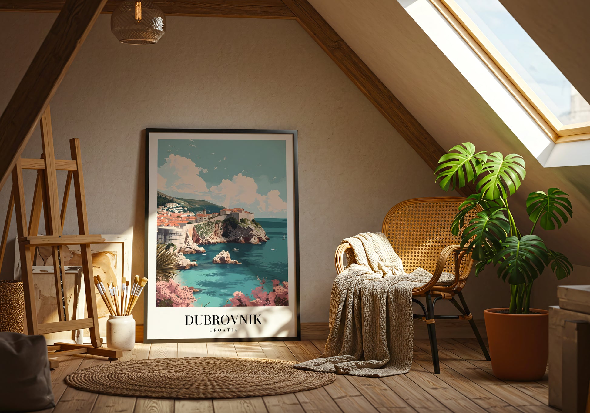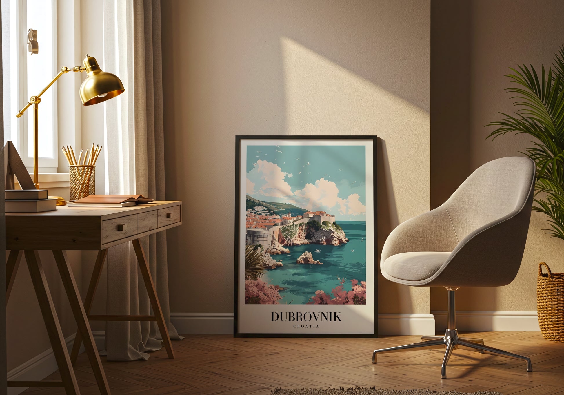 Un poster che cattura l’eleganza senza tempo della “Perla dell’Adriatico”. Le antiche mura medievali abbracciano un promontorio roccioso che si affaccia su un mare turchese e limpido, mentre il cielo terso e la vegetazione in fiore aggiungono un tocco di poesia alla scena.
