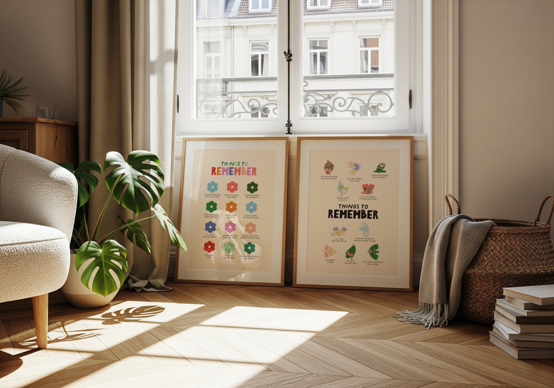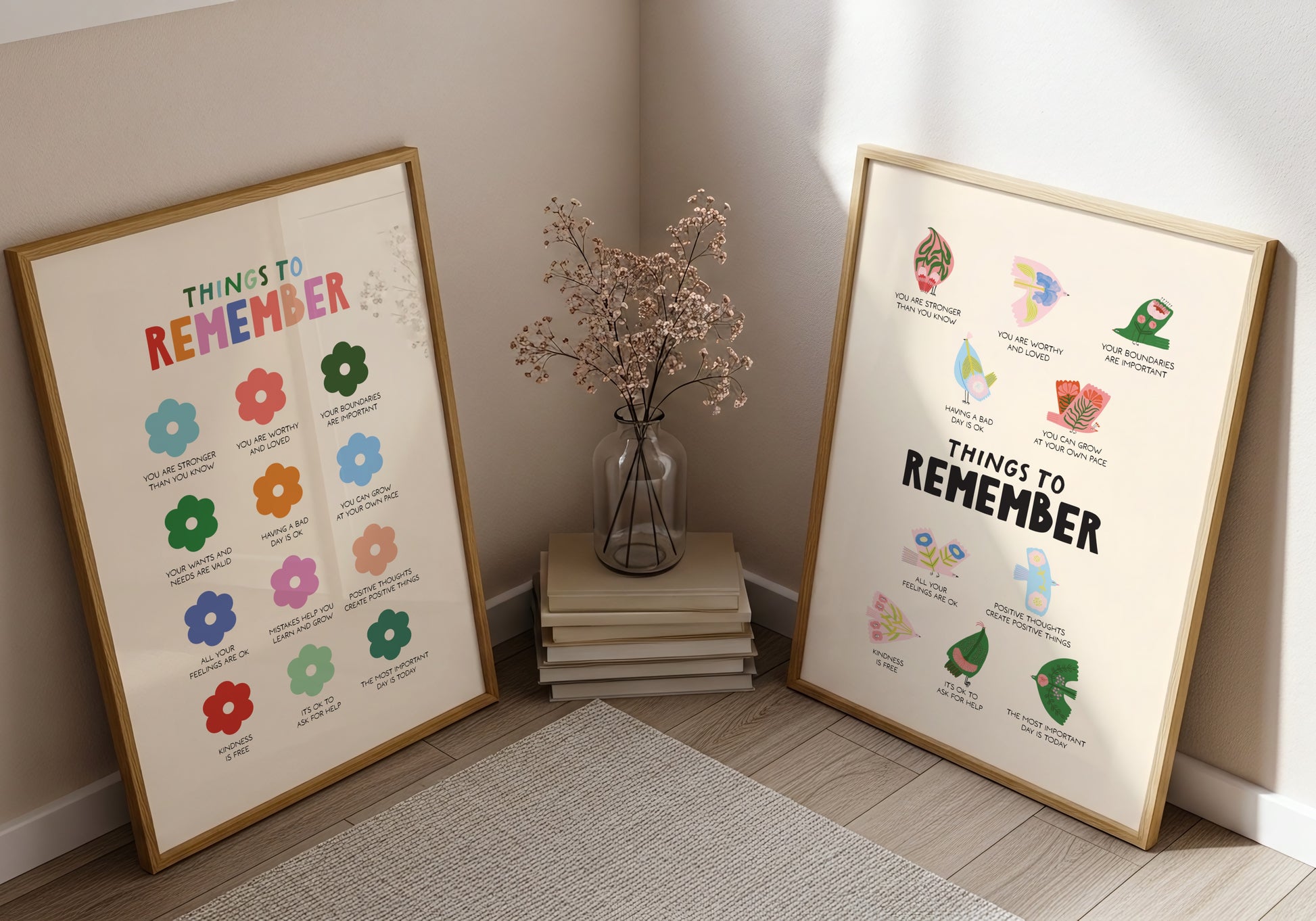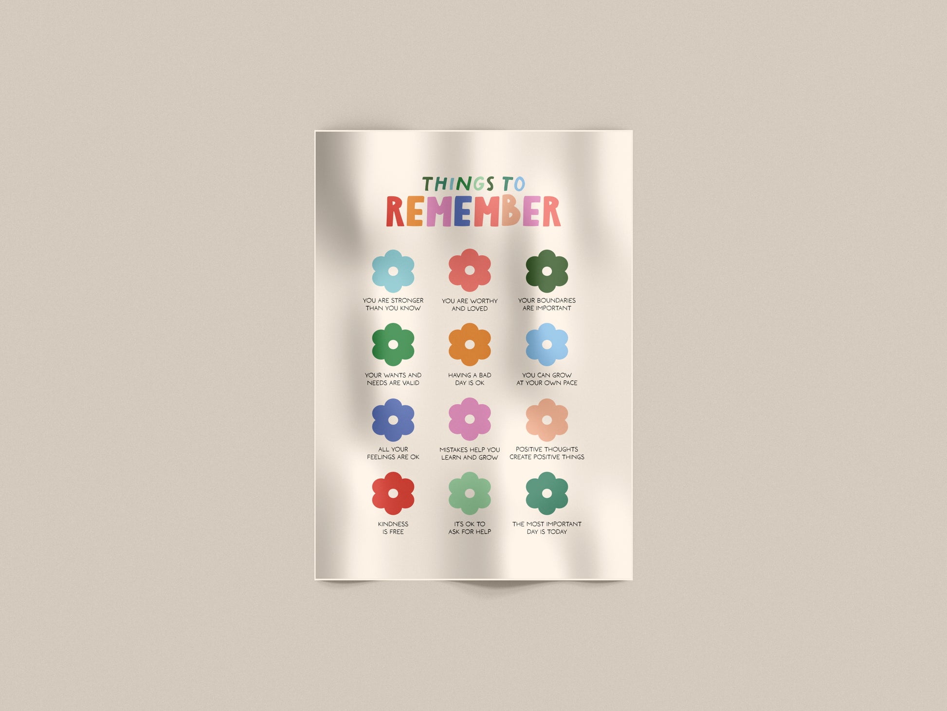 Un poster colorato e positivo che raccoglie dodici piccoli promemoria per il benessere quotidiano.
