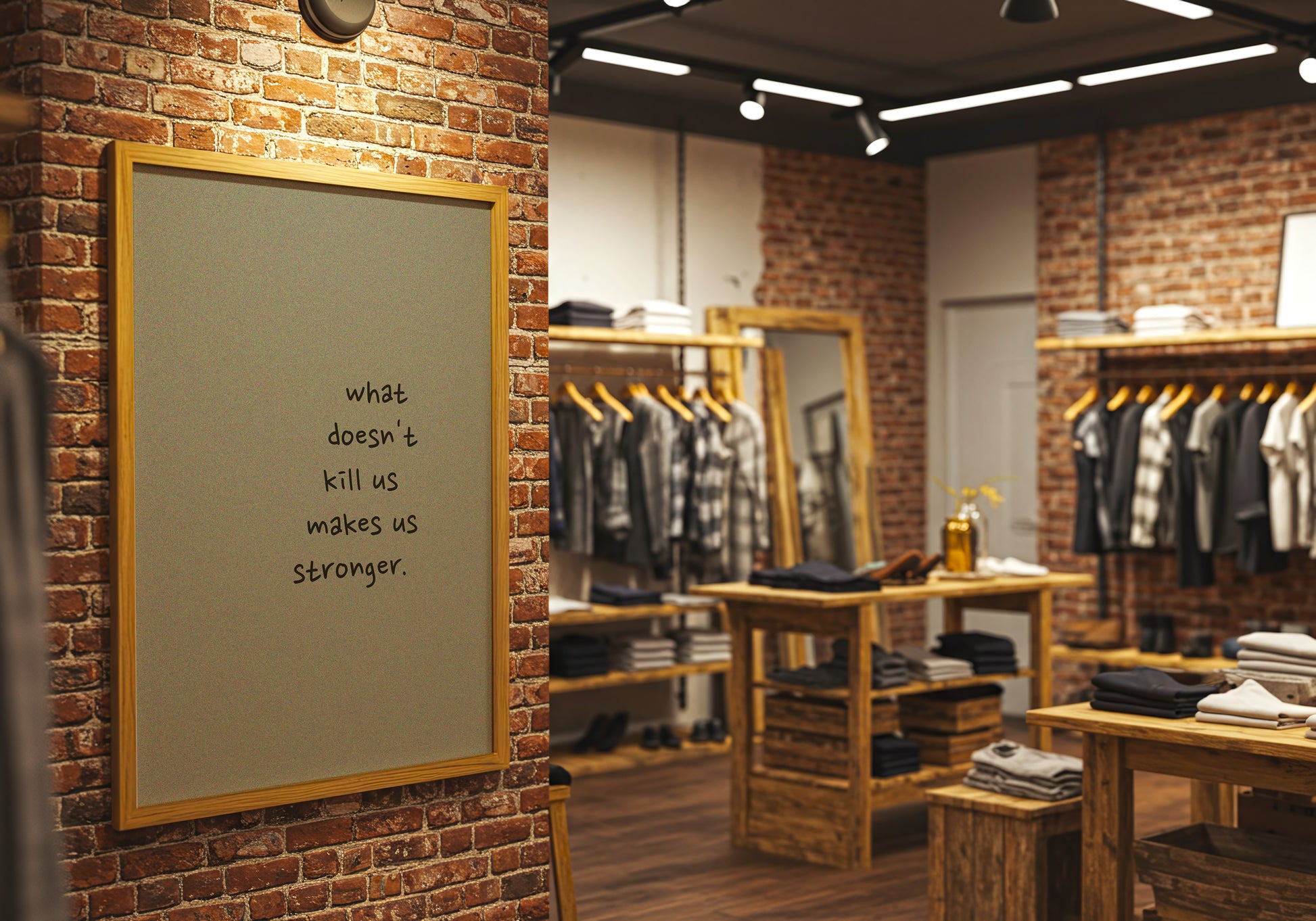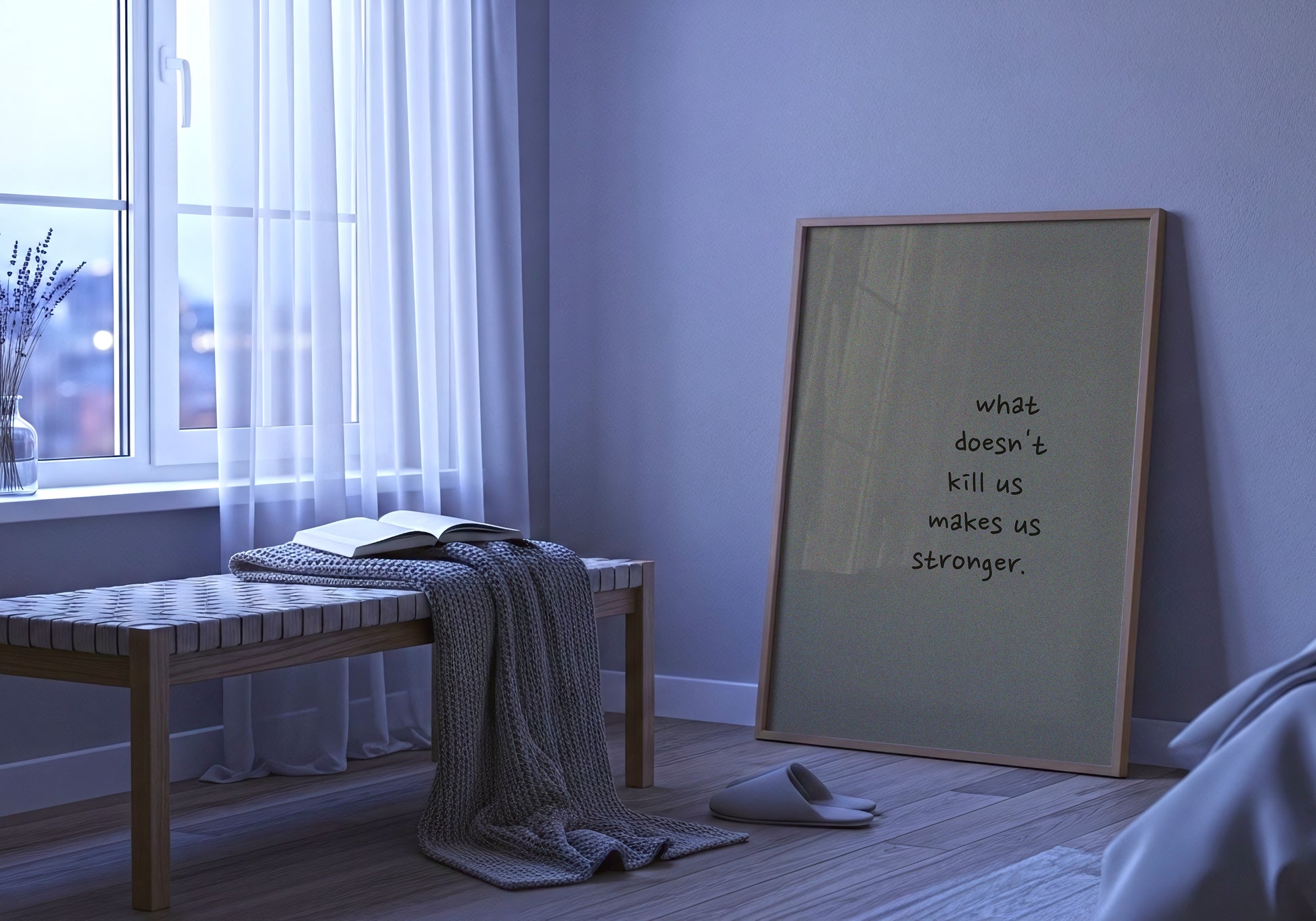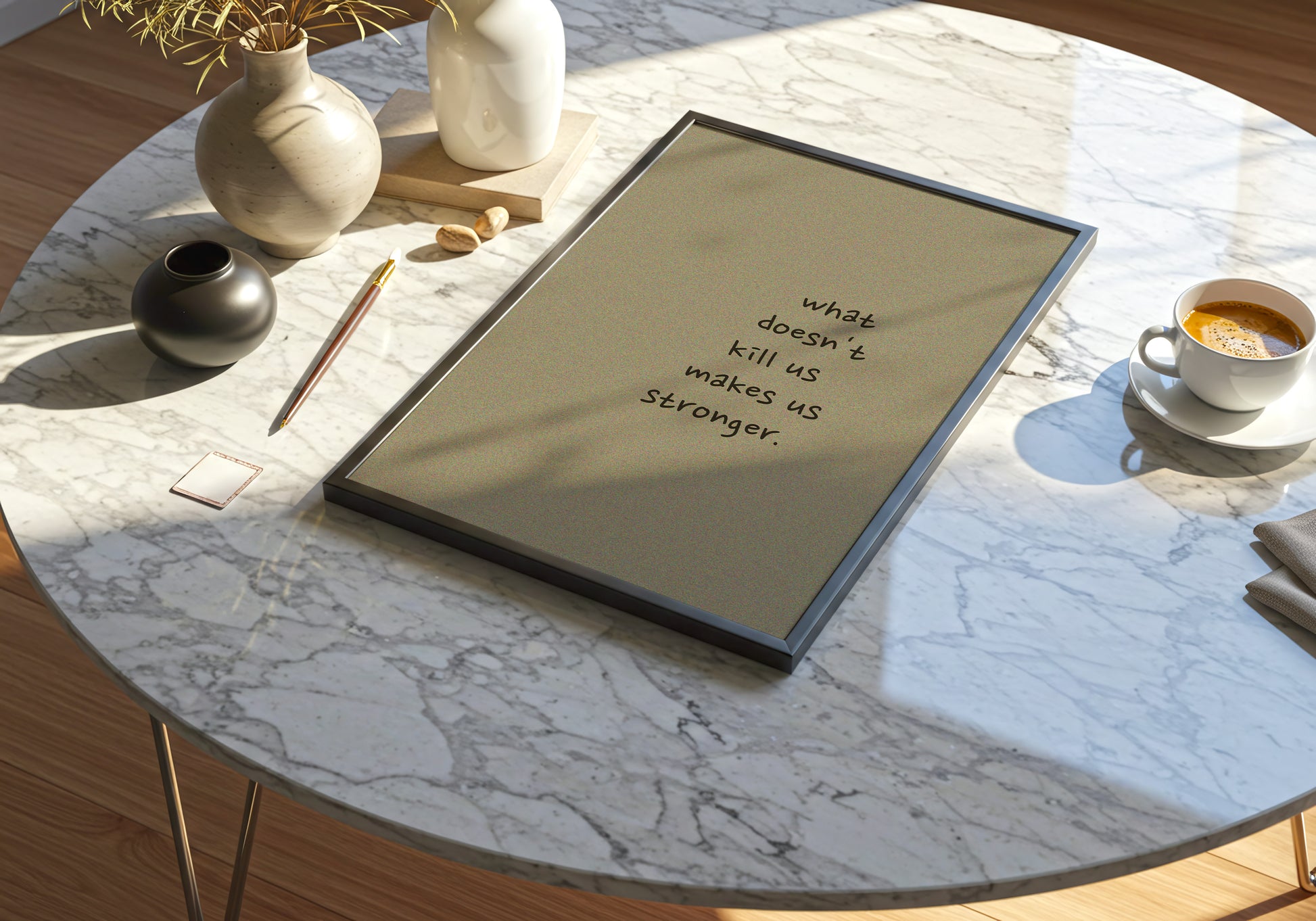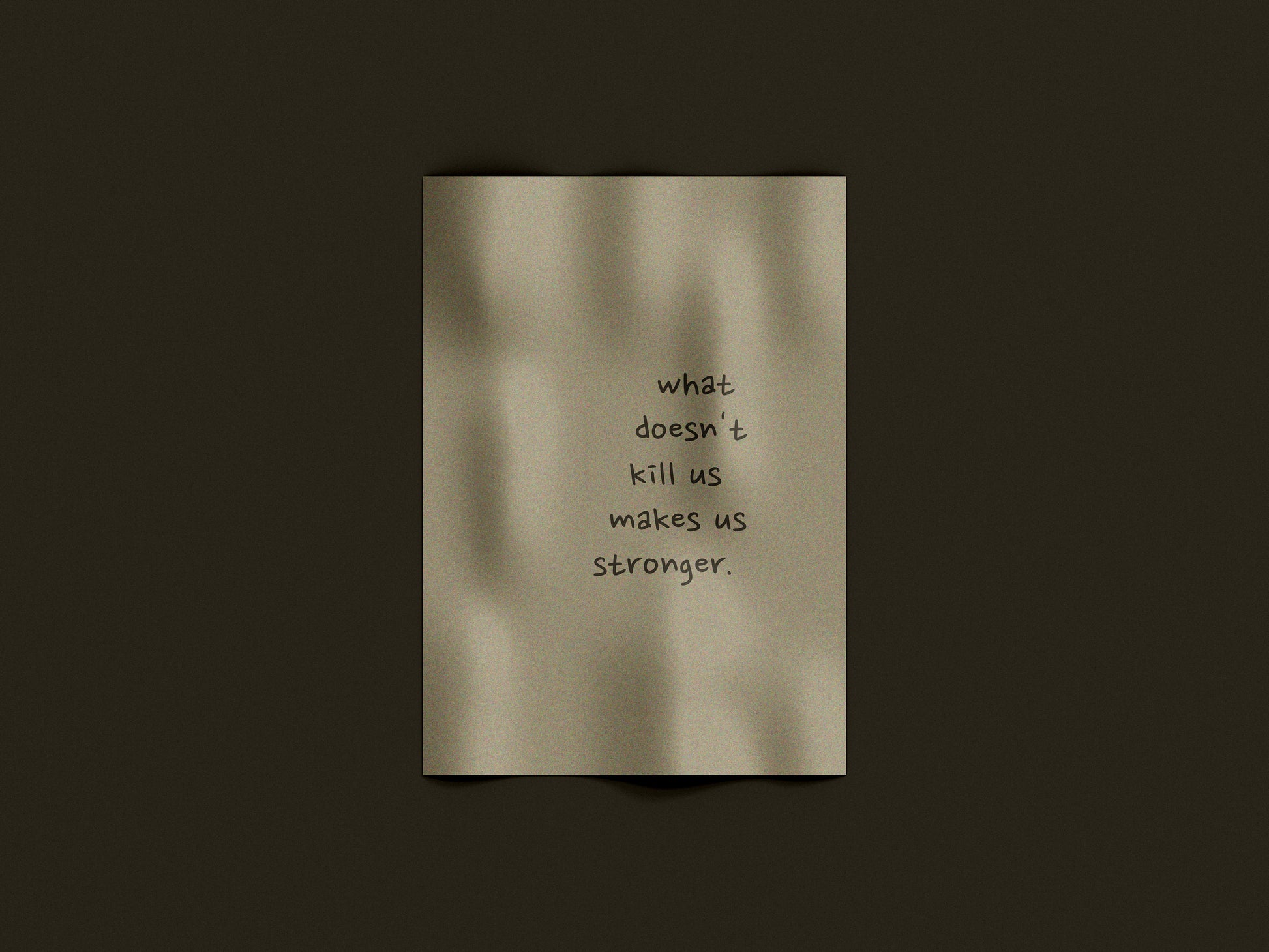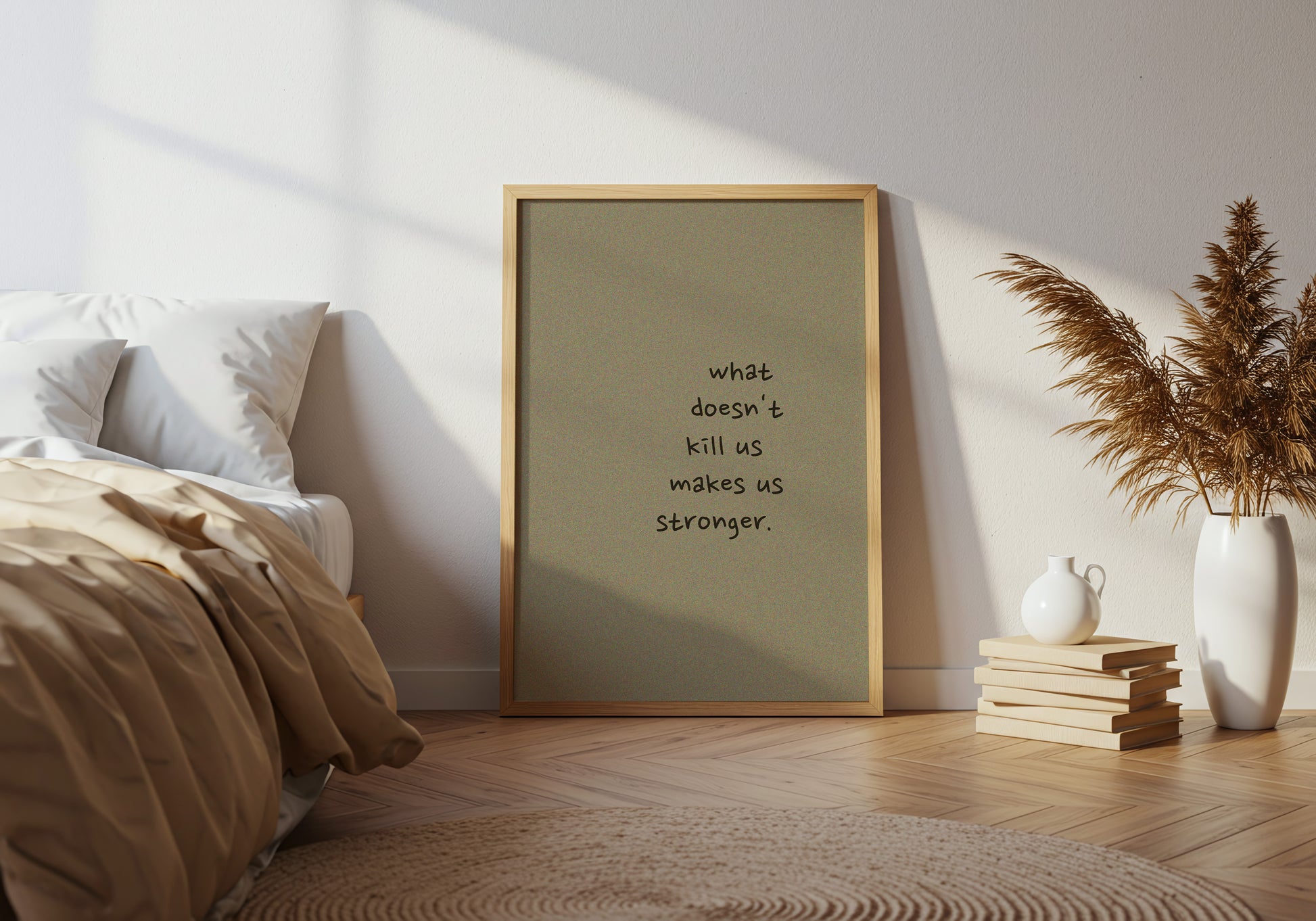 Un poster dal design essenziale che racchiude una delle frasi più potenti di sempre: “What doesn’t kill us makes us stronger.” Perfetto per chi cerca ispirazione, forza e determinazione nelle piccole cose quotidiane. Il font morbido e la palette neutra creano un equilibrio elegante, ideale per spazi moderni o minimalisti.