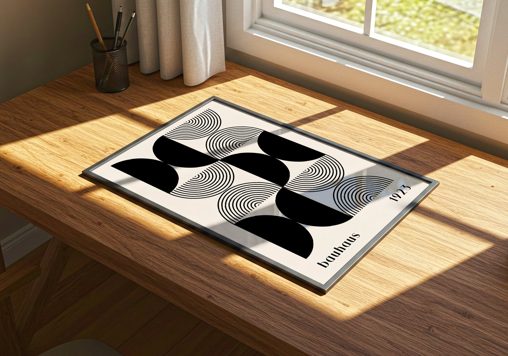 Poster ispirato all’estetica Bauhaus, con un design geometrico che alterna forme circolari e semicircolari in perfetto equilibrio visivo. Il contrasto netto tra bianco e nero richiama la purezza e la razionalità del movimento modernista. Un pezzo di design elegante, ideale per spazi minimal, studi di architettura o ambienti creativi.