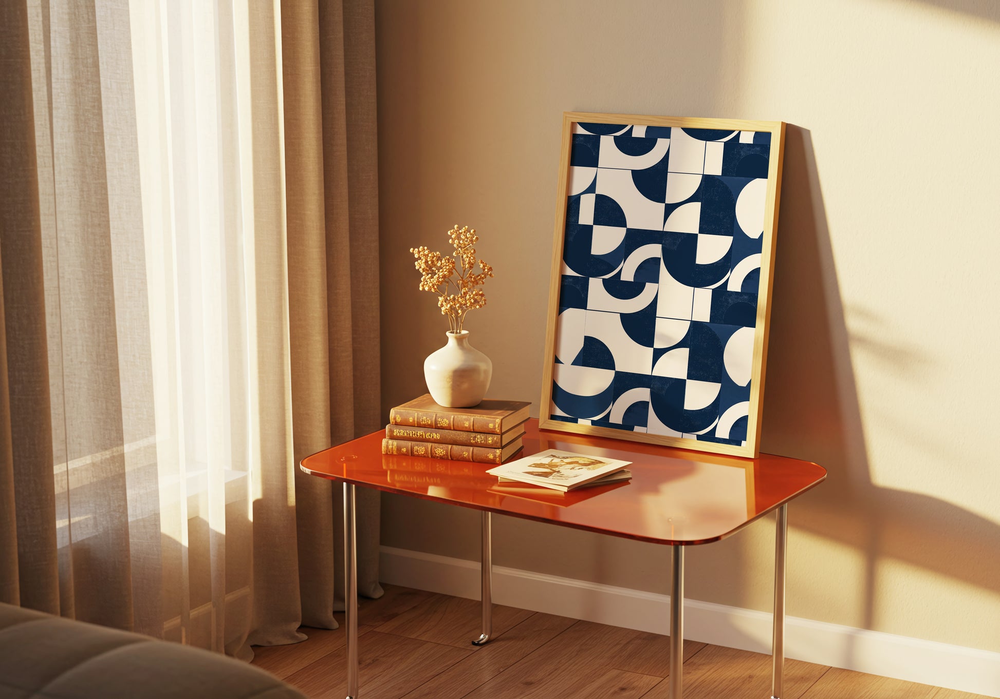 Un poster che gioca con curve, archi e forme modulari per creare un ritmo visivo calmo e ipnotico. Le tonalità blu profondo si alternano al bianco crema in un equilibrio perfetto, dando vita a un design moderno e rilassante. Ideale per ambienti minimal, spazi creativi o angoli dedicati al chill: una composizione che trasforma la geometria in pura atmosfera.