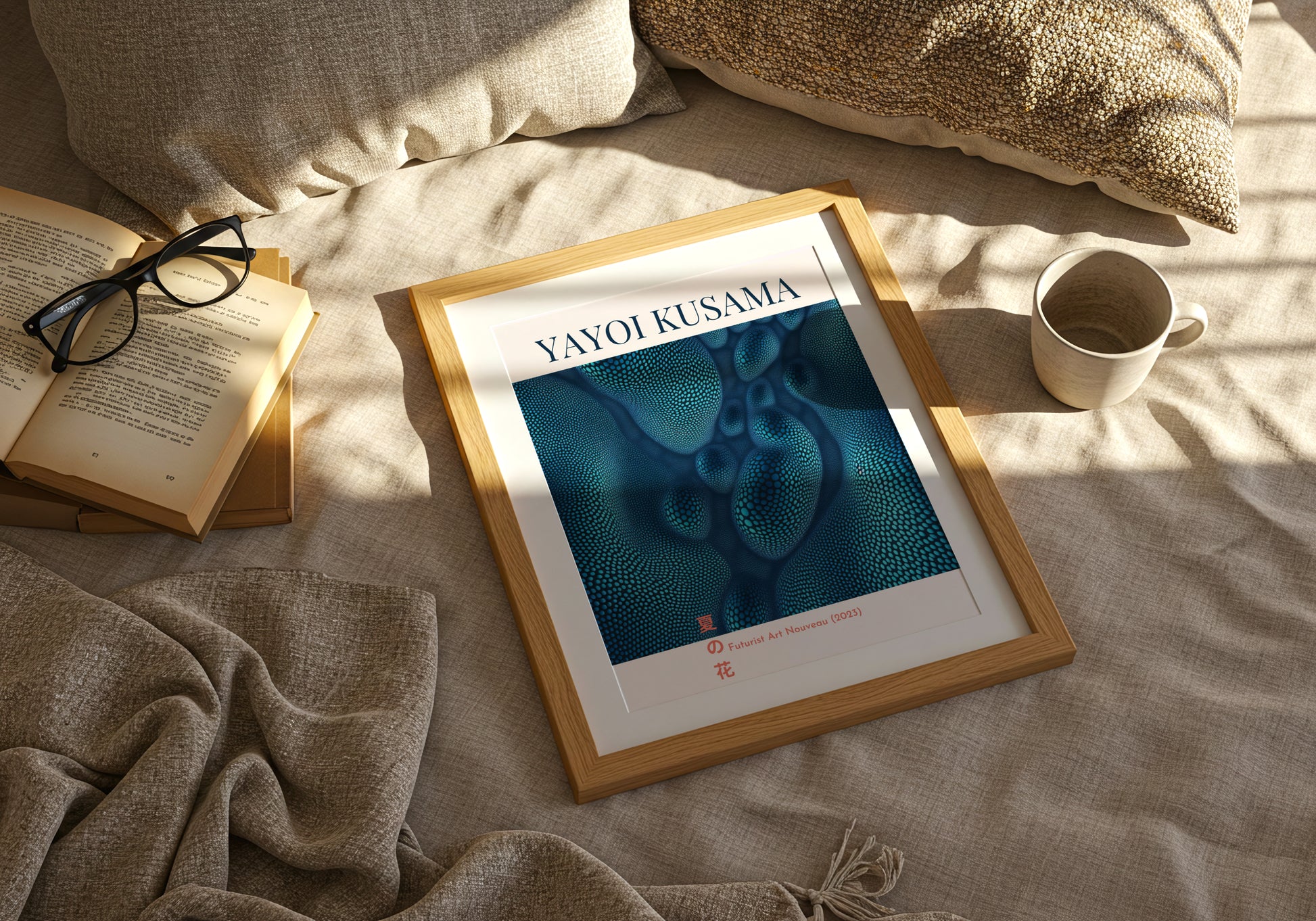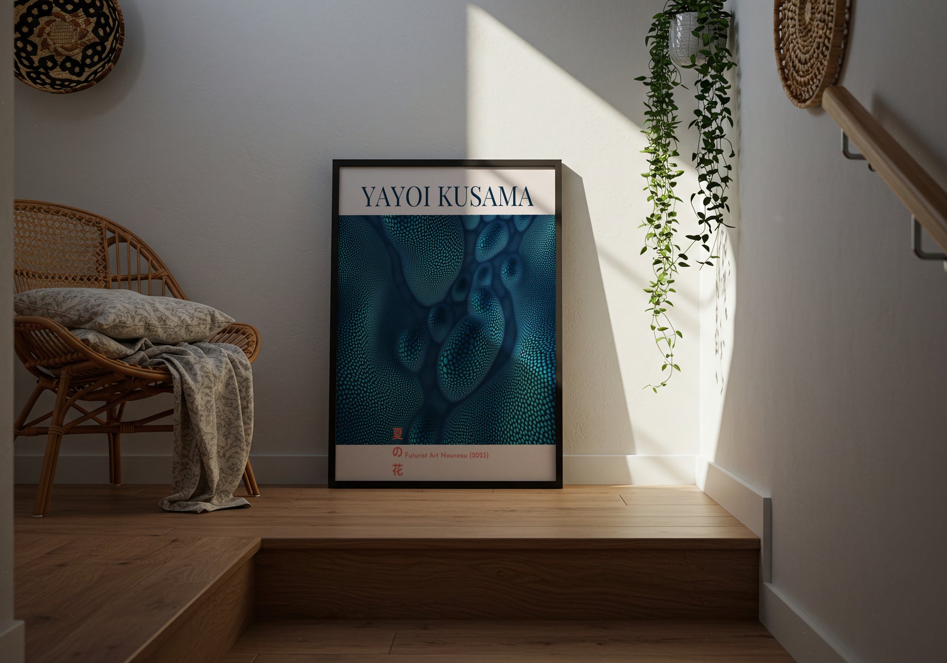 Un poster ispirato all’estetica visionaria di Yayoi Kusama, artista giapponese celebre per le sue composizioni ipnotiche e organiche.