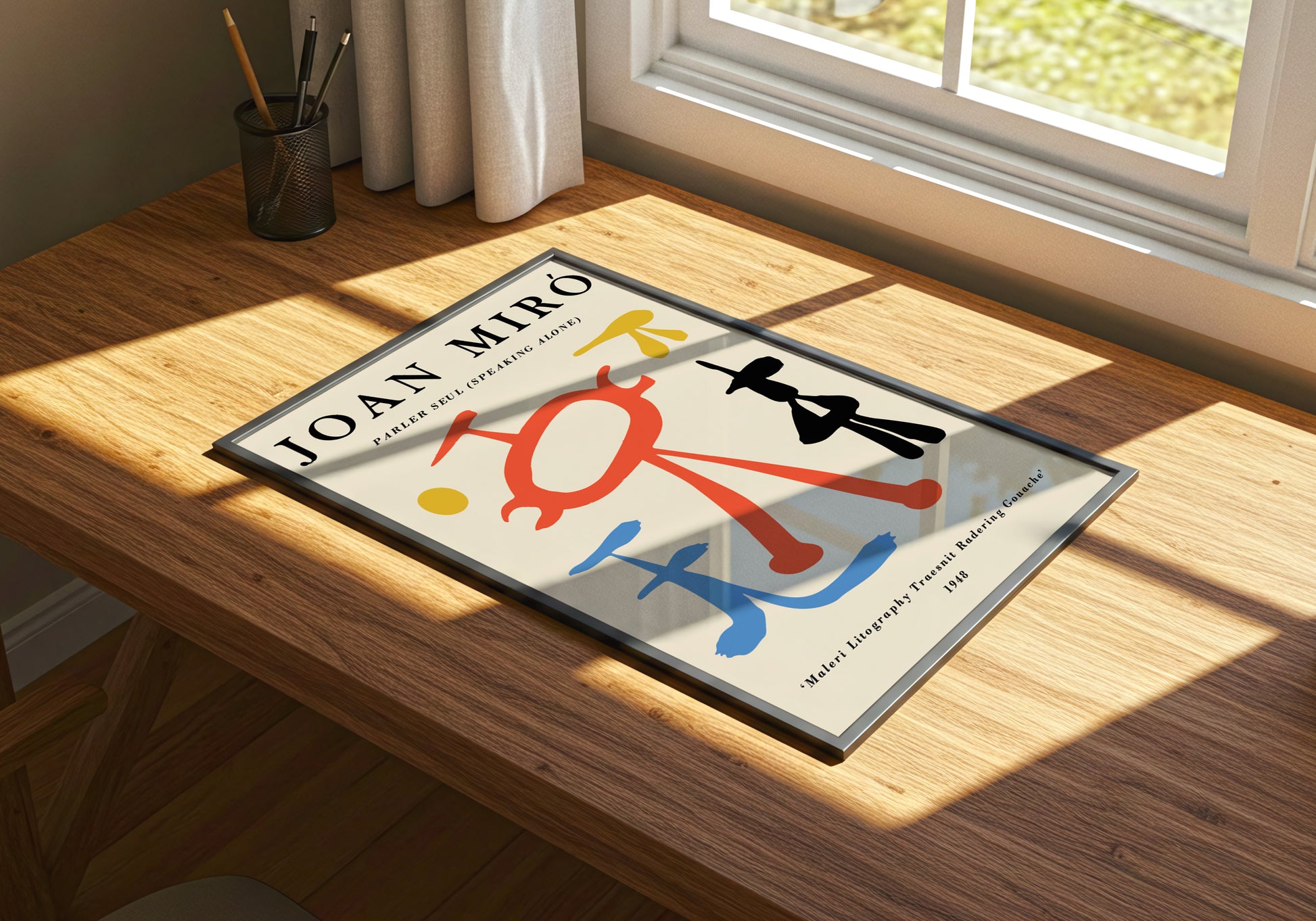 Poster ispirato all’opera “Parler Seul” di Joan Miró, un capolavoro di forme libere e colori vivaci. Le figure astratte in rosso, blu, nero e giallo creano un linguaggio visivo poetico e surreale, tipico dell’artista catalano. Ideale per aggiungere un tocco di arte moderna e originalità a qualsiasi ambiente.