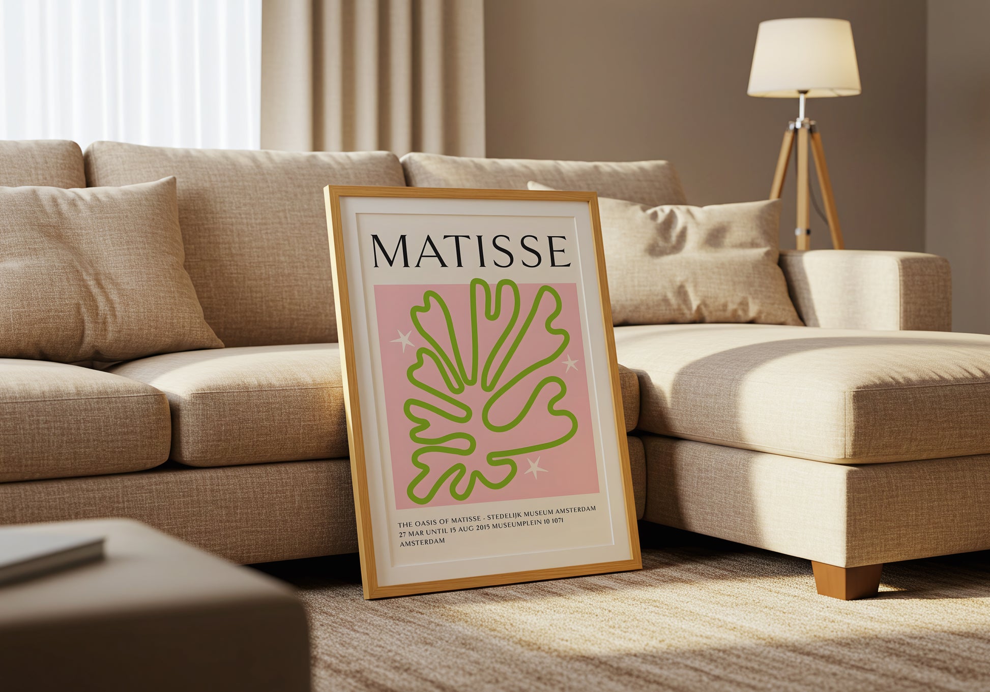 Poster luminoso e delicato ispirato all’estetica espositiva dei grandi musei moderni. Il disegno verde, morbido e organico, risalta su uno sfondo rosa tenue creando un contrasto fresco e armonioso. Gli elementi grafici e la composizione pulita evocano un’atmosfera rilassante, perfetta per ambienti minimal, creativi o dallo stile contemporaneo.