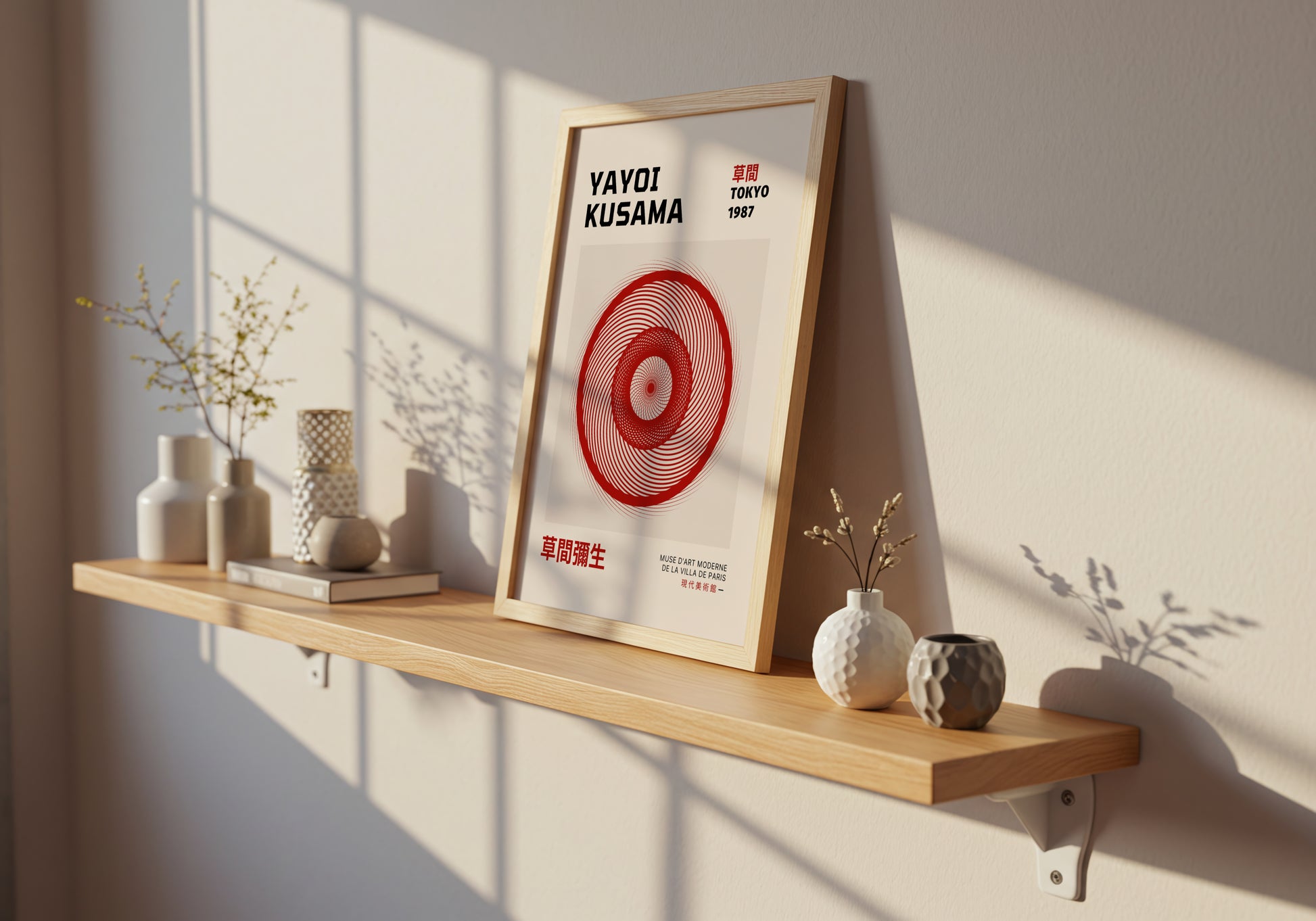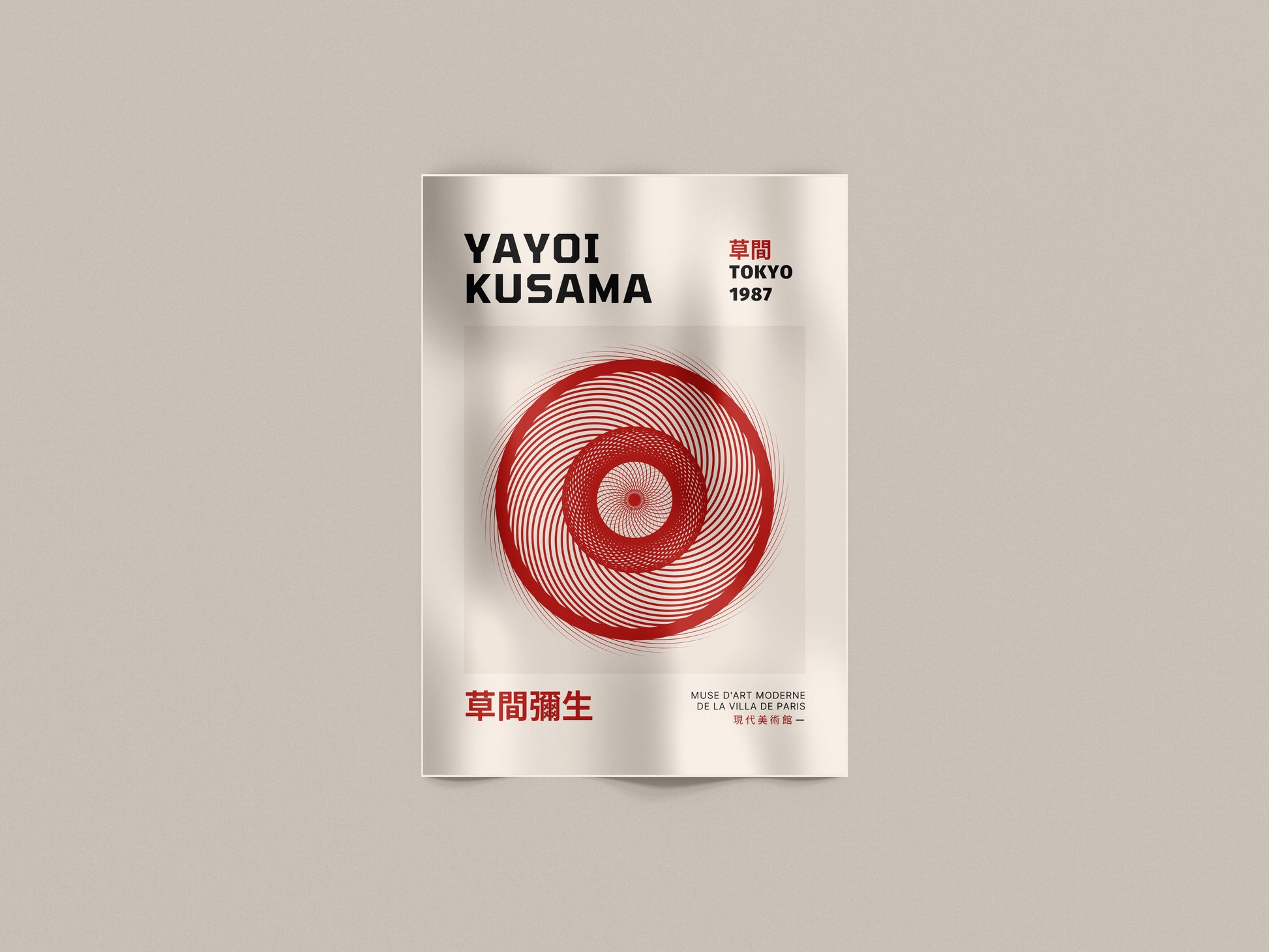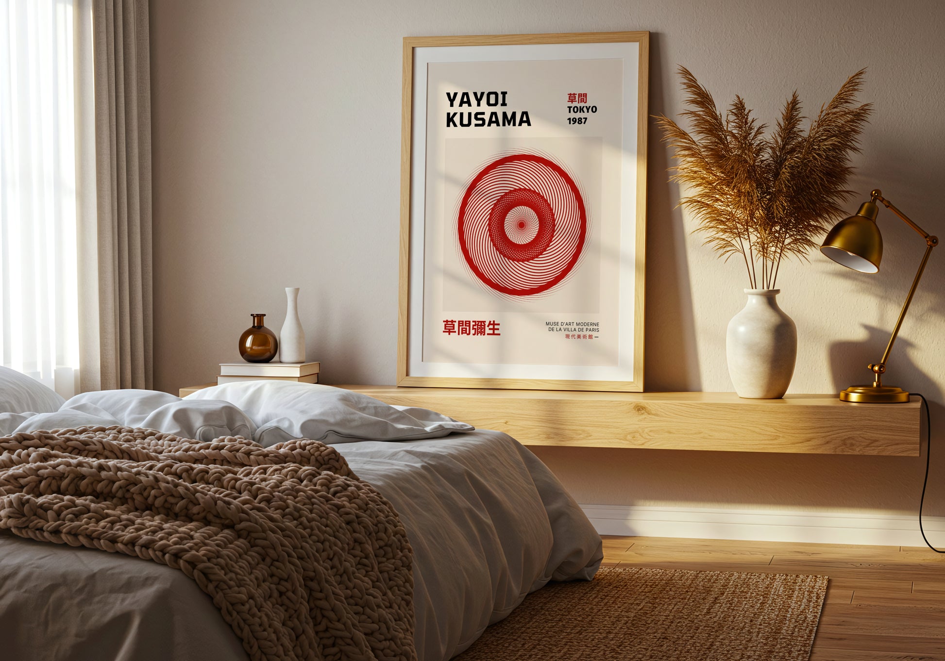 Un iconico poster ispirato all’arte di Yayoi Kusama, dominato da un vortice di linee rosse concentriche che catturano lo sguardo e creano un senso di movimento ipnotico. L’opera rappresenta la perfetta fusione tra equilibrio geometrico e intensità visiva, tipica dello stile di Kusama.