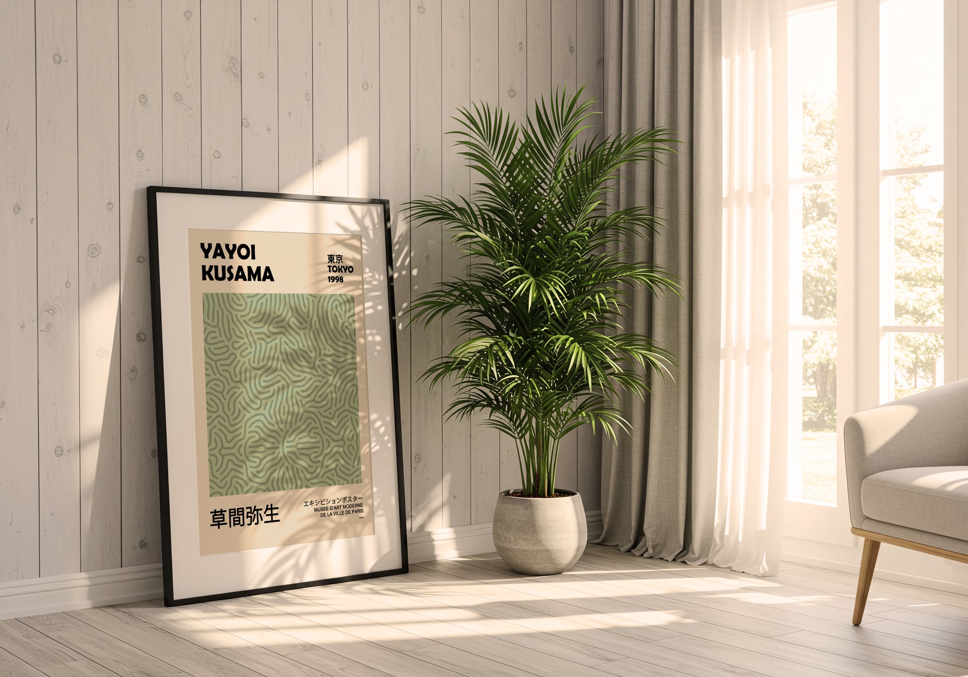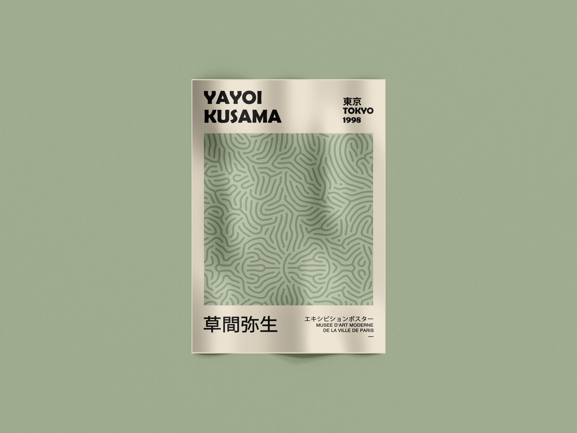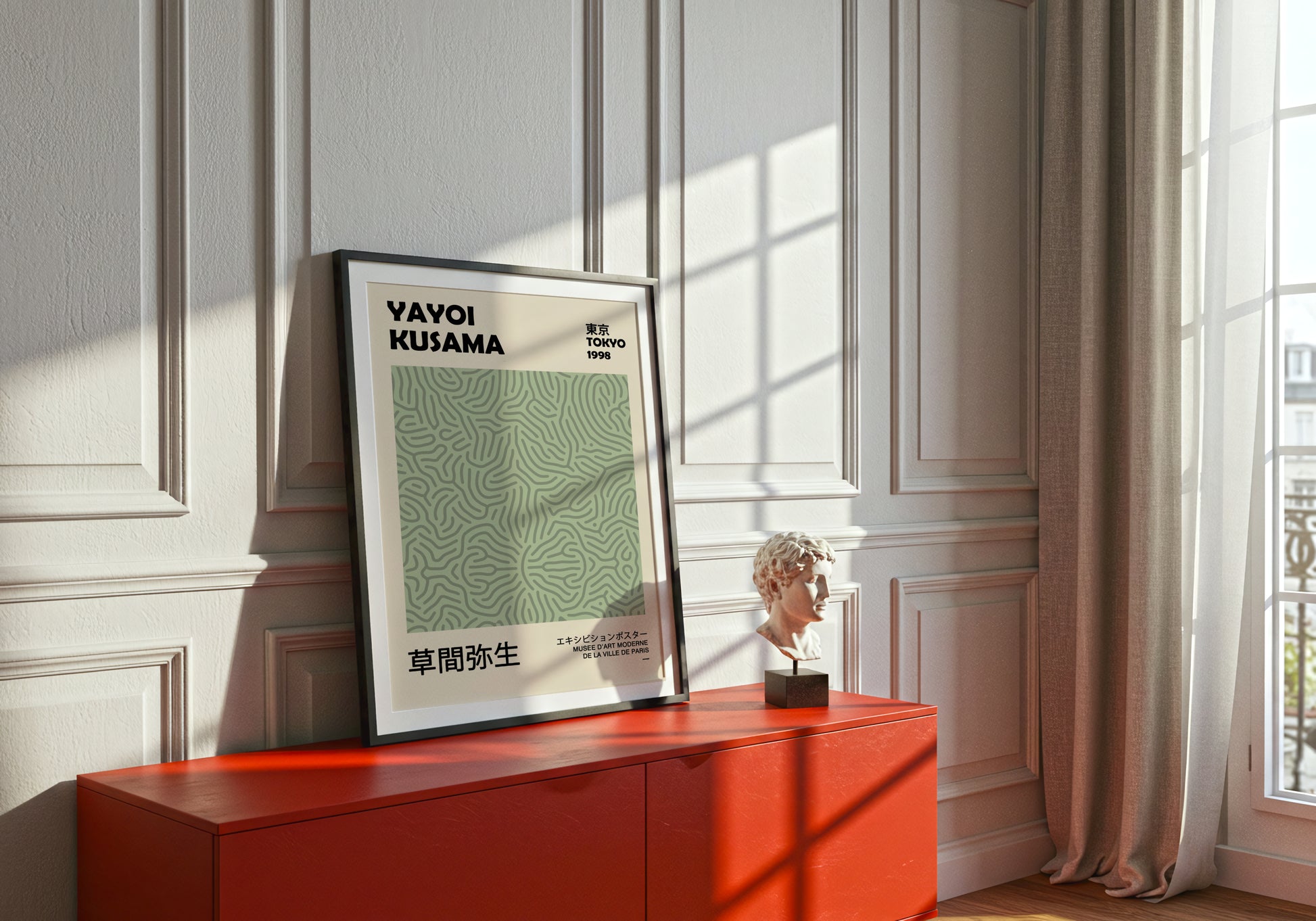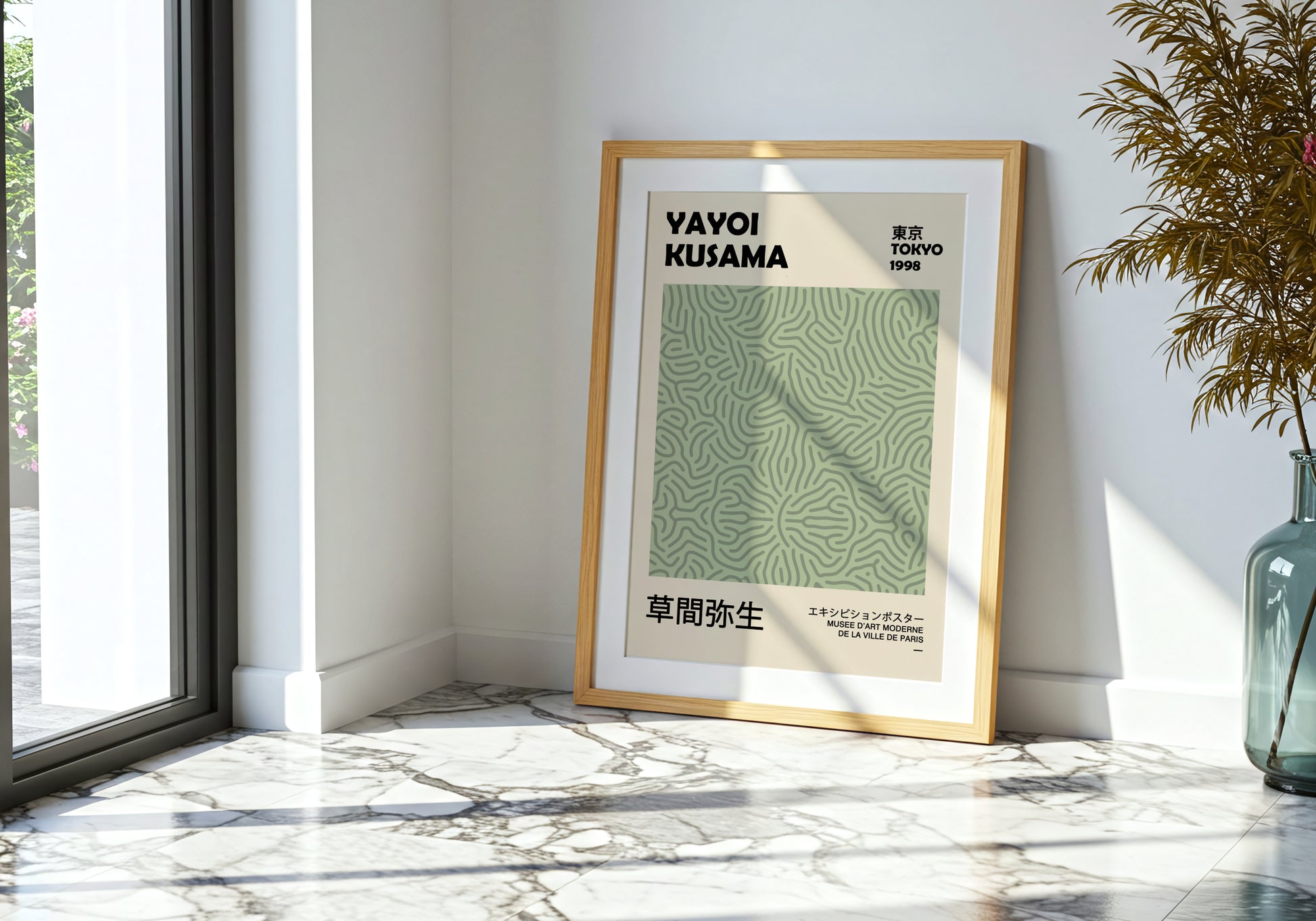 Un raffinato omaggio all’arte ipnotica di Yayoi Kusama. Il poster presenta un motivo organico verde salvia, caratterizzato da linee fluide e sinuose che si intrecciano in un labirinto visivo tipico dello stile dell’artista giapponese.
