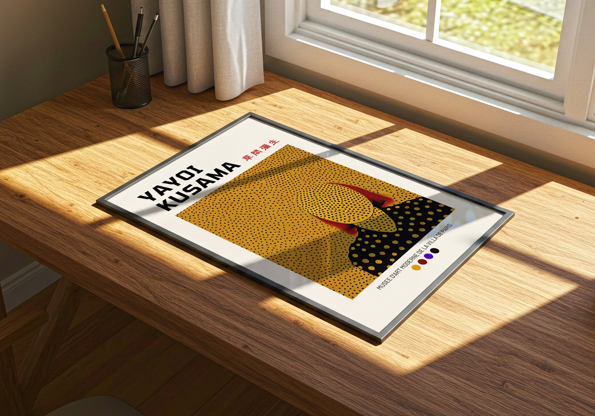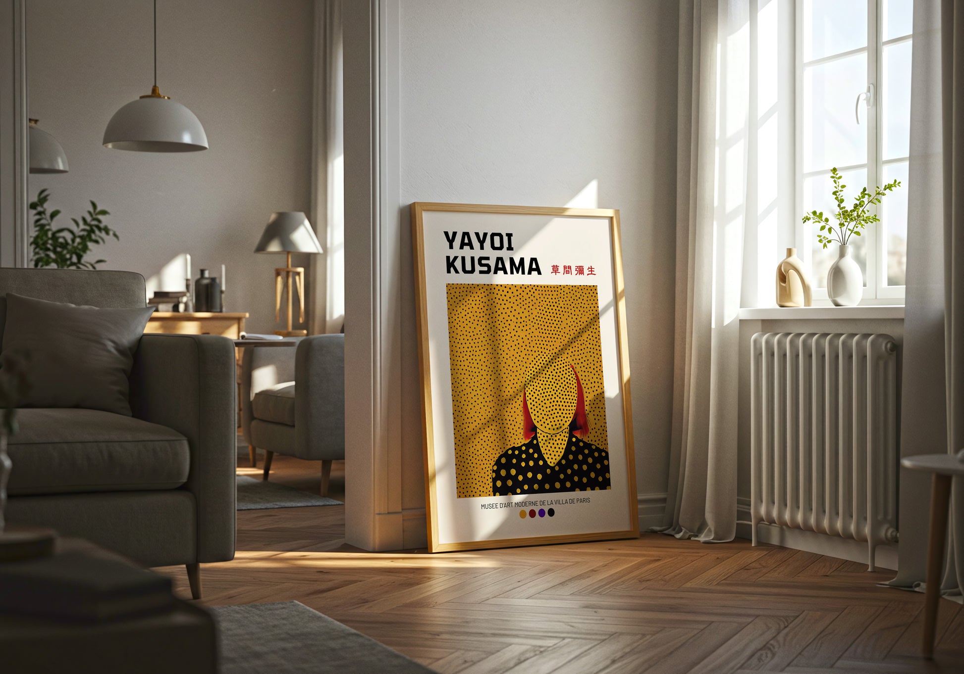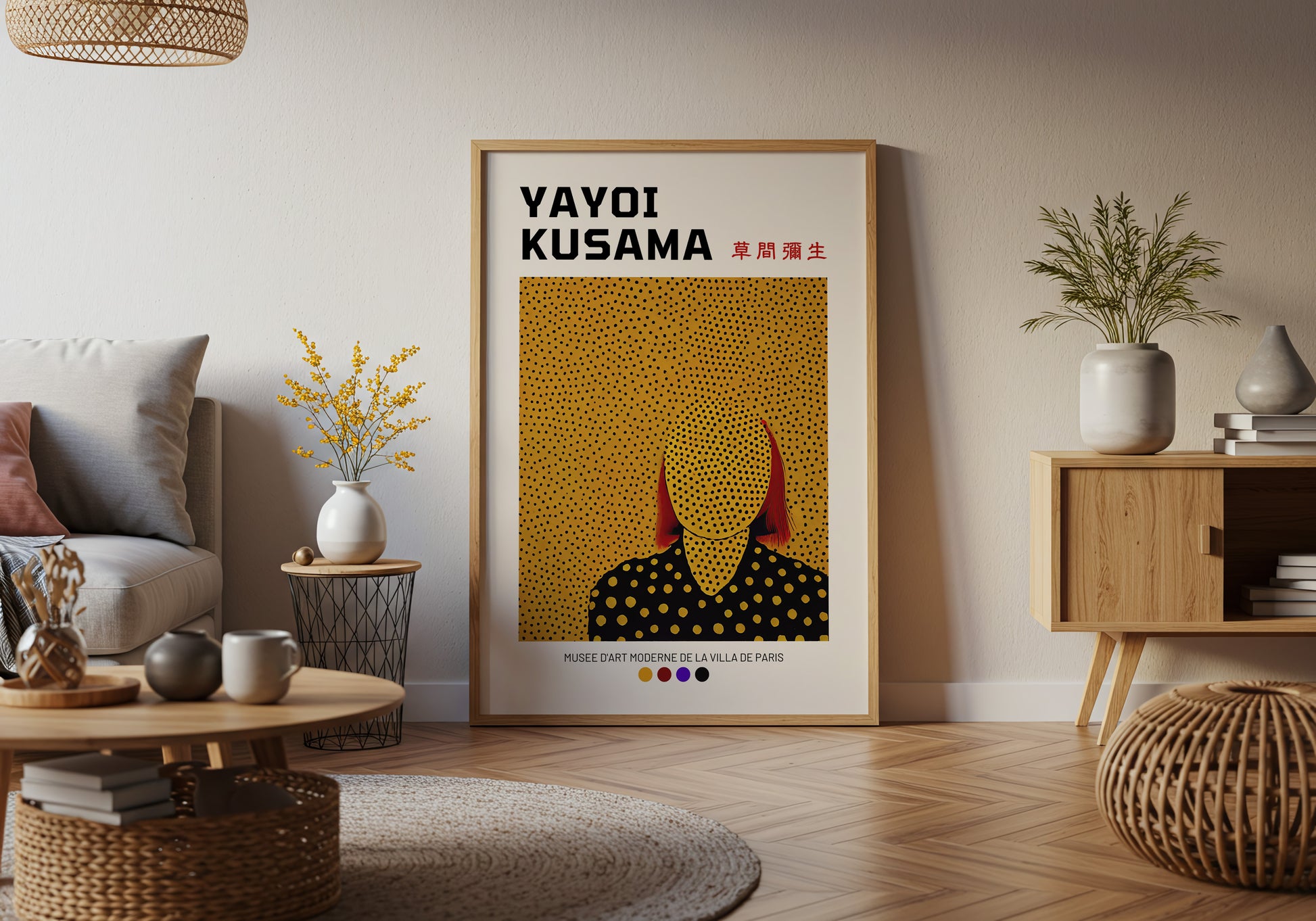 Poster ispirato alla straordinaria arte di Yayoi Kusama, con una composizione che unisce i suoi iconici pois e una figura stilizzata in toni caldi e vibranti. Un omaggio all’artista giapponese e alla mostra tenutasi al Musée d’Art Moderne de la Ville de Paris. Perfetto per aggiungere un tocco contemporaneo e raffinato ai tuoi spazi.