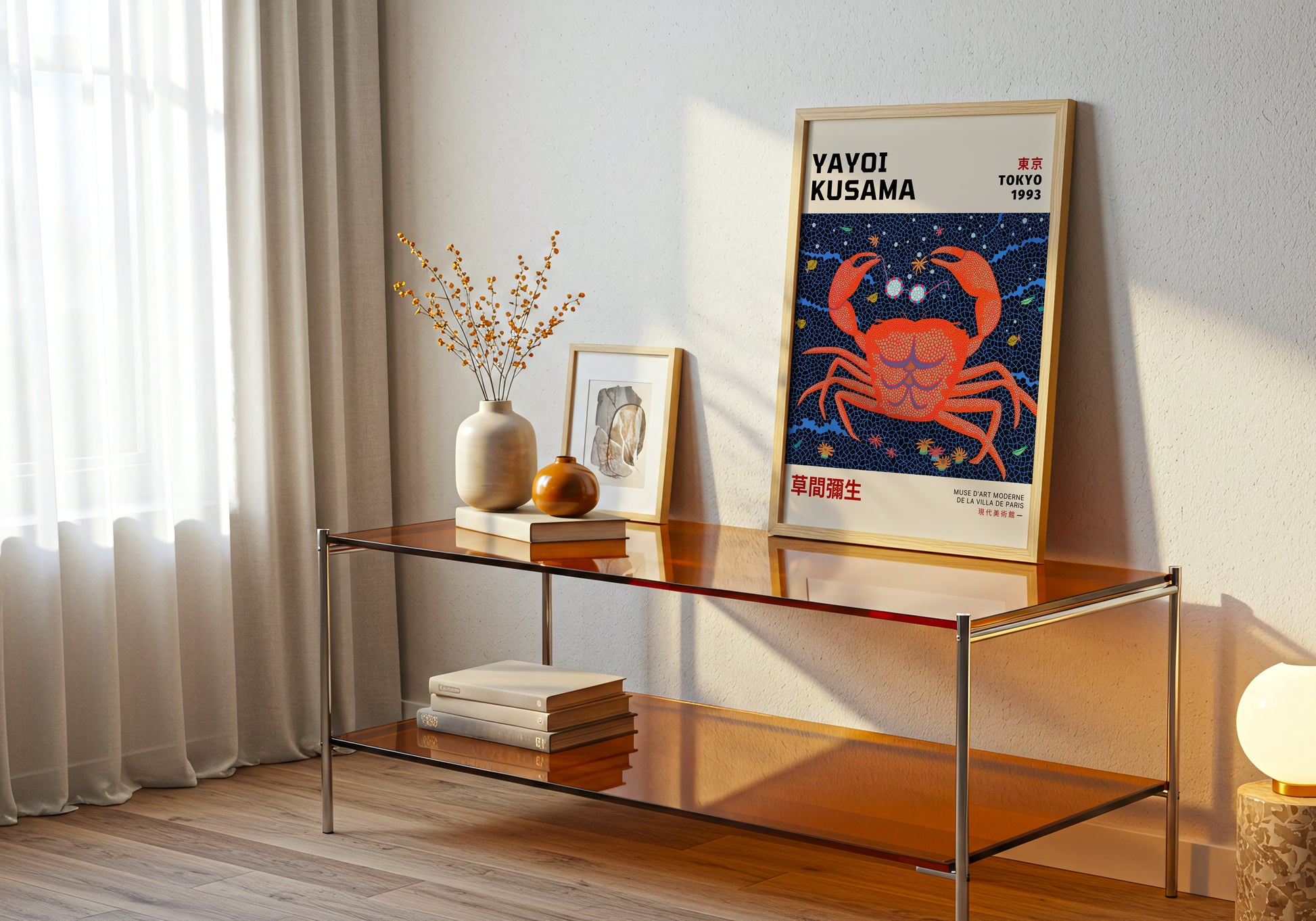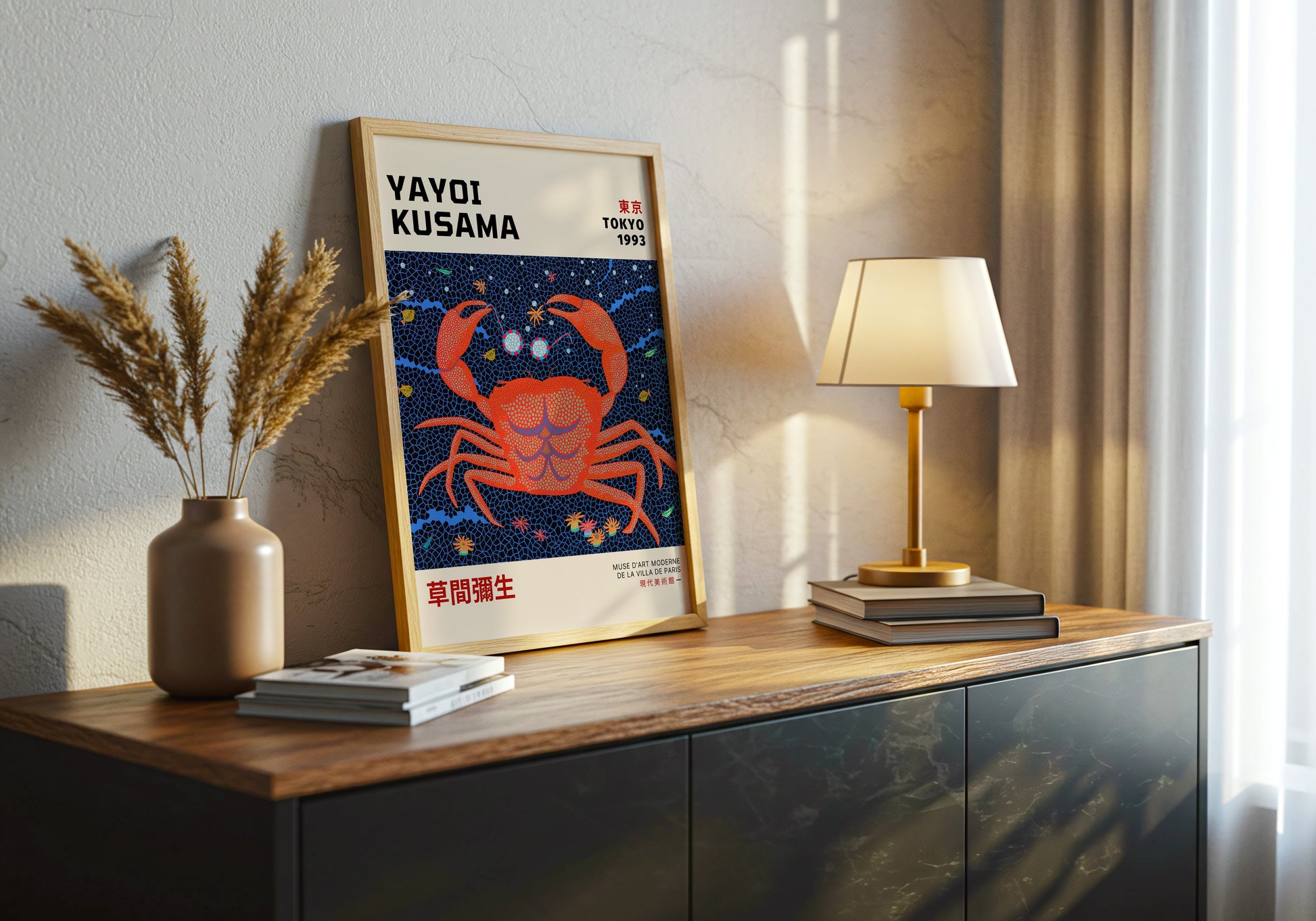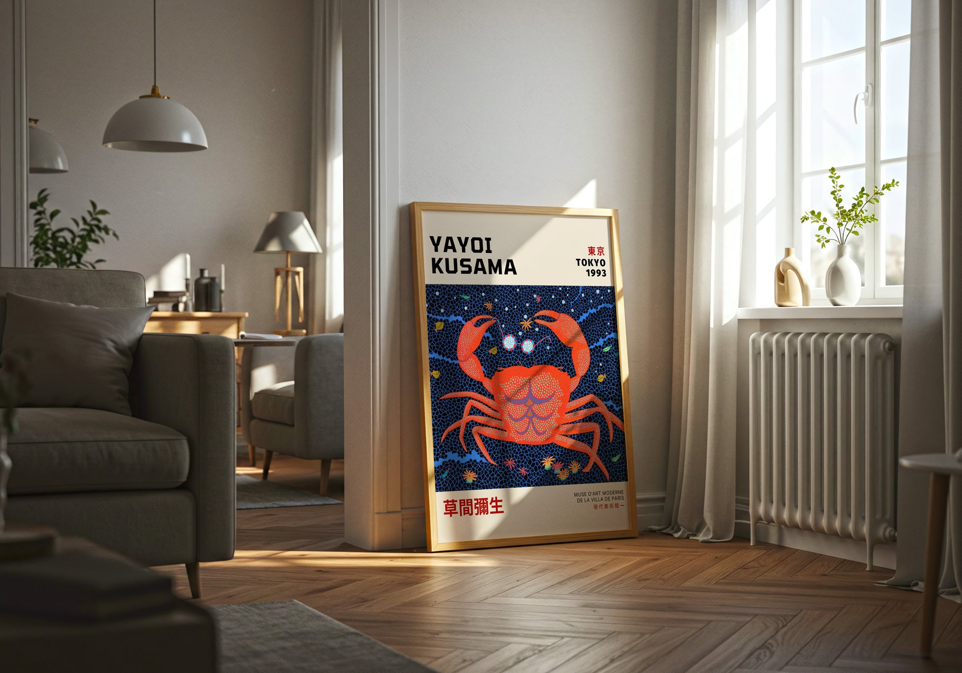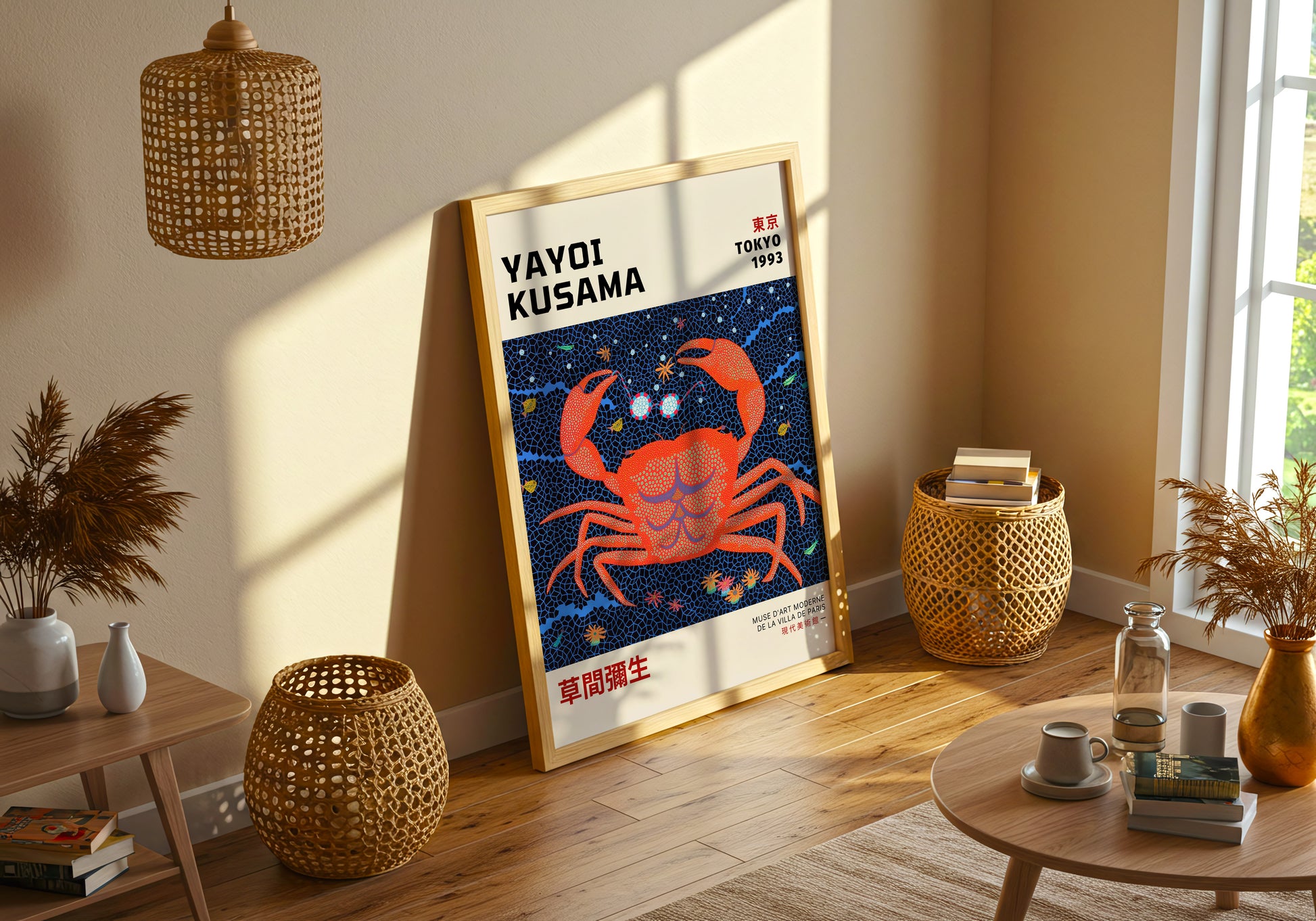 Poster d’arte ispirato all’inconfondibile stile di Yayoi Kusama, con una vibrante illustrazione di un granchio rosso su sfondo blu costellato di dettagli geometrici e psichedelici. Un omaggio all’arte contemporanea giapponese e alla mostra del 1993 a Tokyo. Perfetto per chi ama i colori vivaci, le texture ipnotiche e il design moderno.