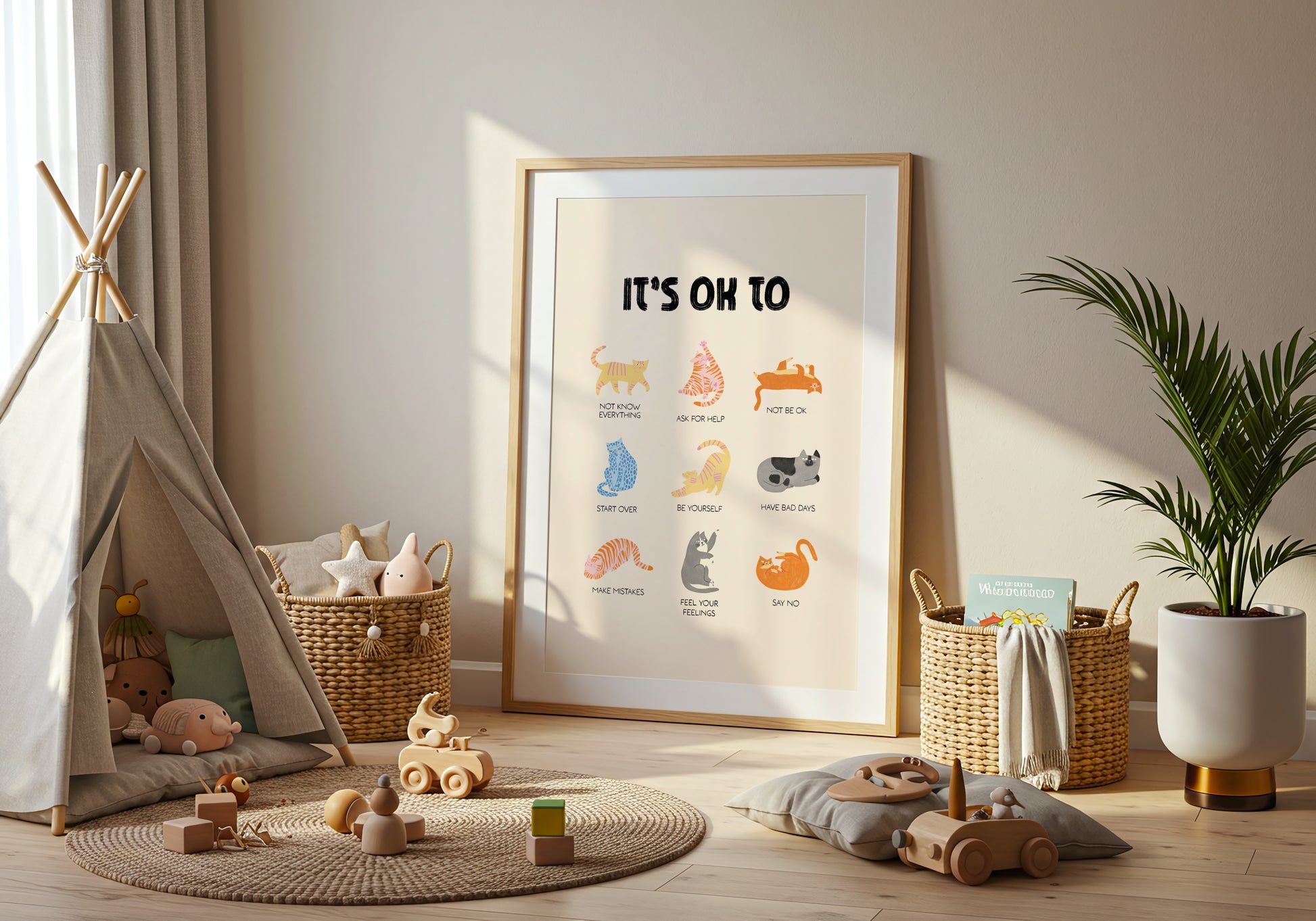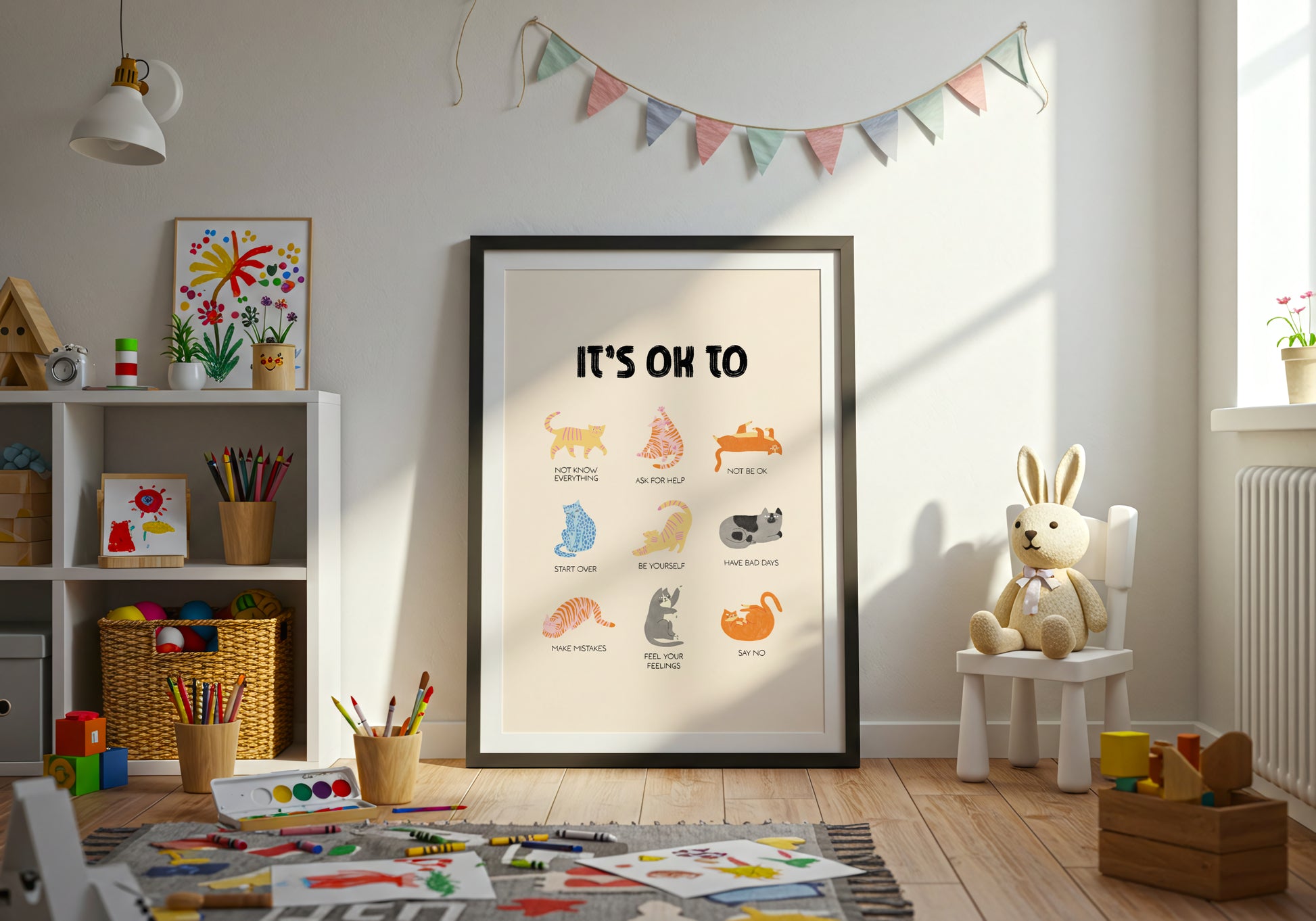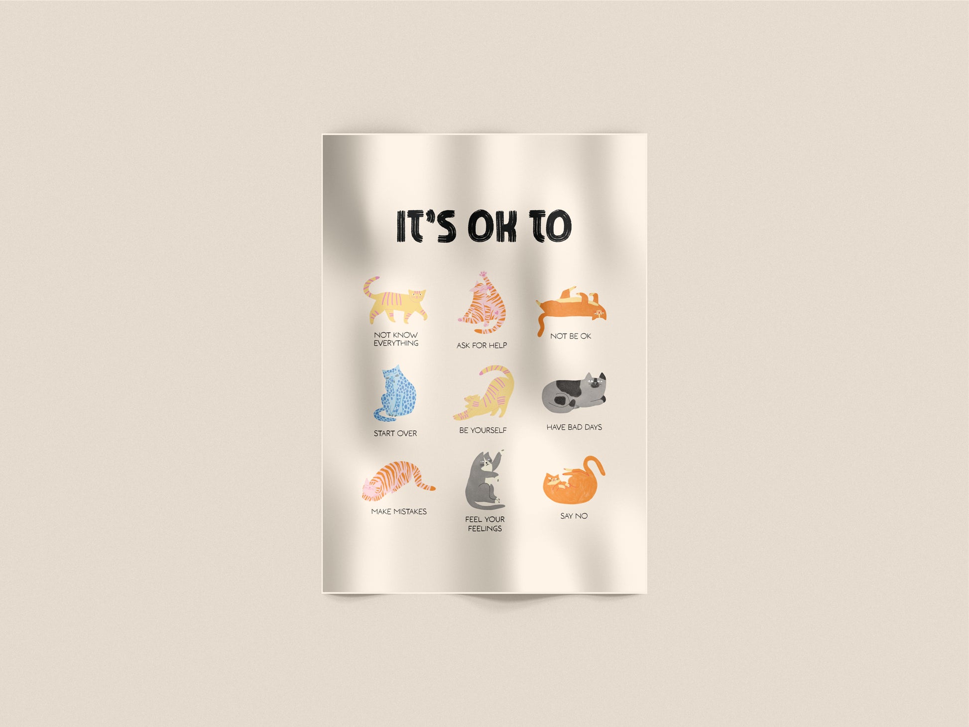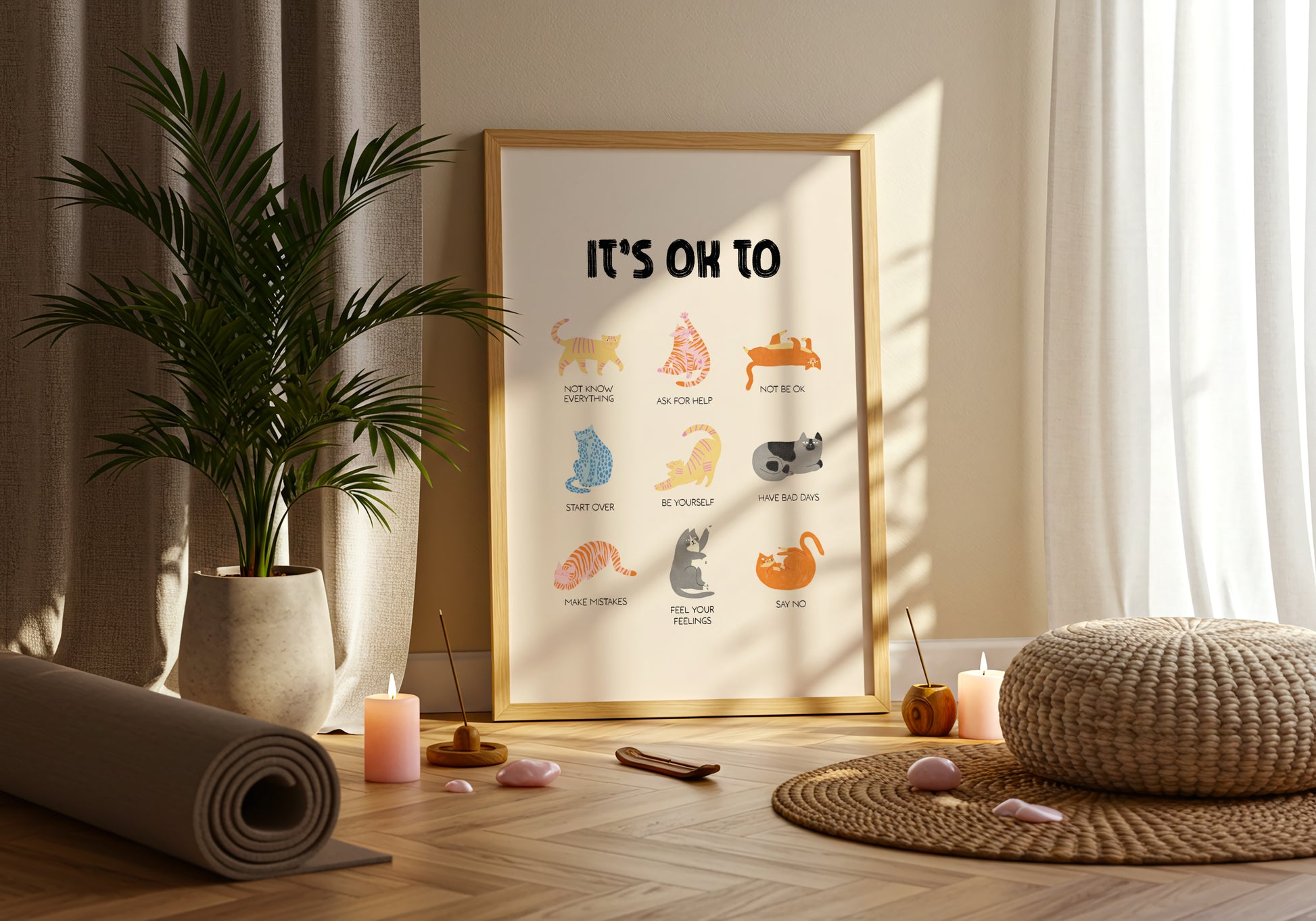 Un dolce promemoria di autocompassione attraverso adorabili gatti colorati, ognuno dei quali rappresenta un messaggio positivo: chiedere aiuto, fare errori, sentirsi tristi o semplicemente essere sé stessi.