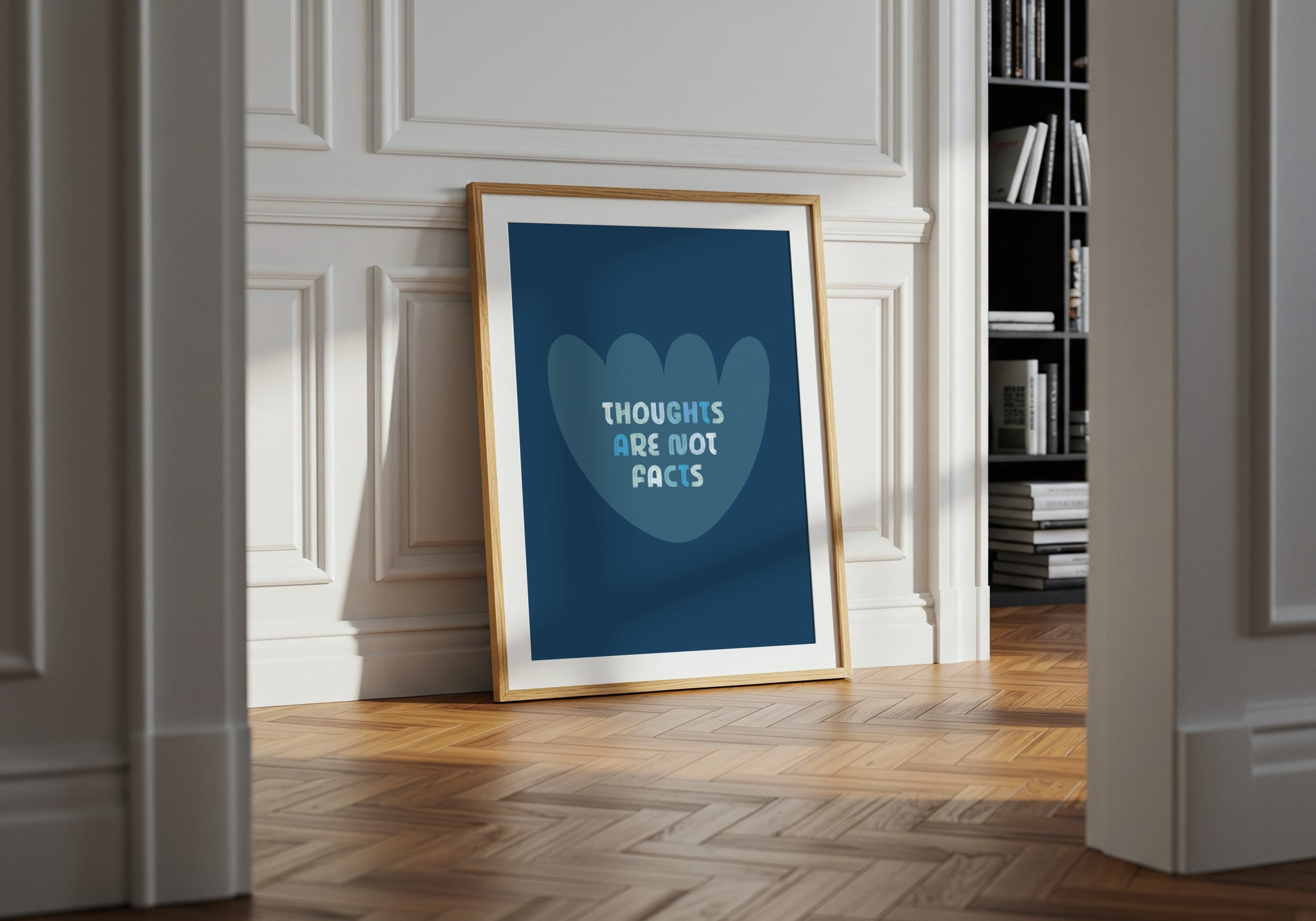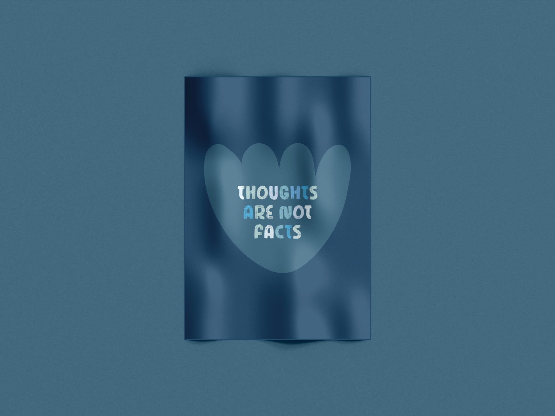 Poster dallo stile essenziale con la frase Thoughts are not facts su fondo blu profondo.
