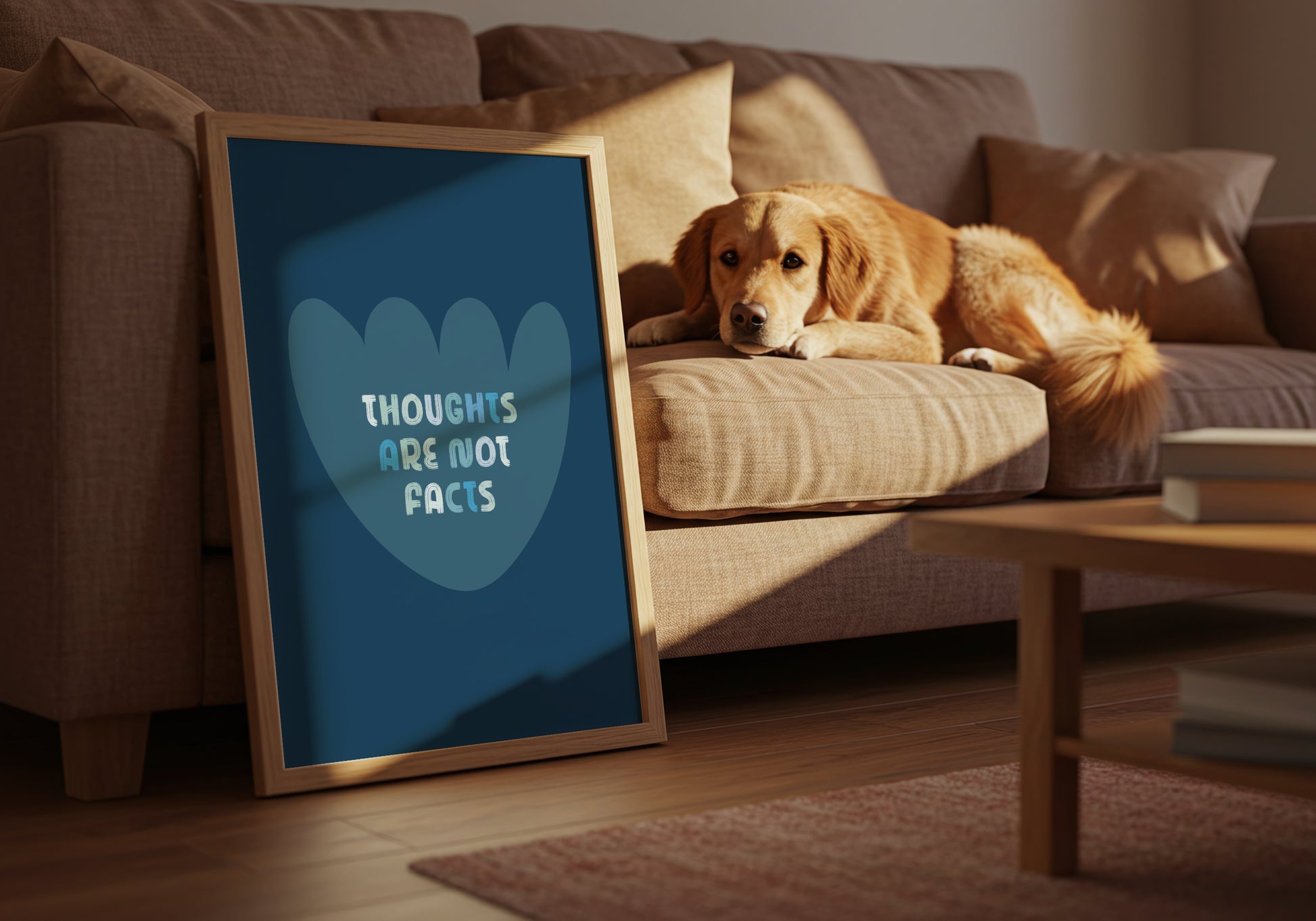 Un messaggio potente per ricordare che i pensieri non sempre rispecchiano la realtà — perfetto per chi pratica mindfulness o desidera un tocco di calma visiva.