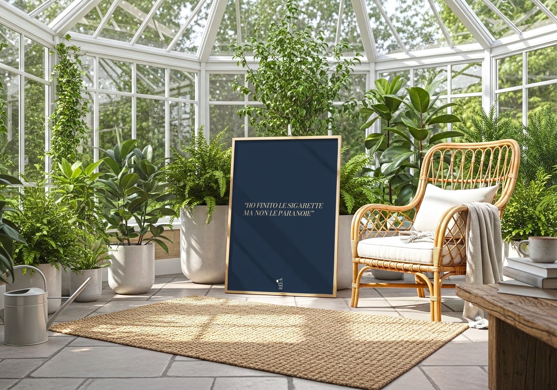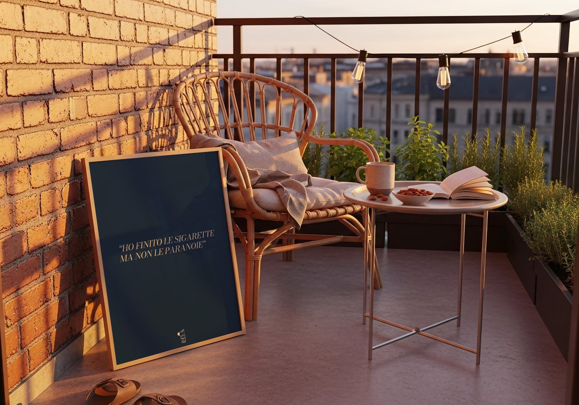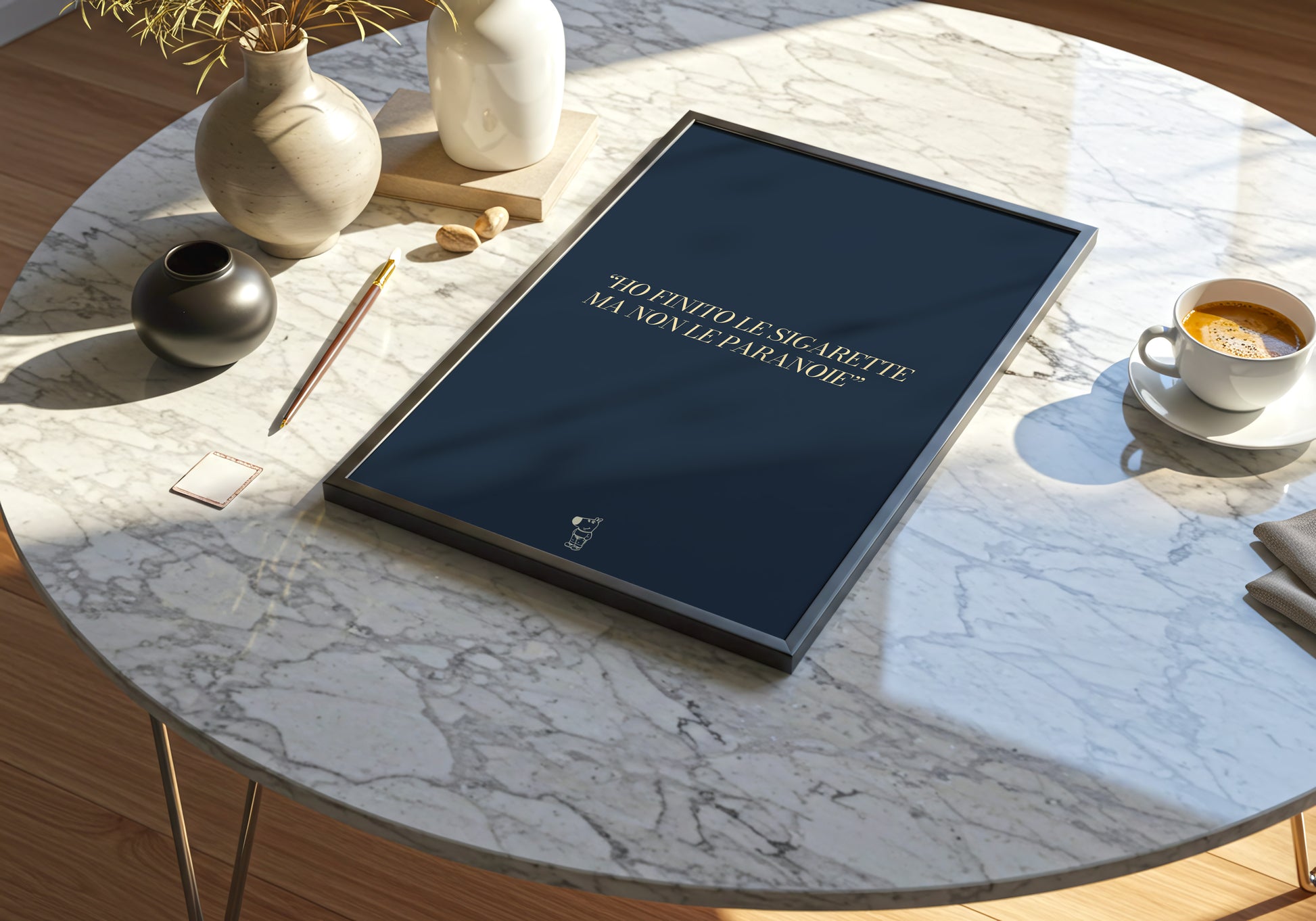 Poster elegante e ironico con la frase “Ho finito le sigarette ma non le paranoie”. Un design essenziale con fondo blu notte e testo dorato, perfetto per chi ama l’estetica raffinata e le citazioni dallo humor sottile. Ideale per spazi moderni, camere o studi creativi.