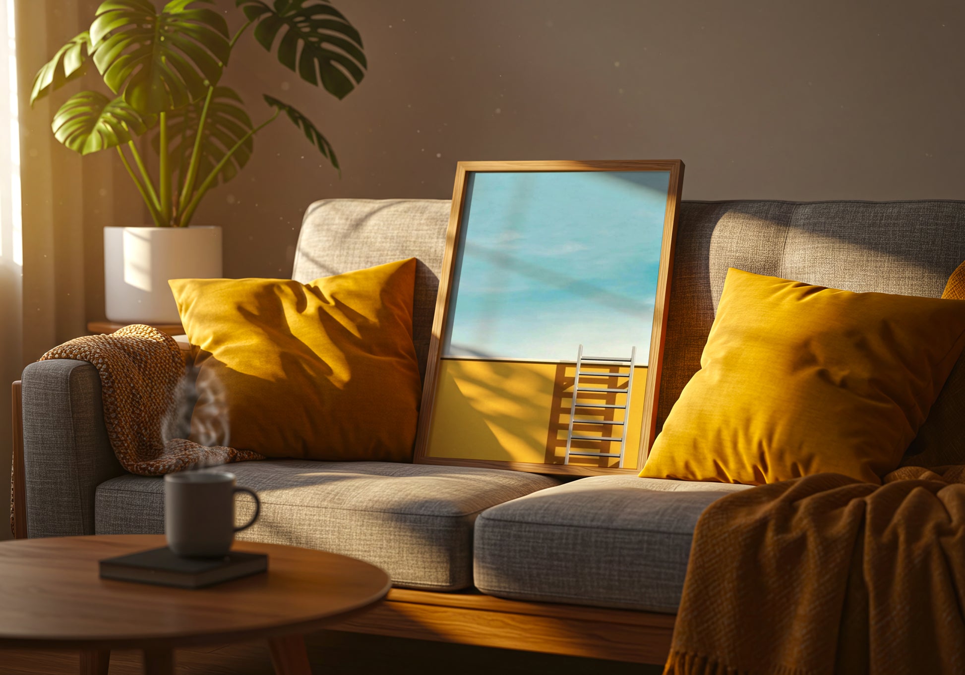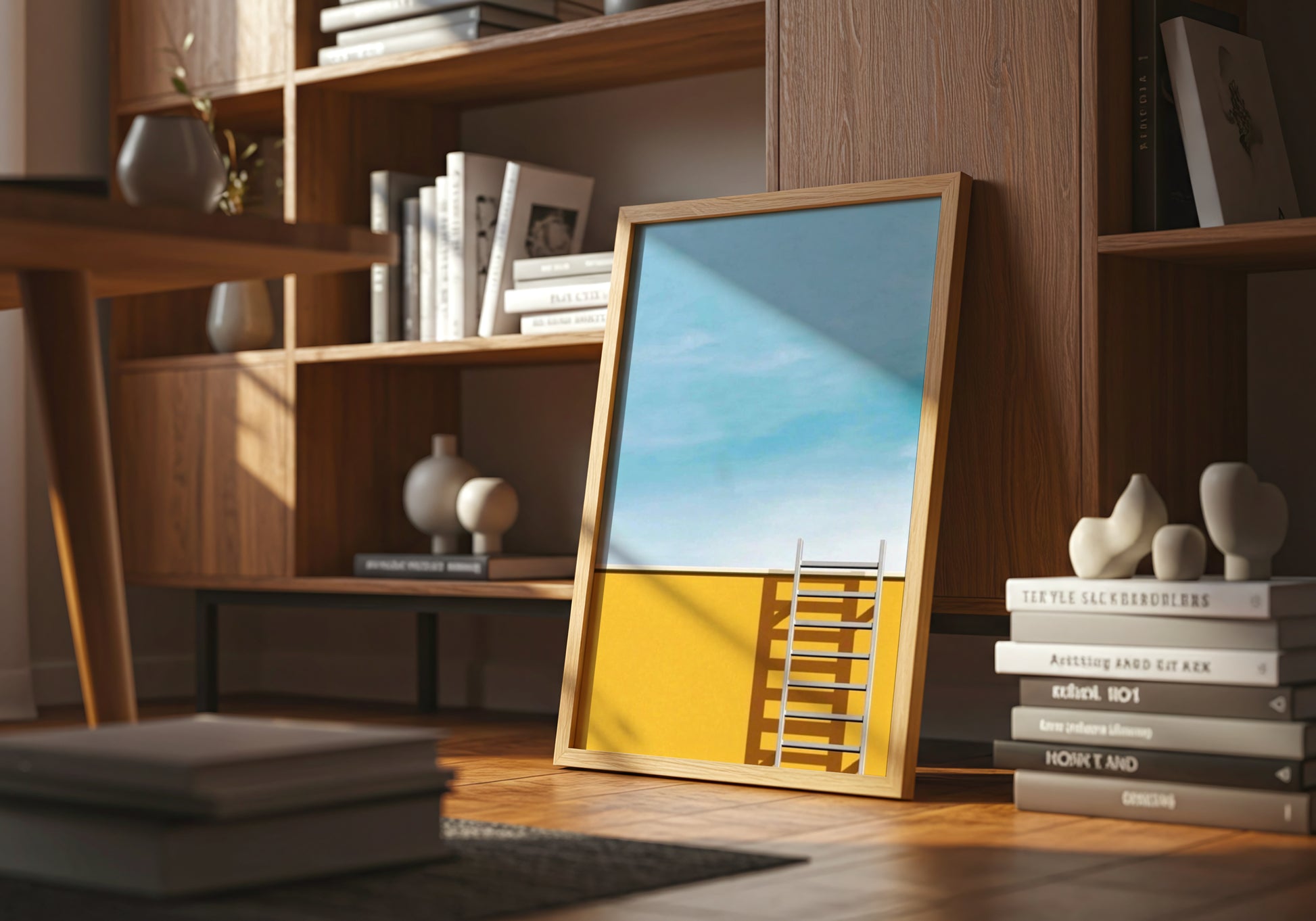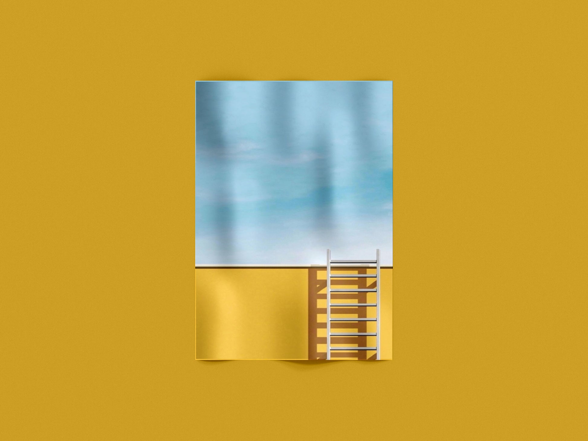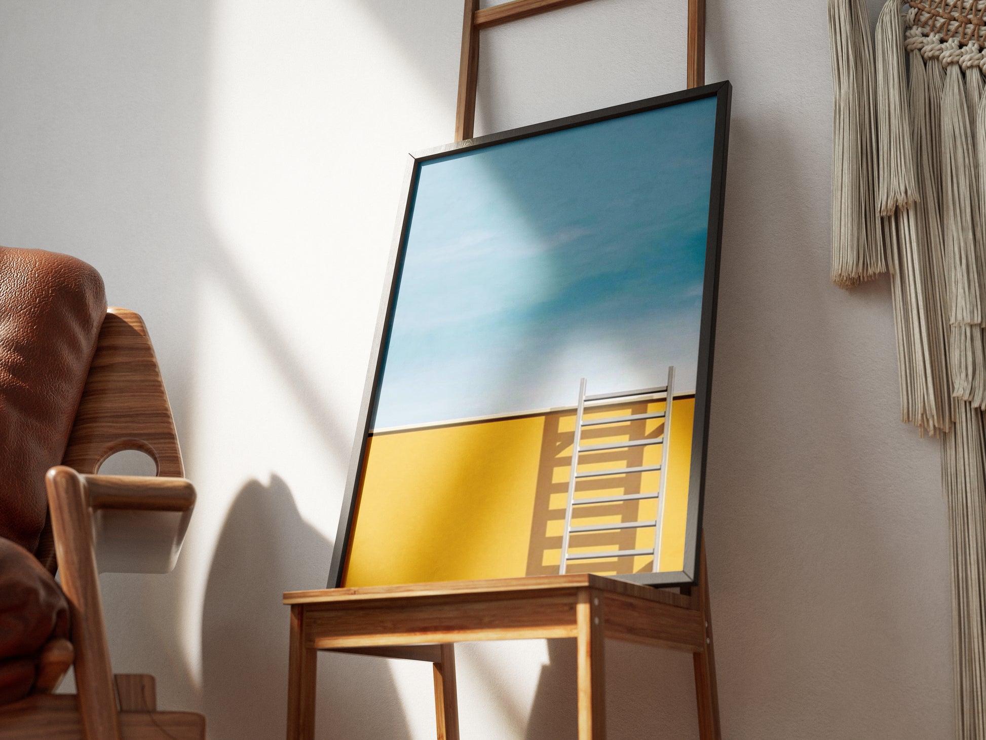 Un’immagine luminosa e minimalista che mostra una scala appoggiata a un muro giallo, oltre il quale si apre un cielo azzurro morbido e profondo. Il contrasto tra i colori crea una sensazione di apertura e possibilità, come un passaggio verso uno spazio più ampio e sereno.