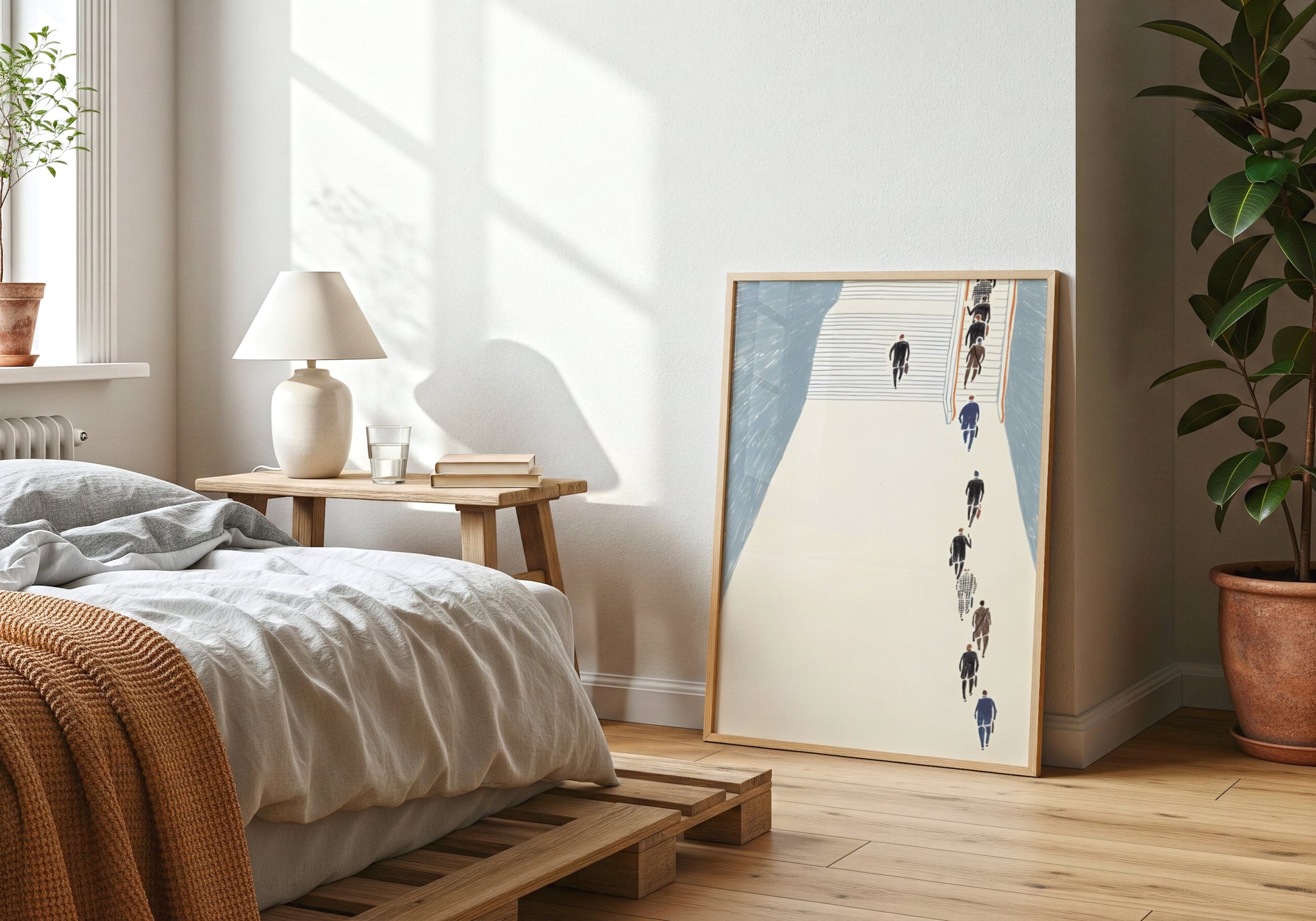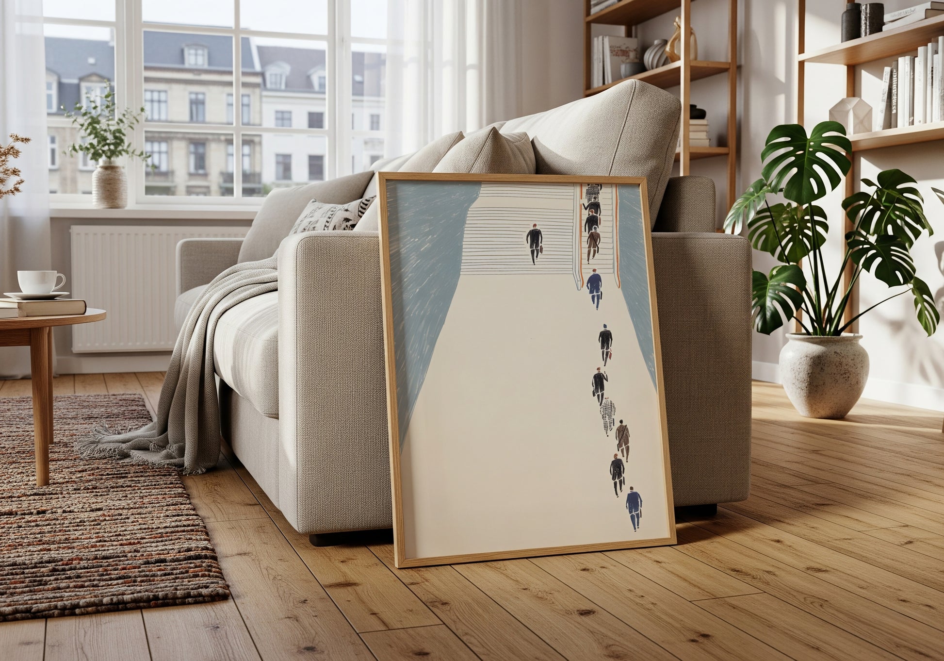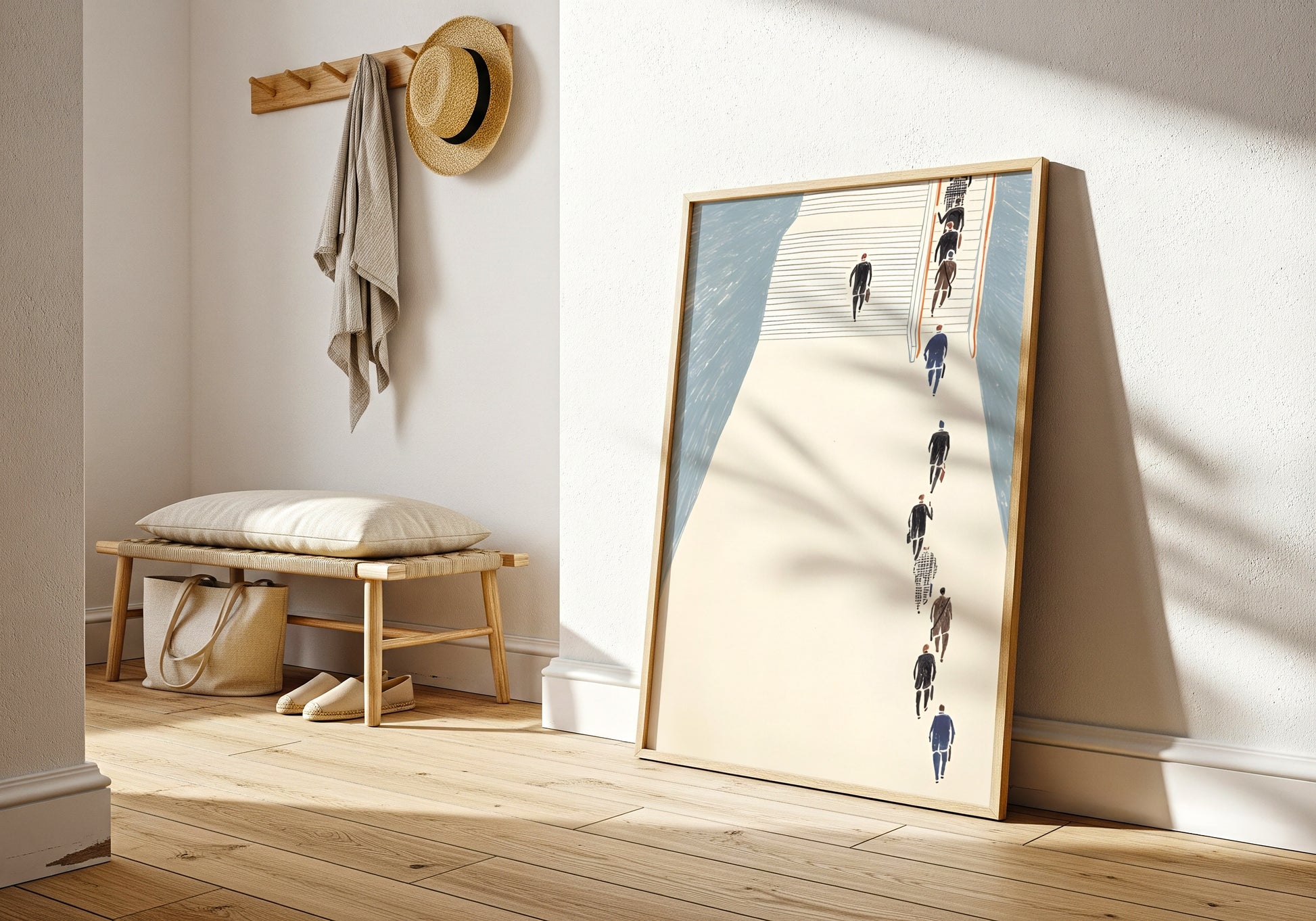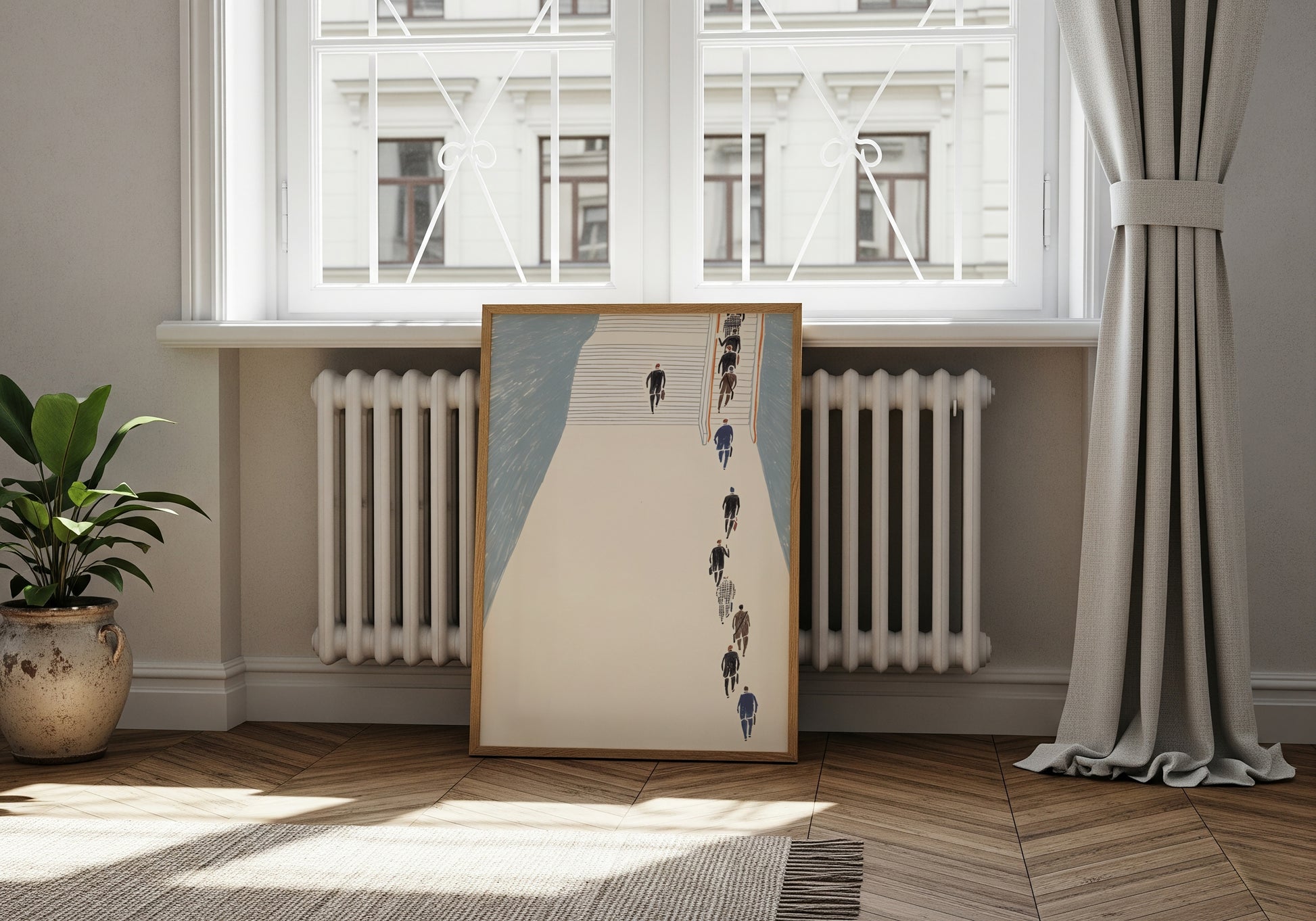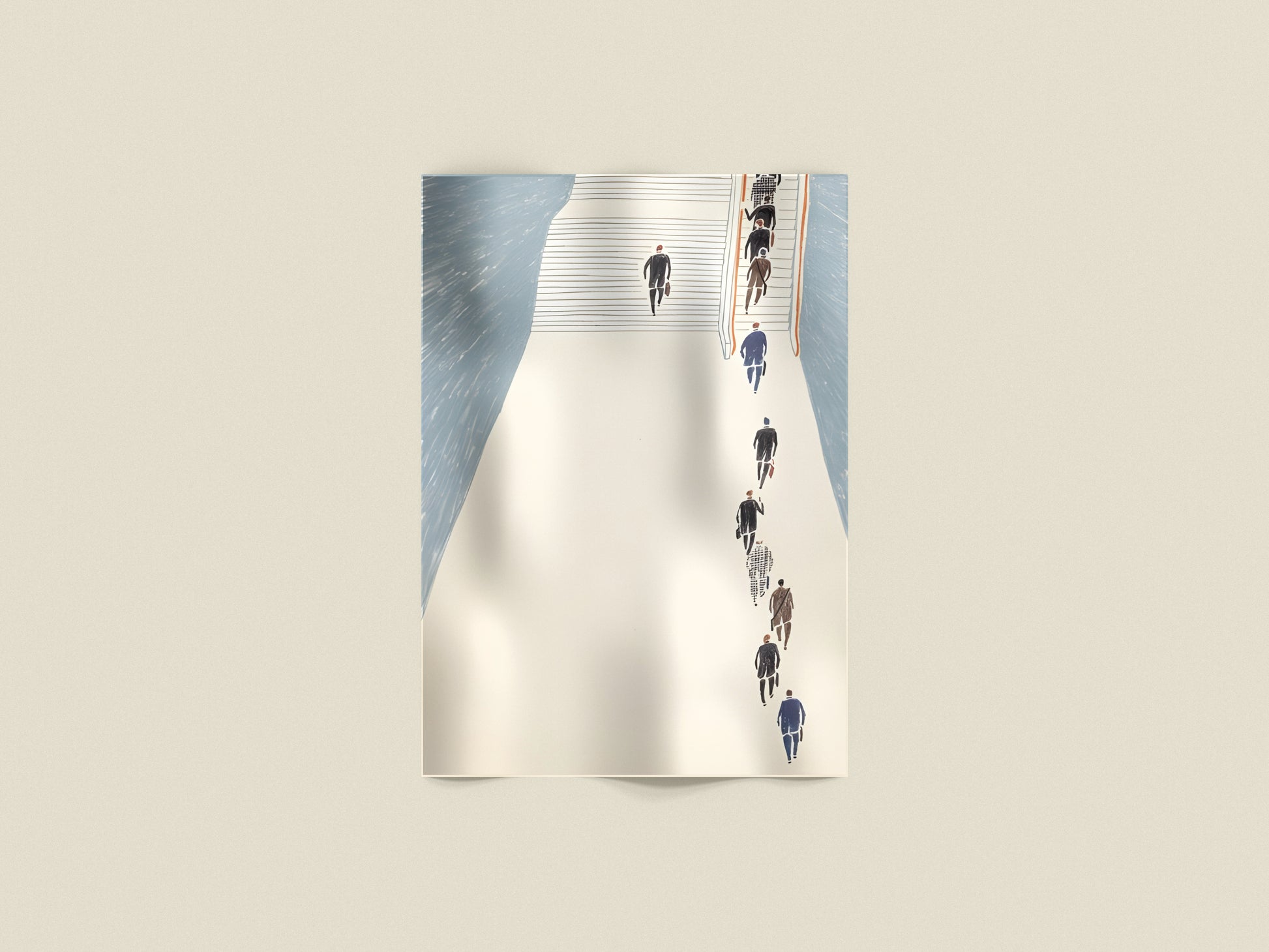 Un’illustrazione dal tratto essenziale che ritrae una lunga scalinata popolata da figure stilizzate, immerse nel ritmo silenzioso della vita urbana. Le persone salgono o scendono, ciascuna con la propria postura e direzione, creando un flusso costante che richiama la routine del pendolarismo. I colori tenui e le linee semplici amplificano il senso di calma e distacco, mentre il grande spazio vuoto al centro suggerisce una pausa, un respiro, o forse la solitudine che si nasconde tra la folla. Un’opera che cattura perfettamente la poesia dei gesti quotidiani.