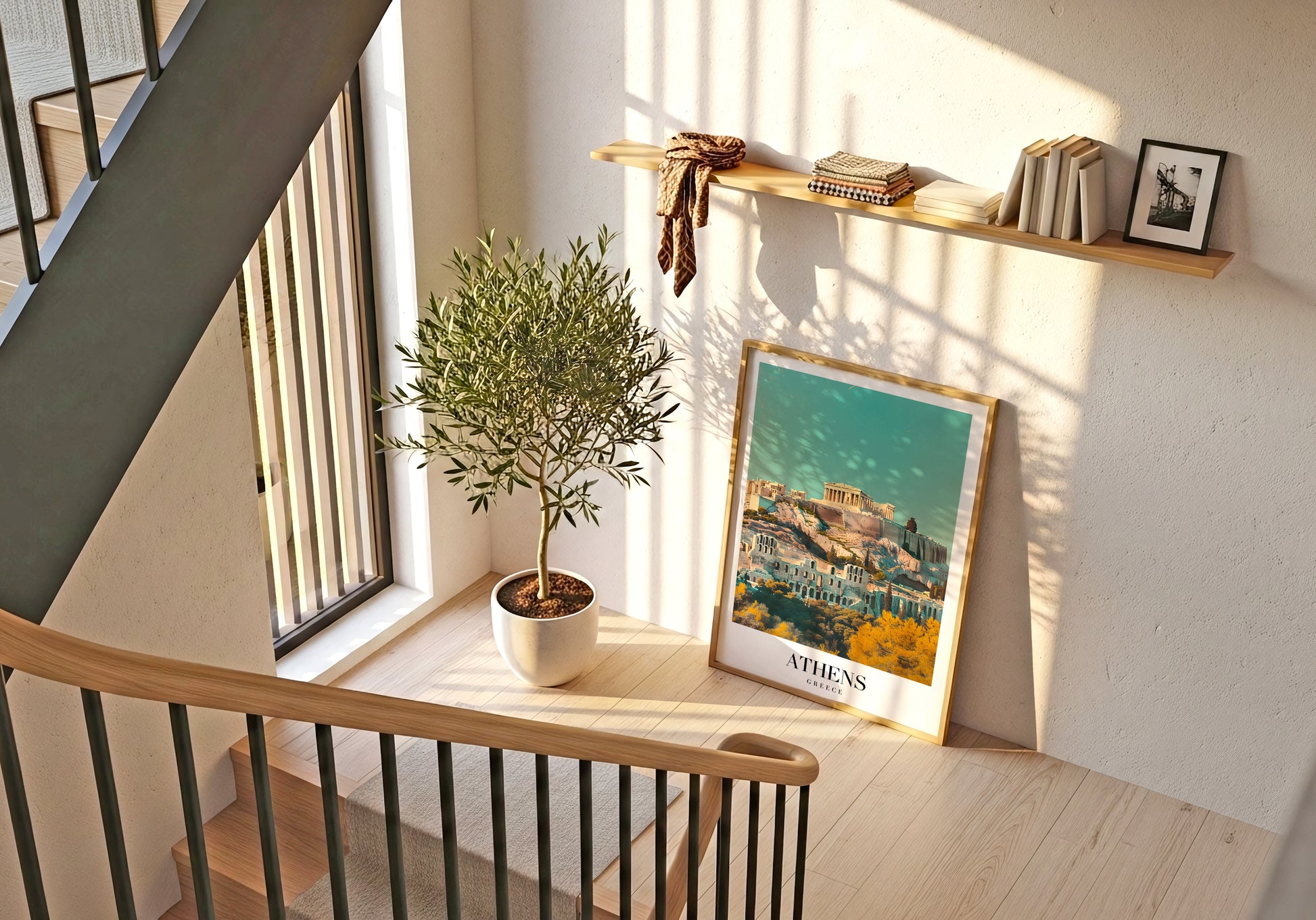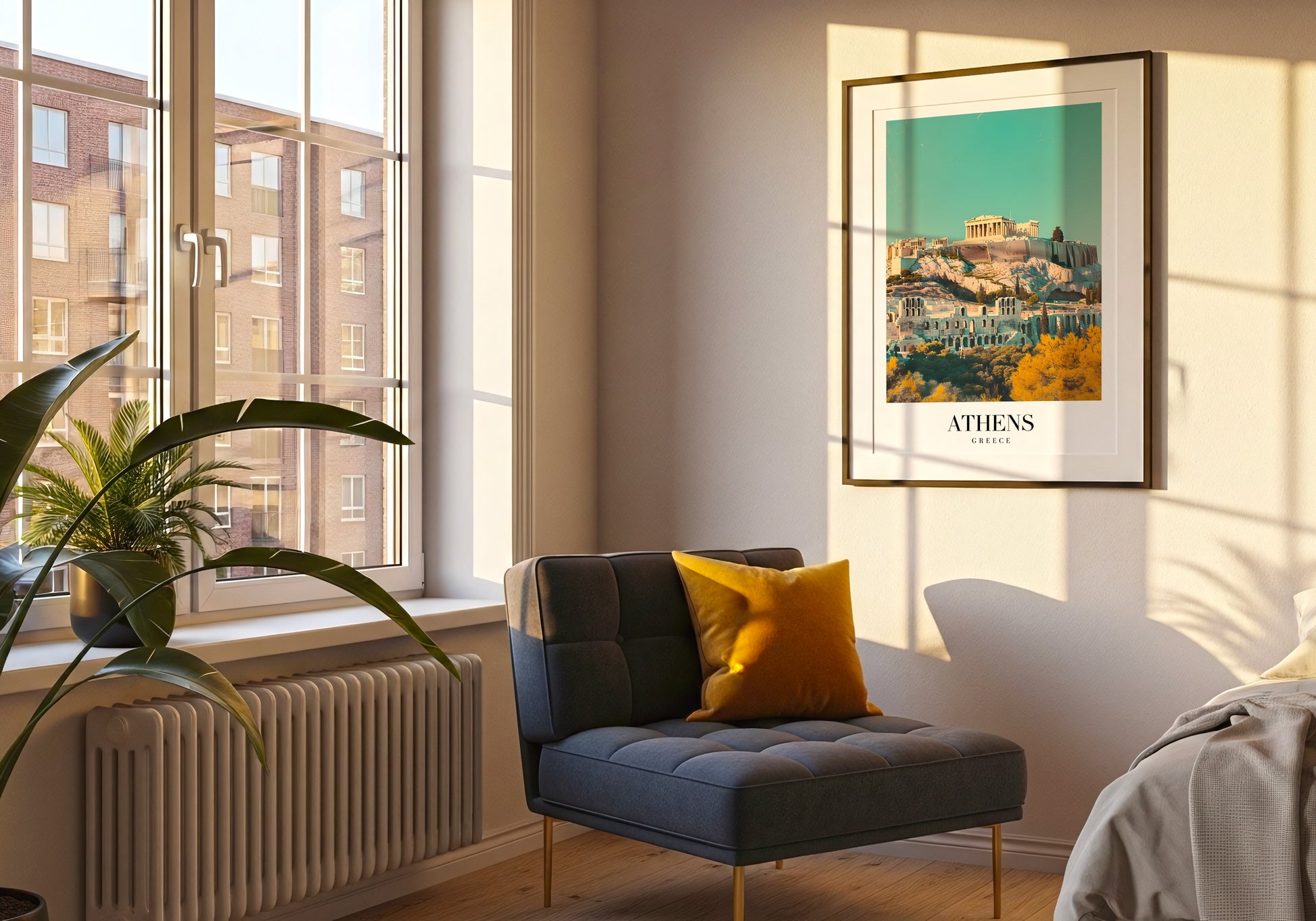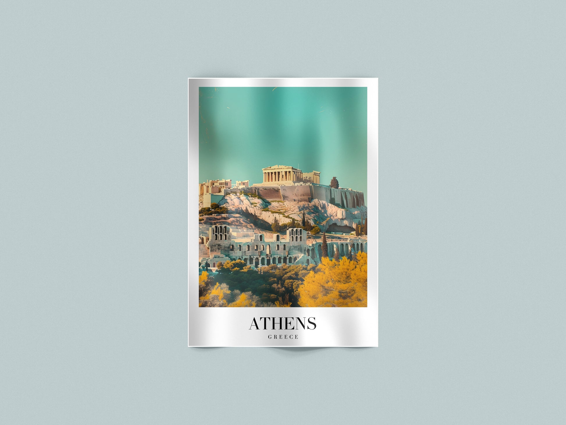 Un poster che racchiude la maestosità dell’antica Atene, con l’Acropoli che domina la città sotto un cielo sereno e luminoso.