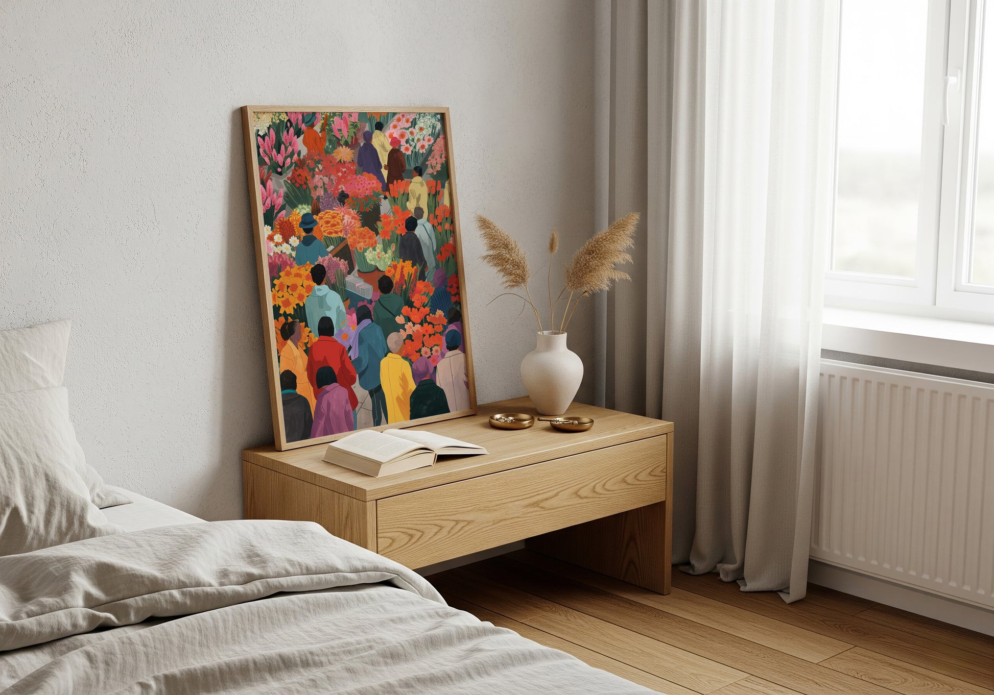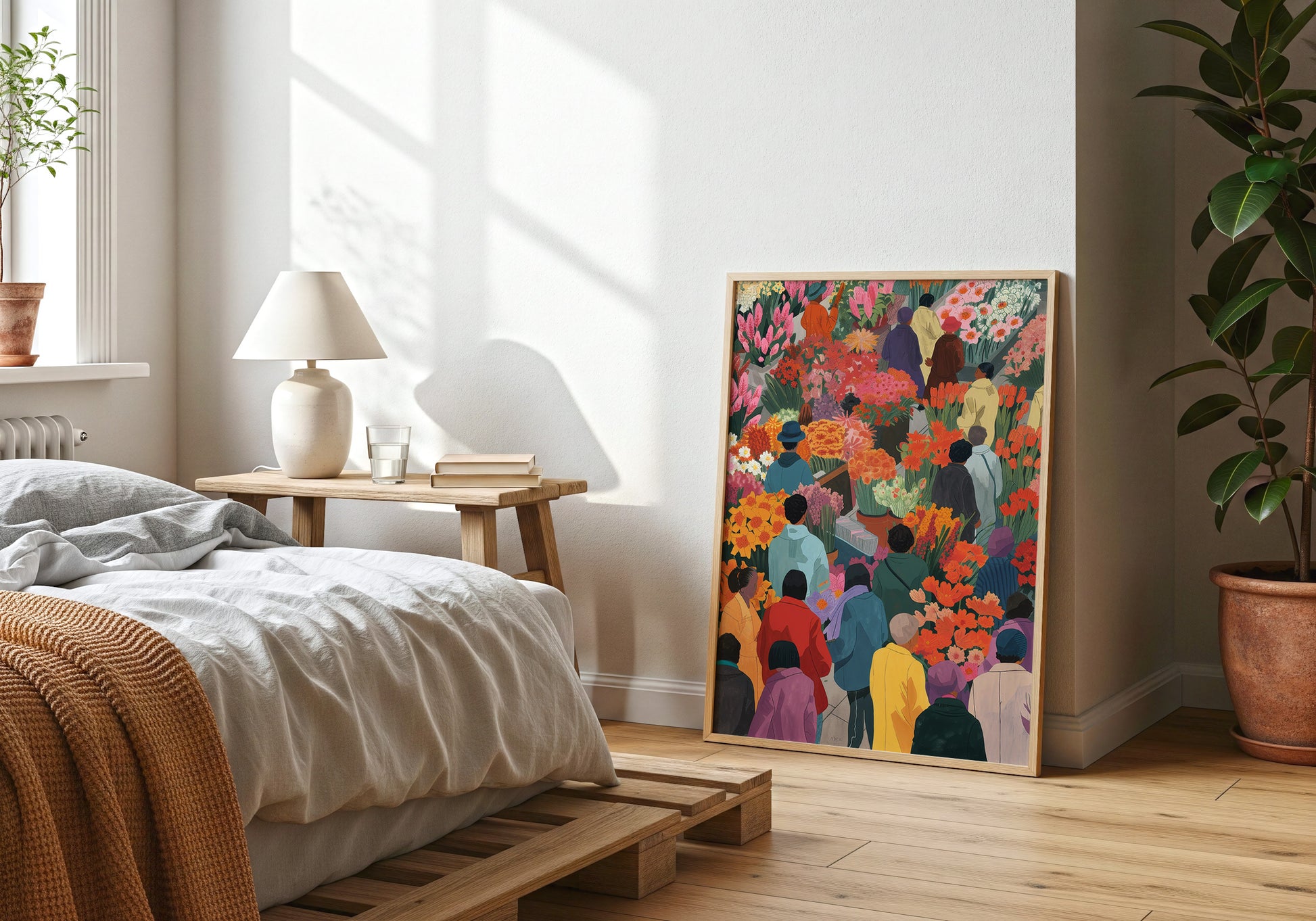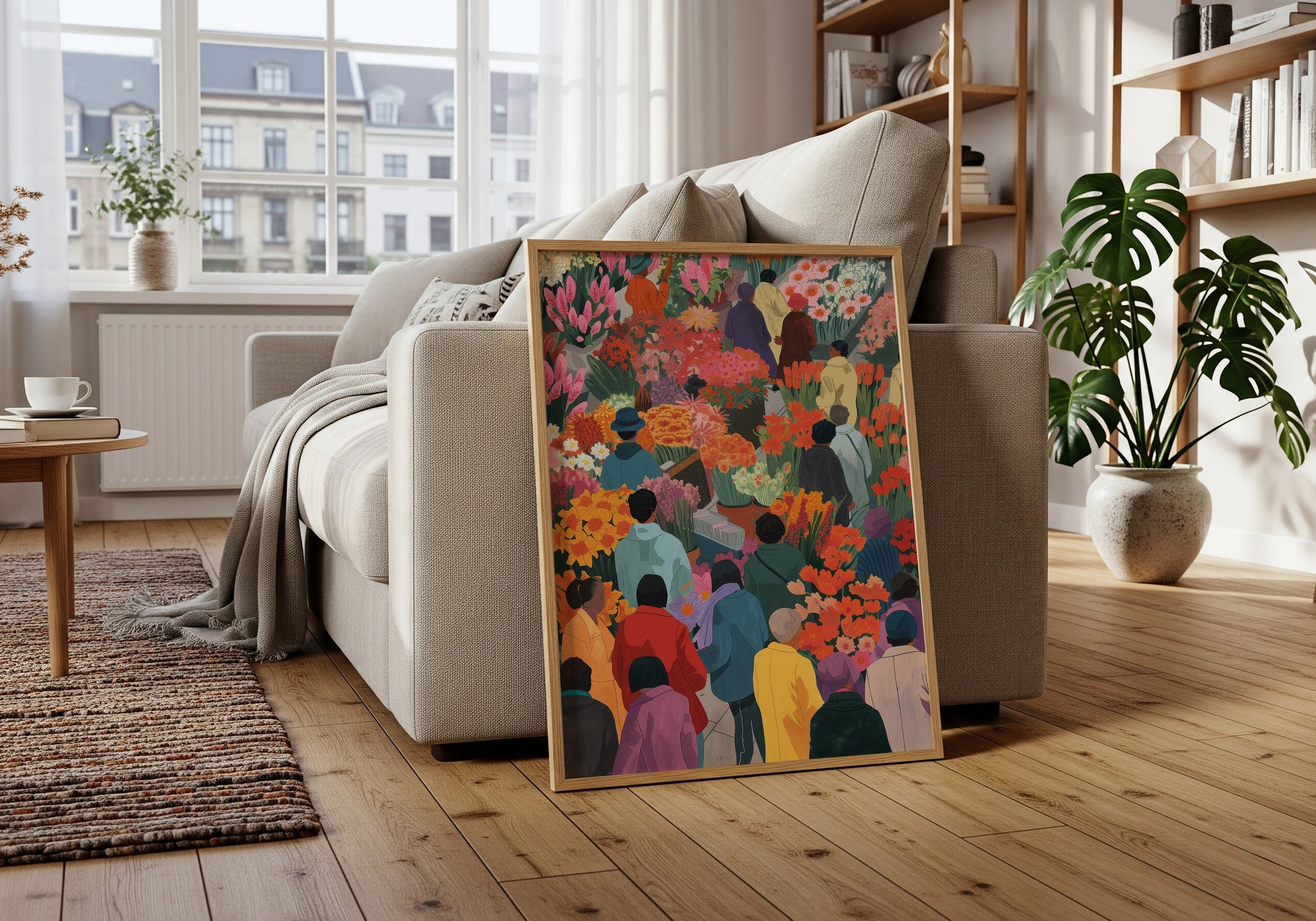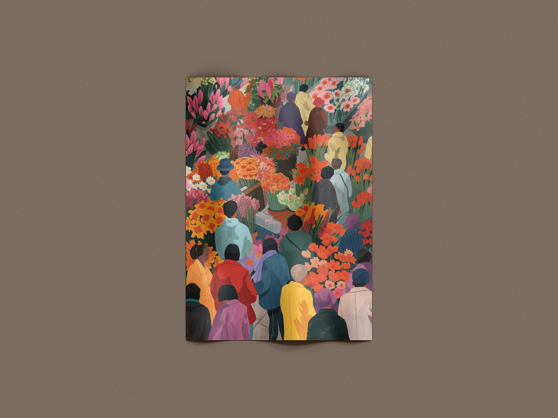 Un’illustrazione vibrante che ritrae una folla immersa tra colori intensi, profumi immaginati e un mare di petali. Ogni figura sembra perdersi nella bellezza del mercato, creando un movimento corale che riempie lo spazio di energia e calore.