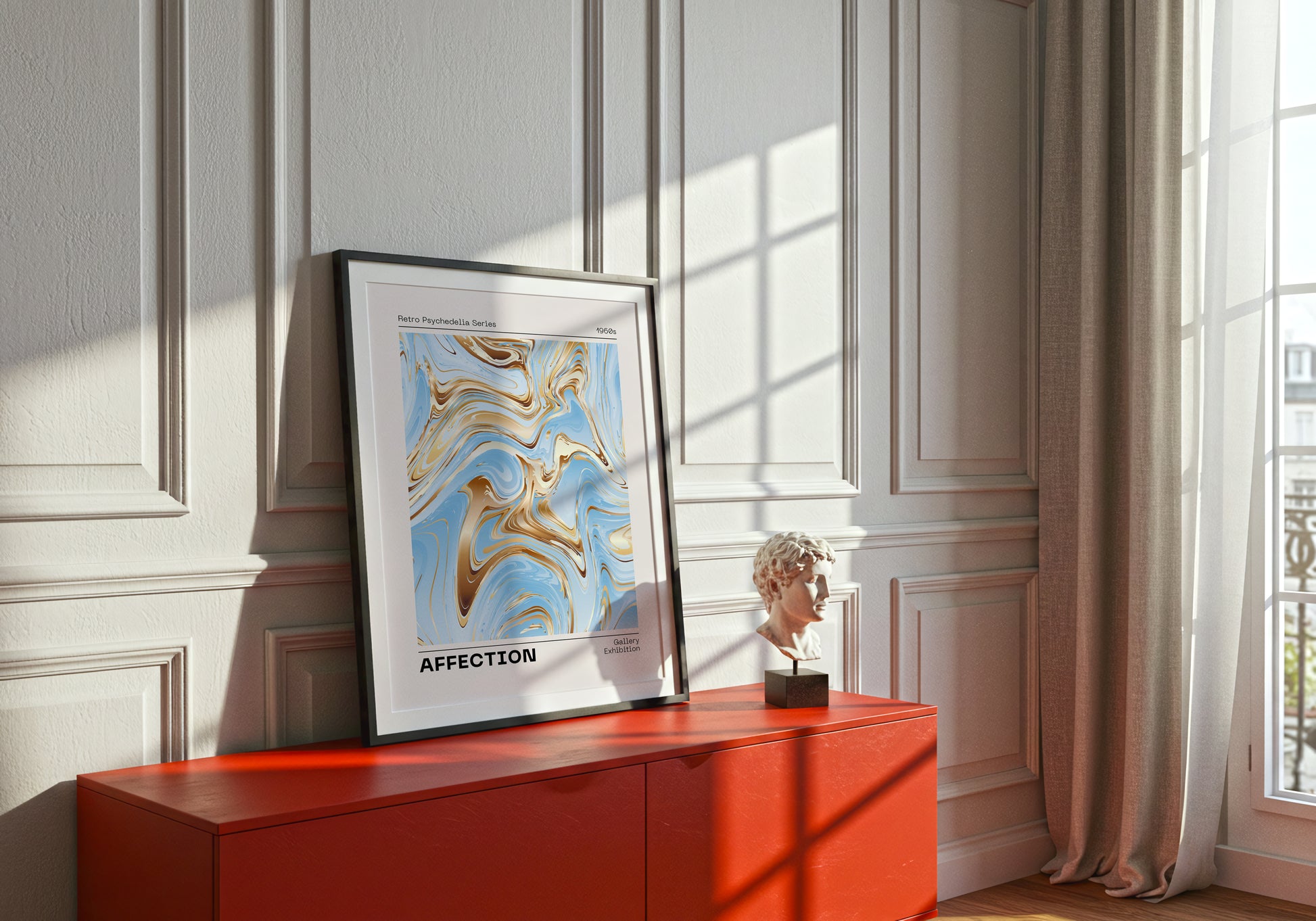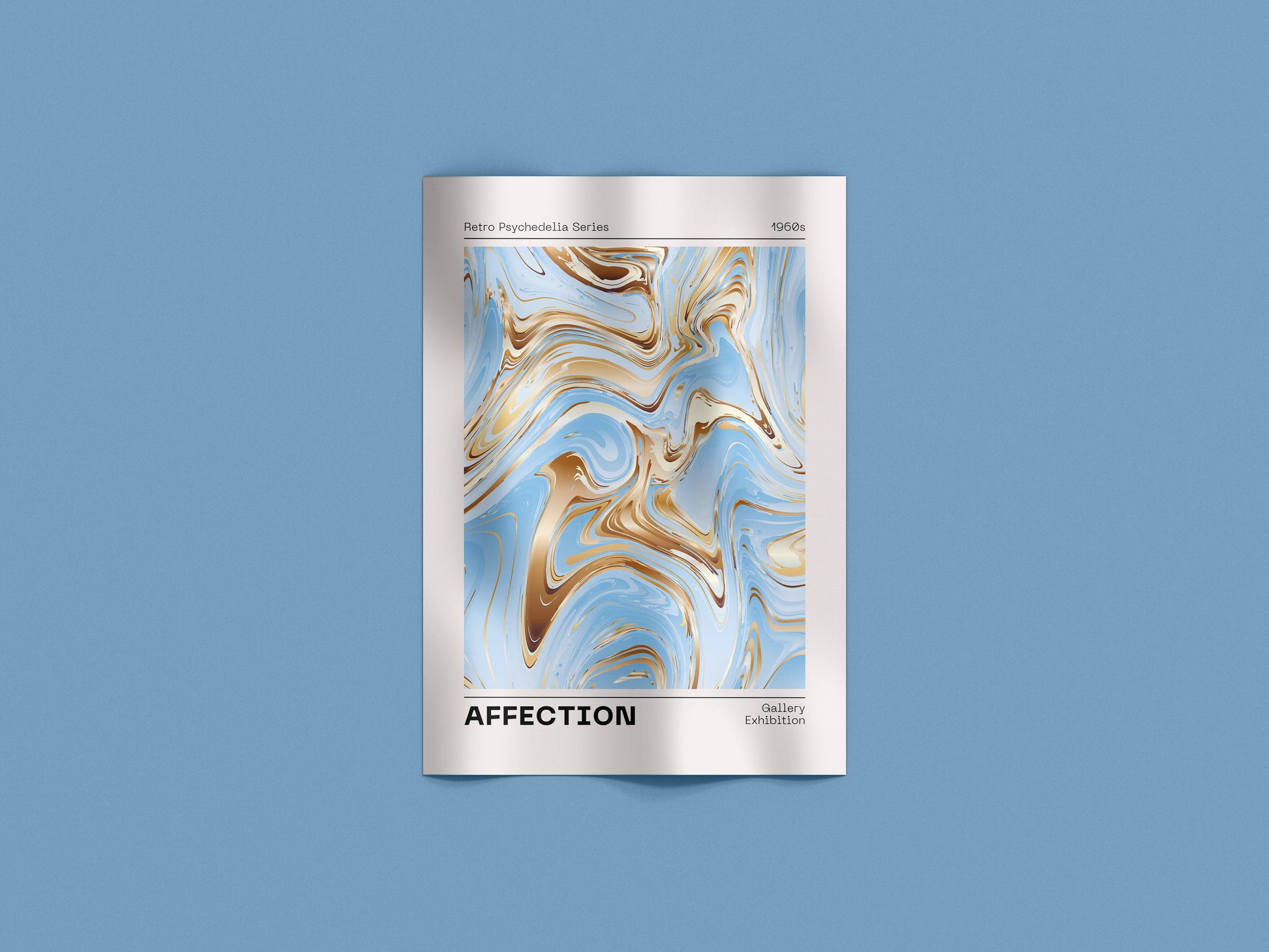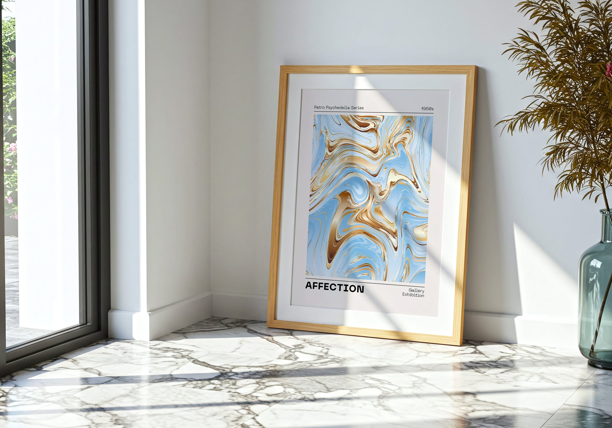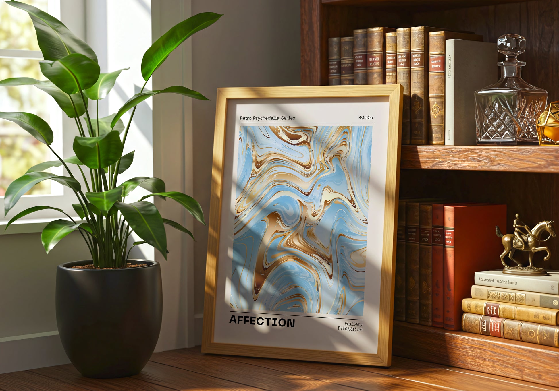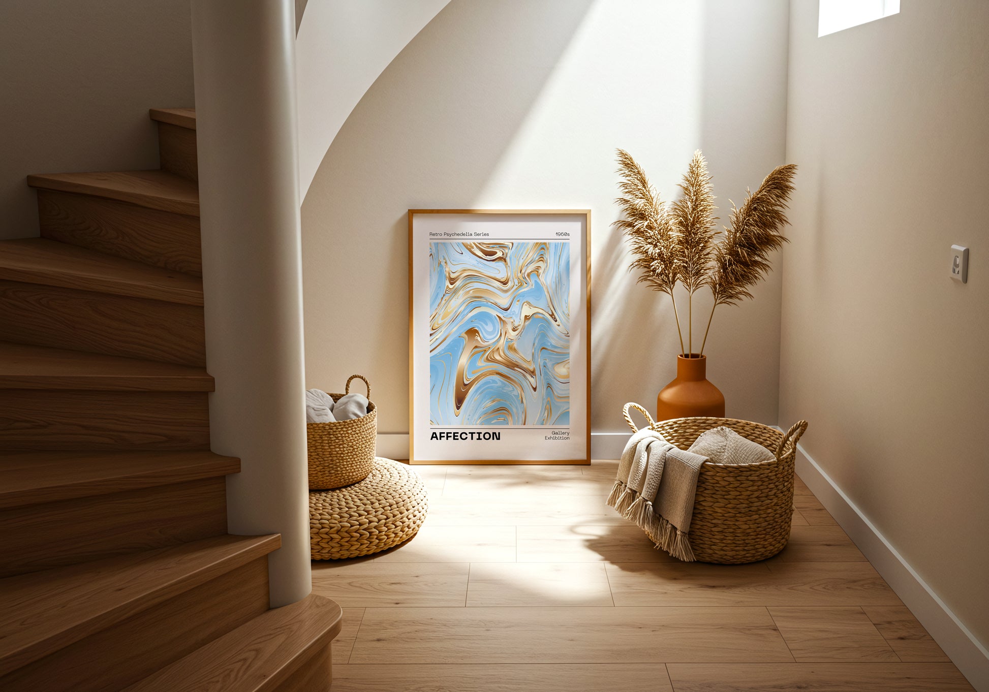 Un poster dallo stile rétro-psichedelico, ispirato alle grafiche degli anni ’60. Le onde fluide in toni azzurri e caramello creano un movimento morbido e ipnotico, perfetto per chi ama decorare i propri spazi con arte astratta e colori rilassanti.