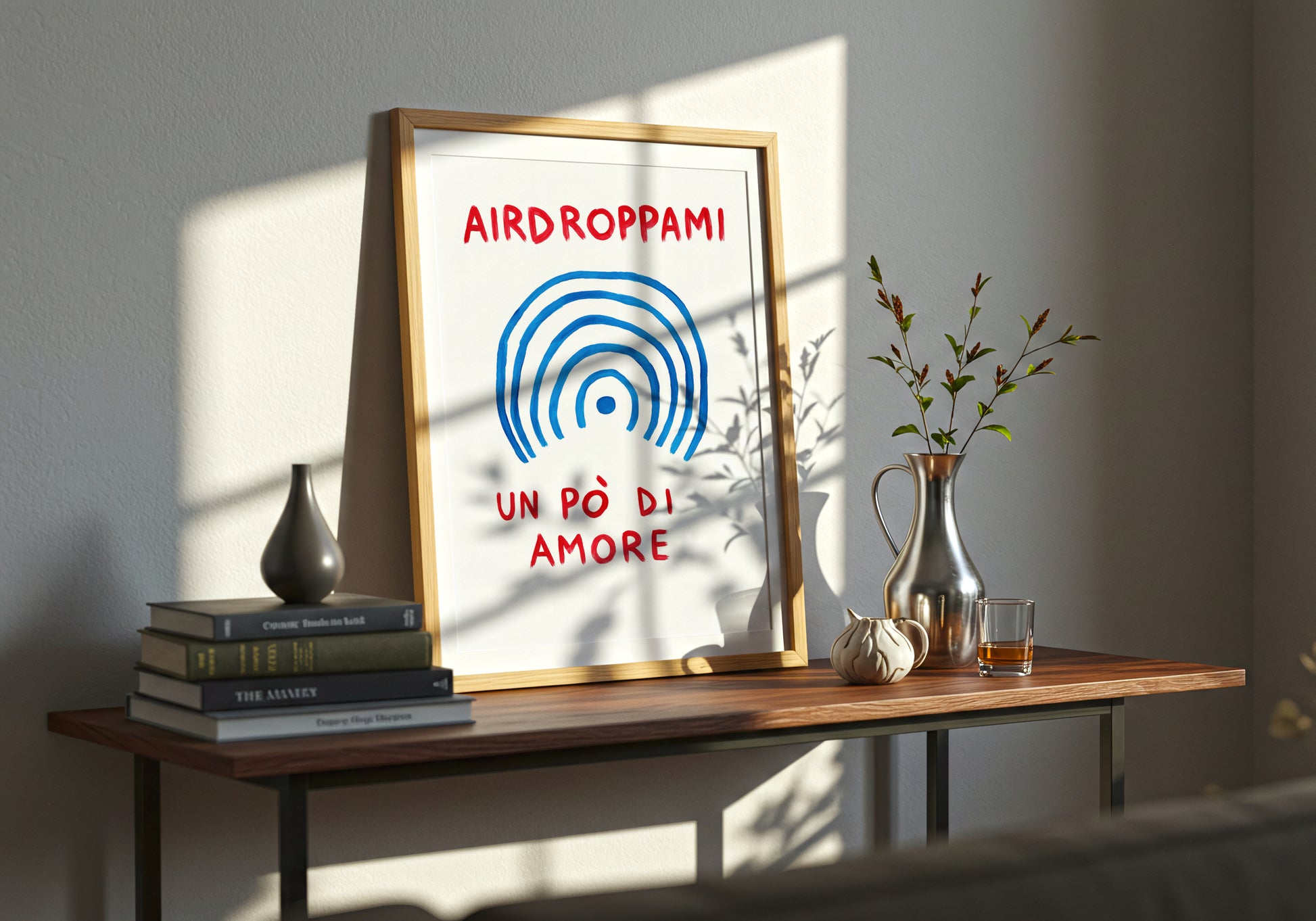 Un mix perfetto tra romanticismo e contemporaneità: una frase che fa sorridere e riflettere, trasformata in arte pop minimale. Ispirato al linguaggio digitale, questo poster parla il linguaggio dell’amore 2.0 con ironia e leggerezza.