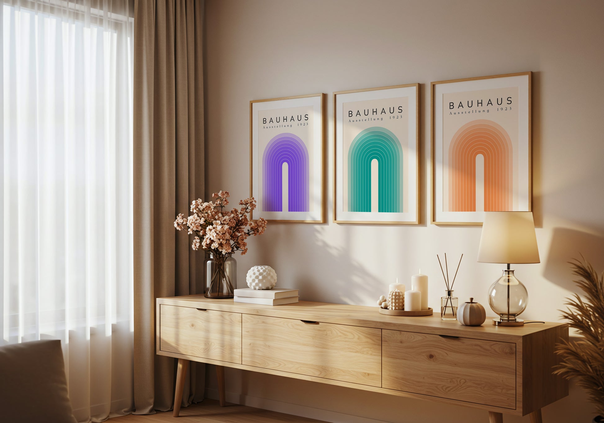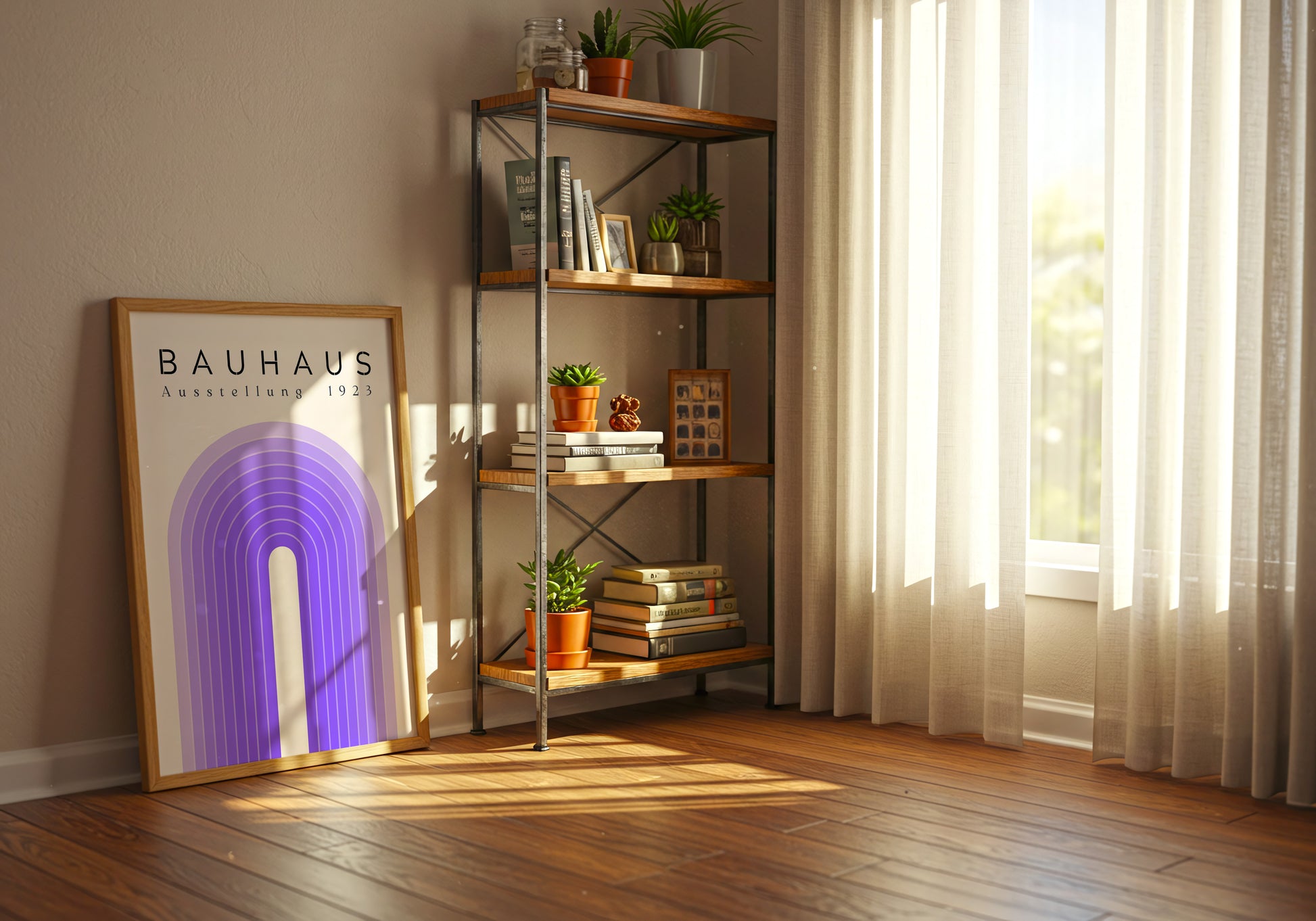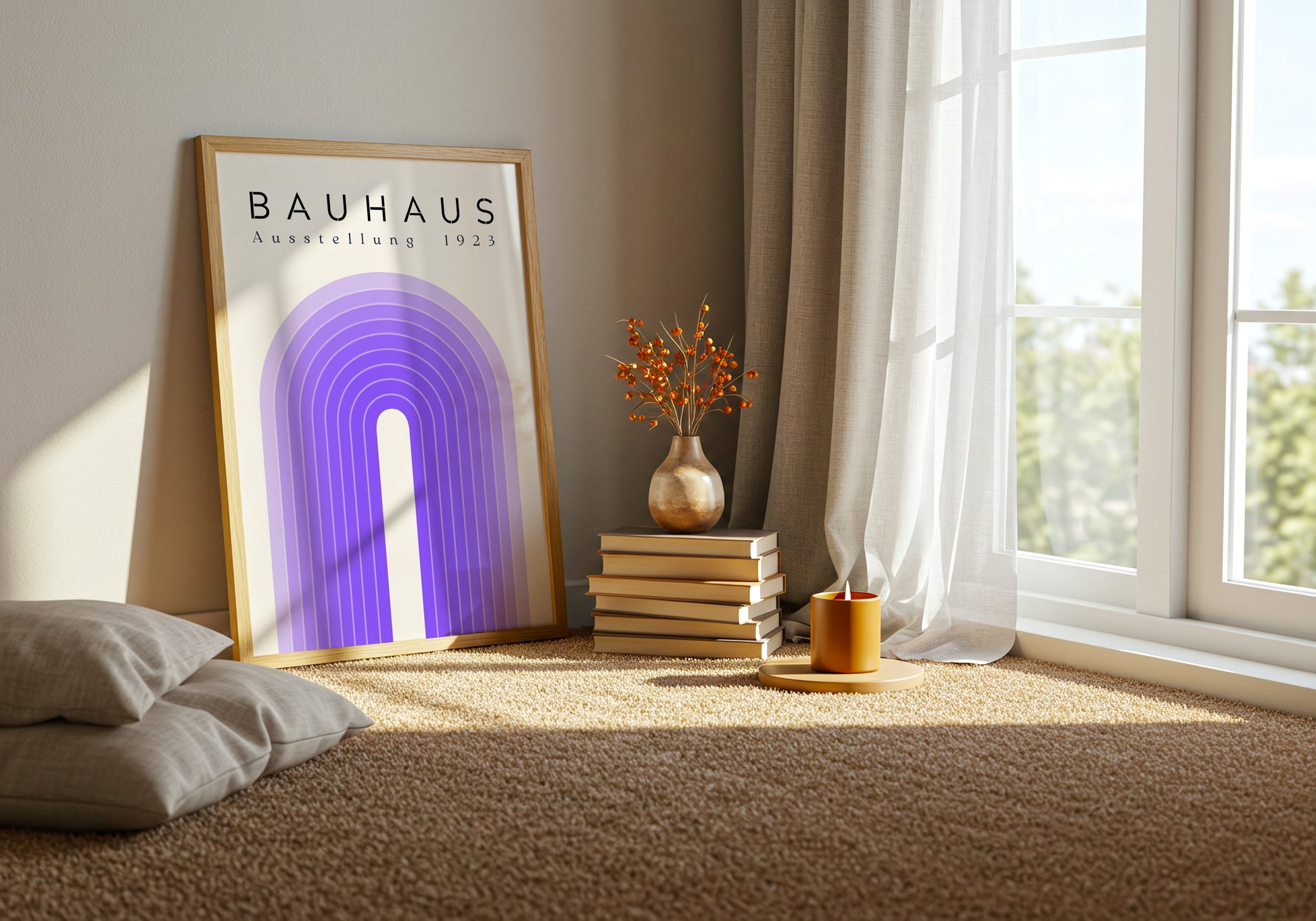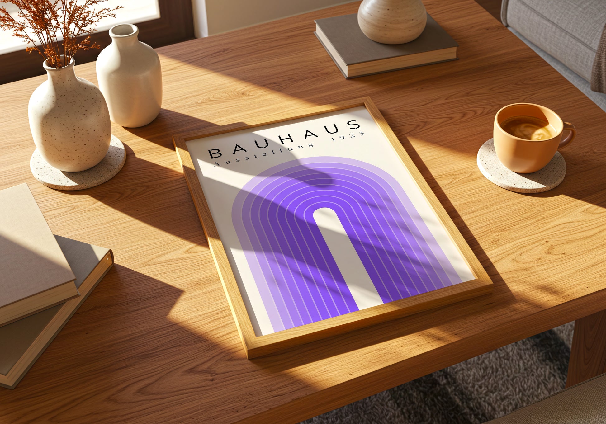 Poster geometrico ispirato al design Bauhaus, con linee armoniche e una palette nei toni del viola e crema. L’equilibrio tra forme morbide e minimalismo grafico crea un effetto visivo elegante e contemporaneo. Ideale per chi ama il design moderno, perfetto per studi, uffici o ambienti creativi.
