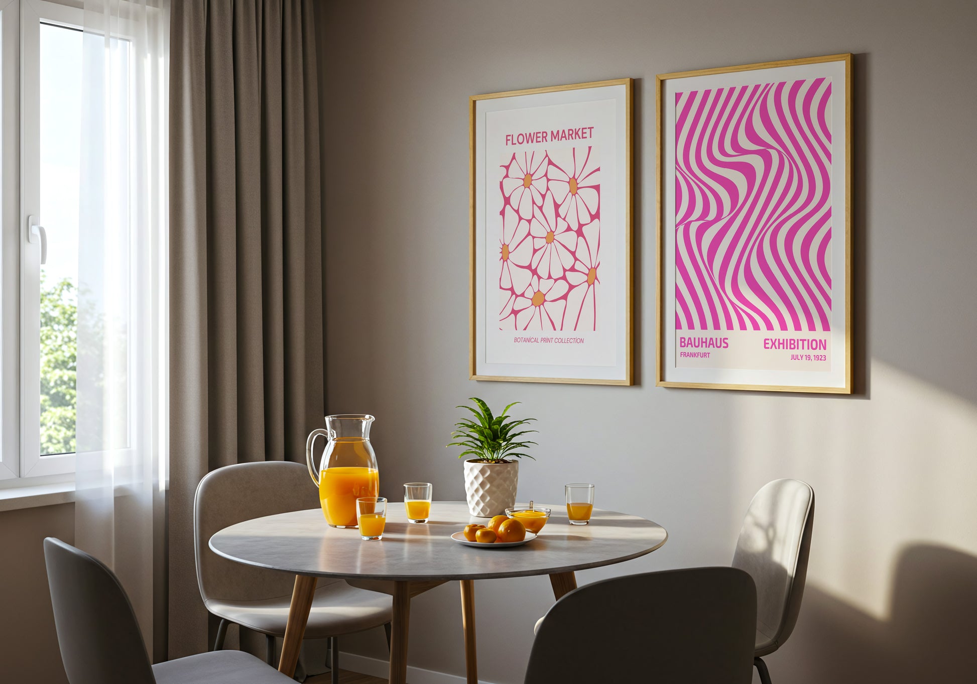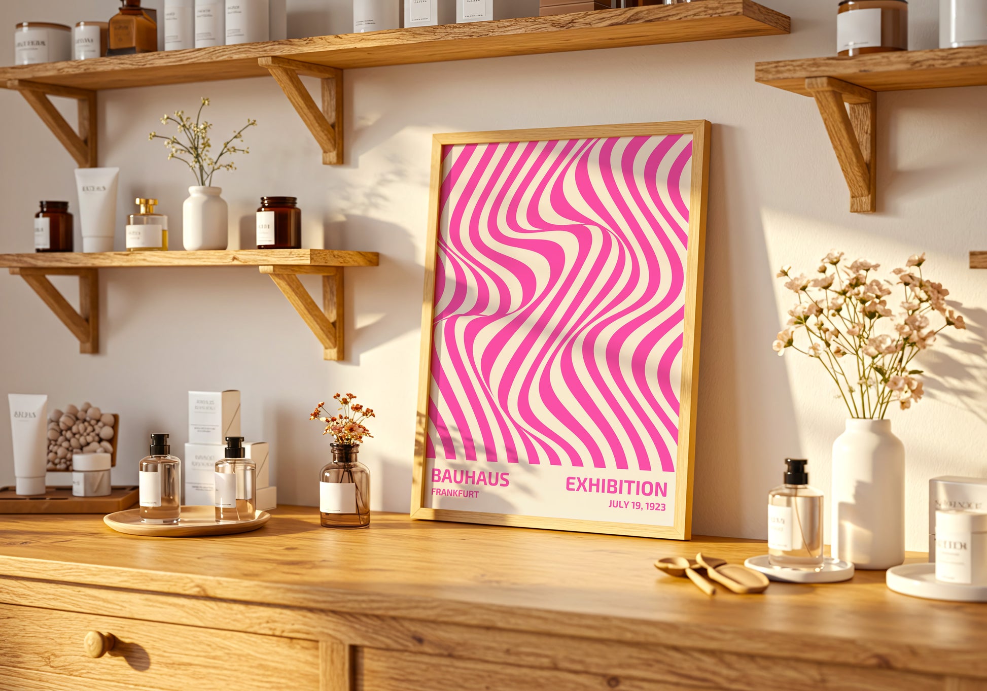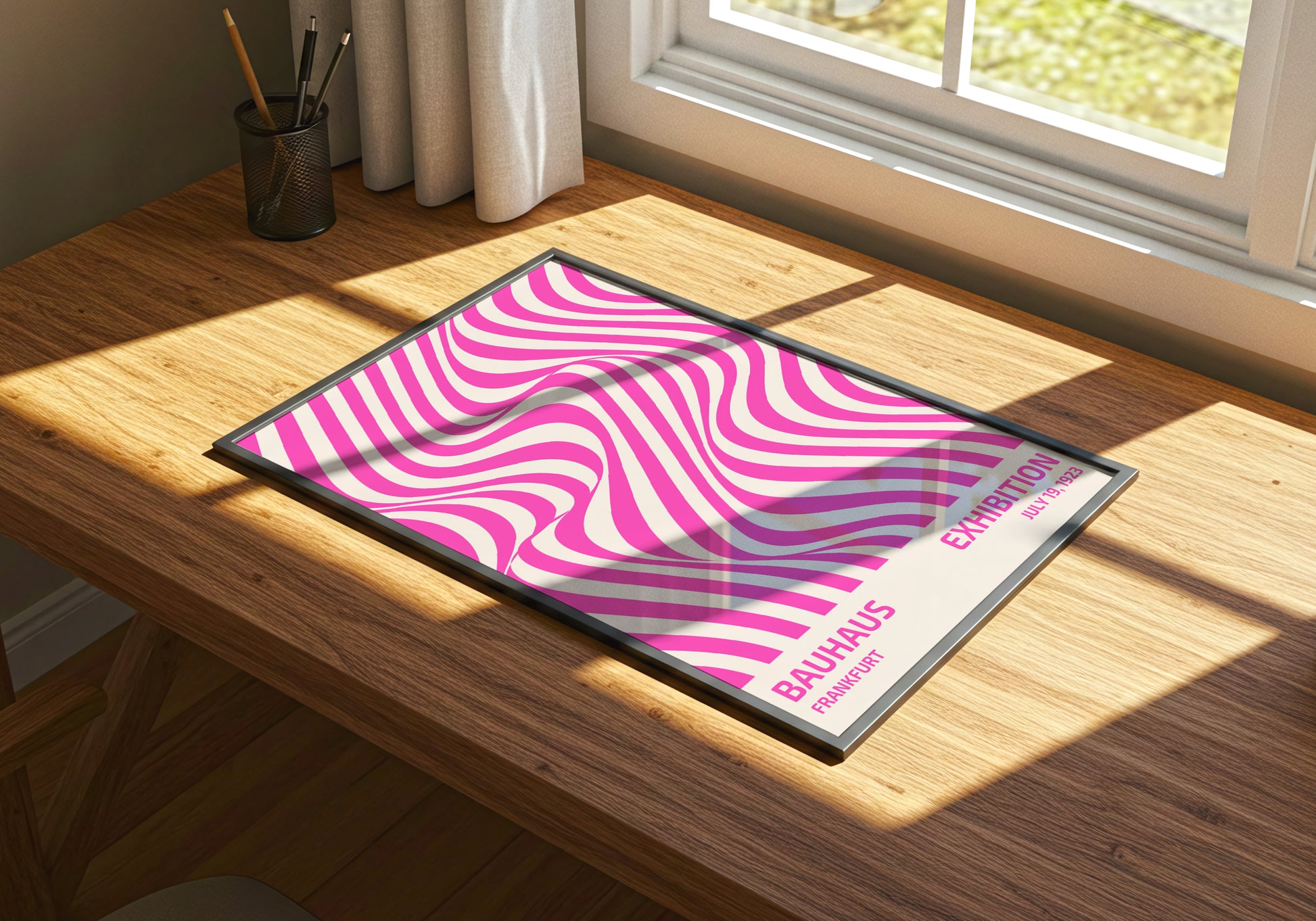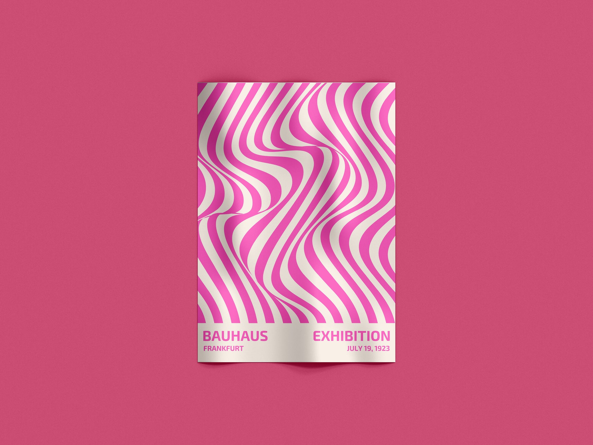 Poster ispirato alla mostra Bauhaus del 1923, reinterpretato in chiave moderna con un design optical nei toni vivaci del rosa e del bianco. Le linee ondulate creano un effetto visivo dinamico e accattivante, perfetto per chi ama il minimalismo grafico con un tocco pop. Ideale per arredare spazi creativi e contemporanei.