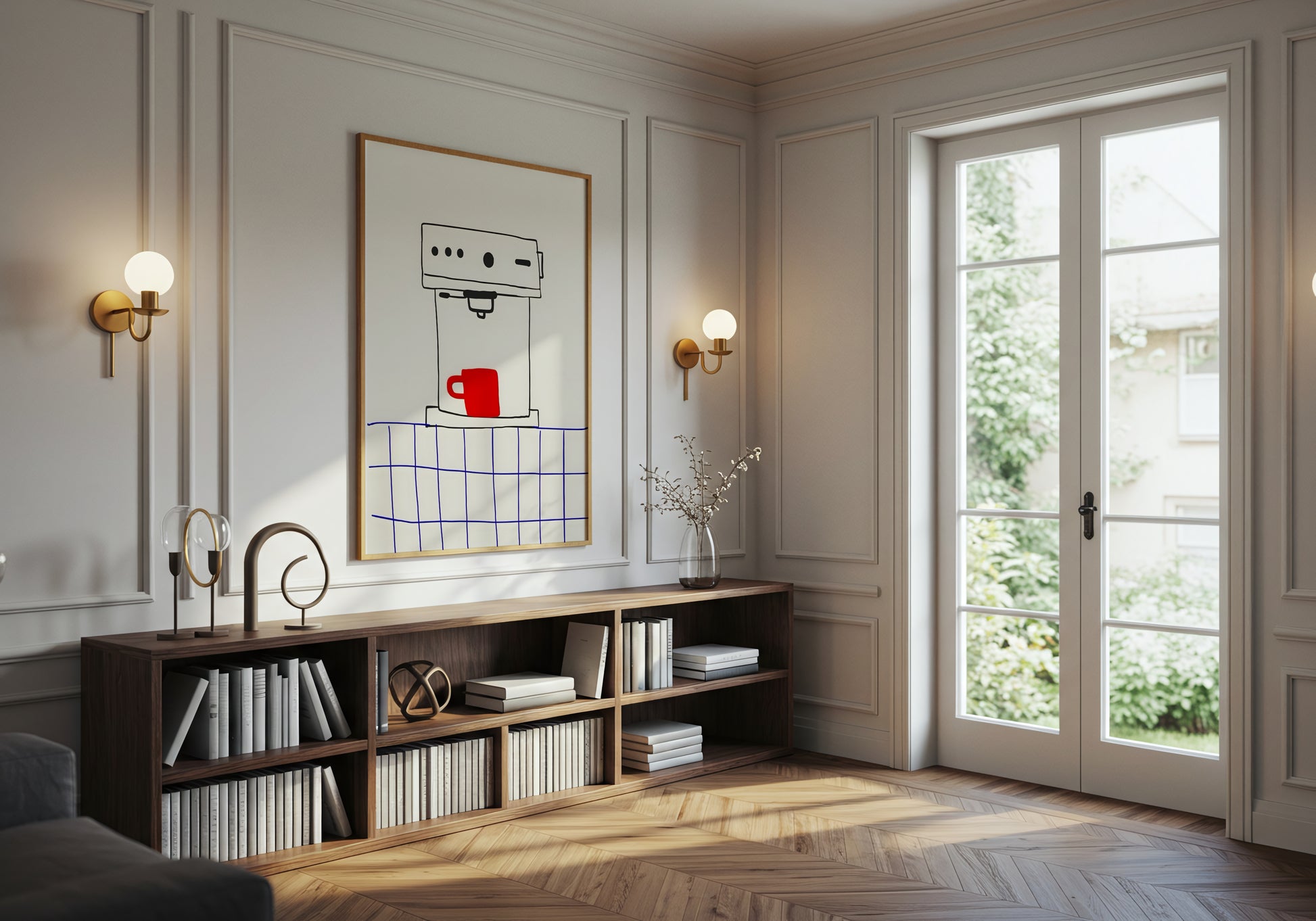 Un’illustrazione minimal che celebra il rito del caffè in tutta la sua semplicità. La macchina è disegnata con linee morbide e spontanee, mentre la tazza rossa al centro cattura subito l’attenzione e aggiunge un tocco di calore. Il piano a quadretti blu richiama una cucina autentica e un po’ nostalgica, trasformando una scena quotidiana in qualcosa di leggero e simpatico.
