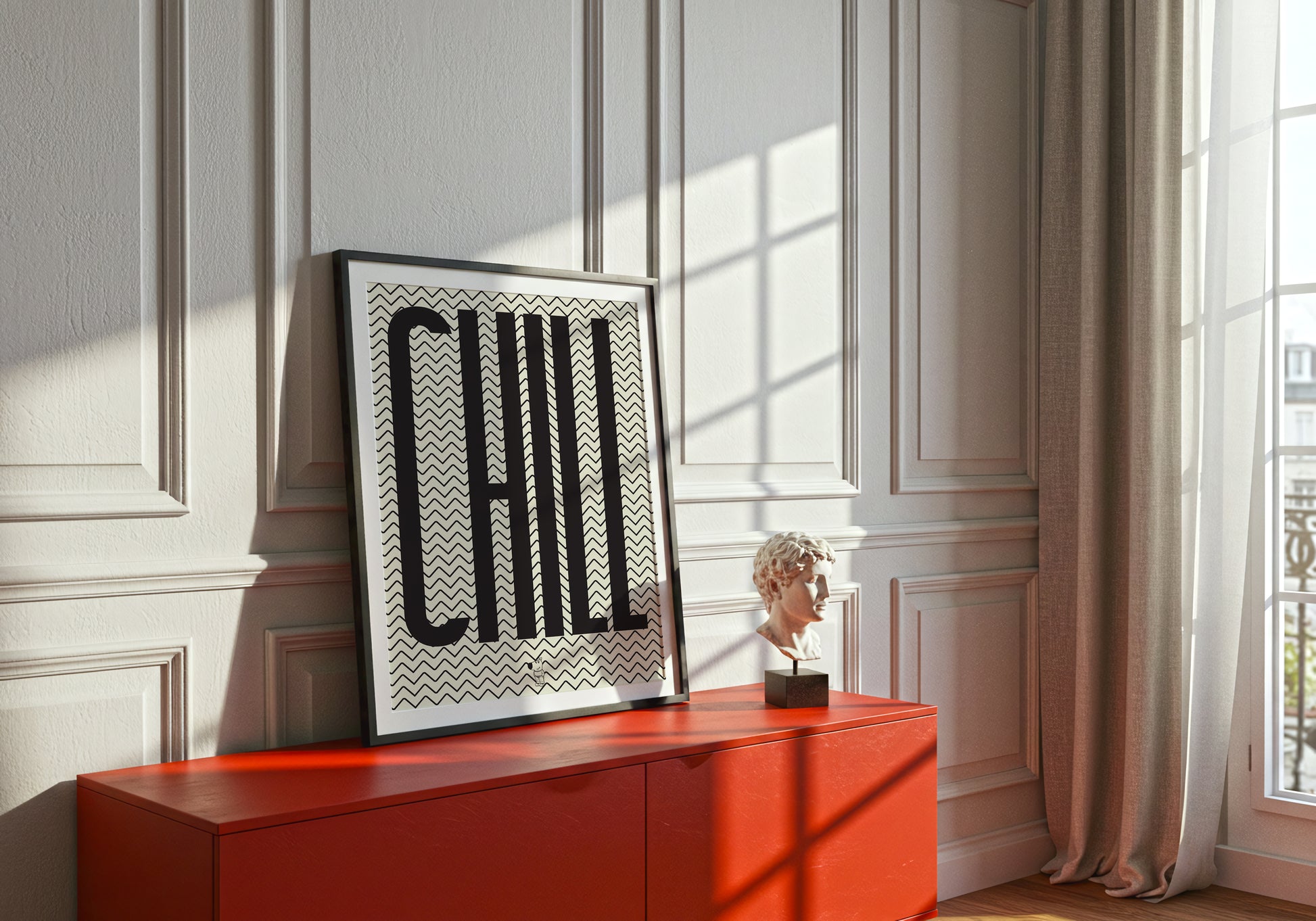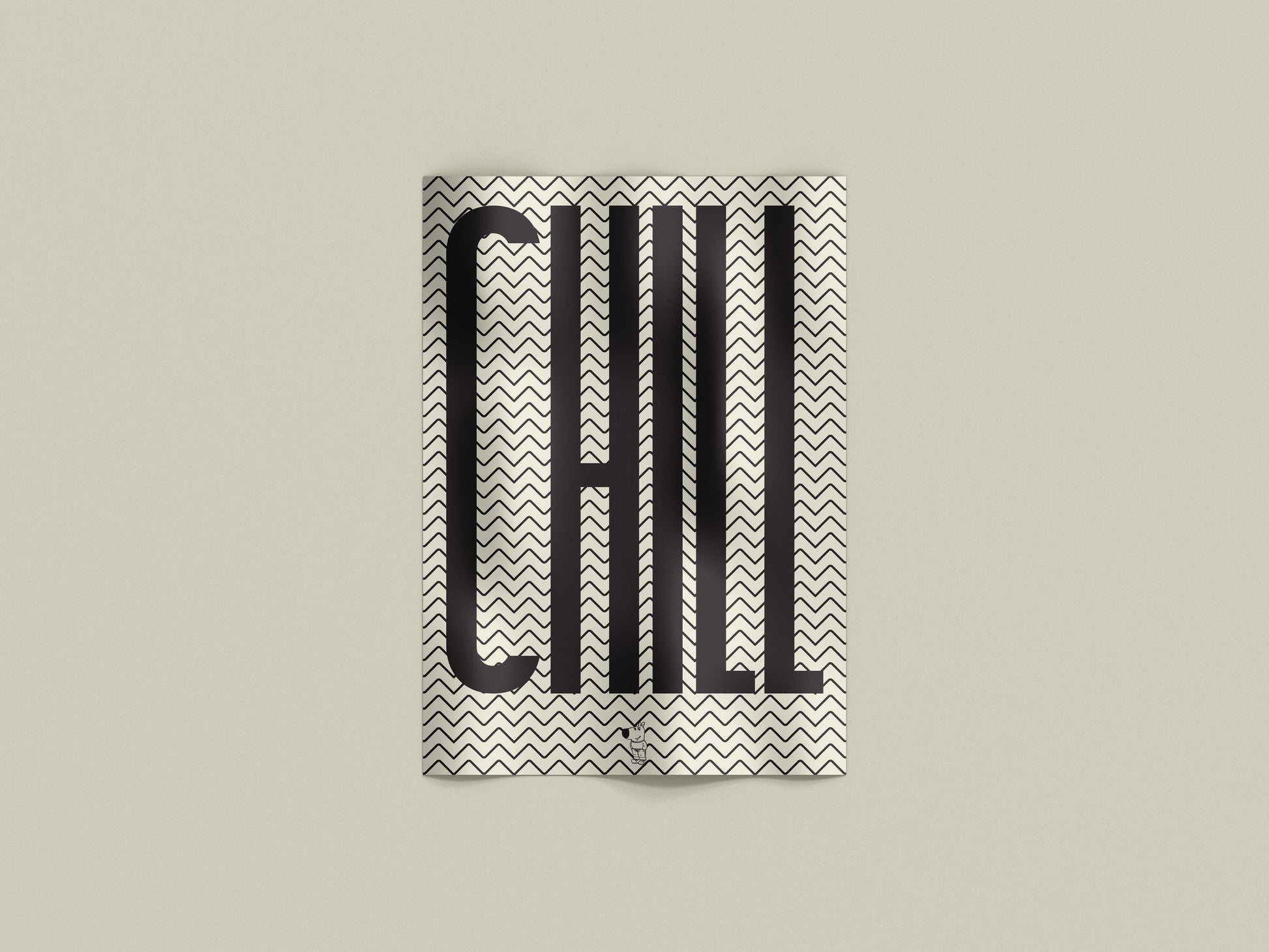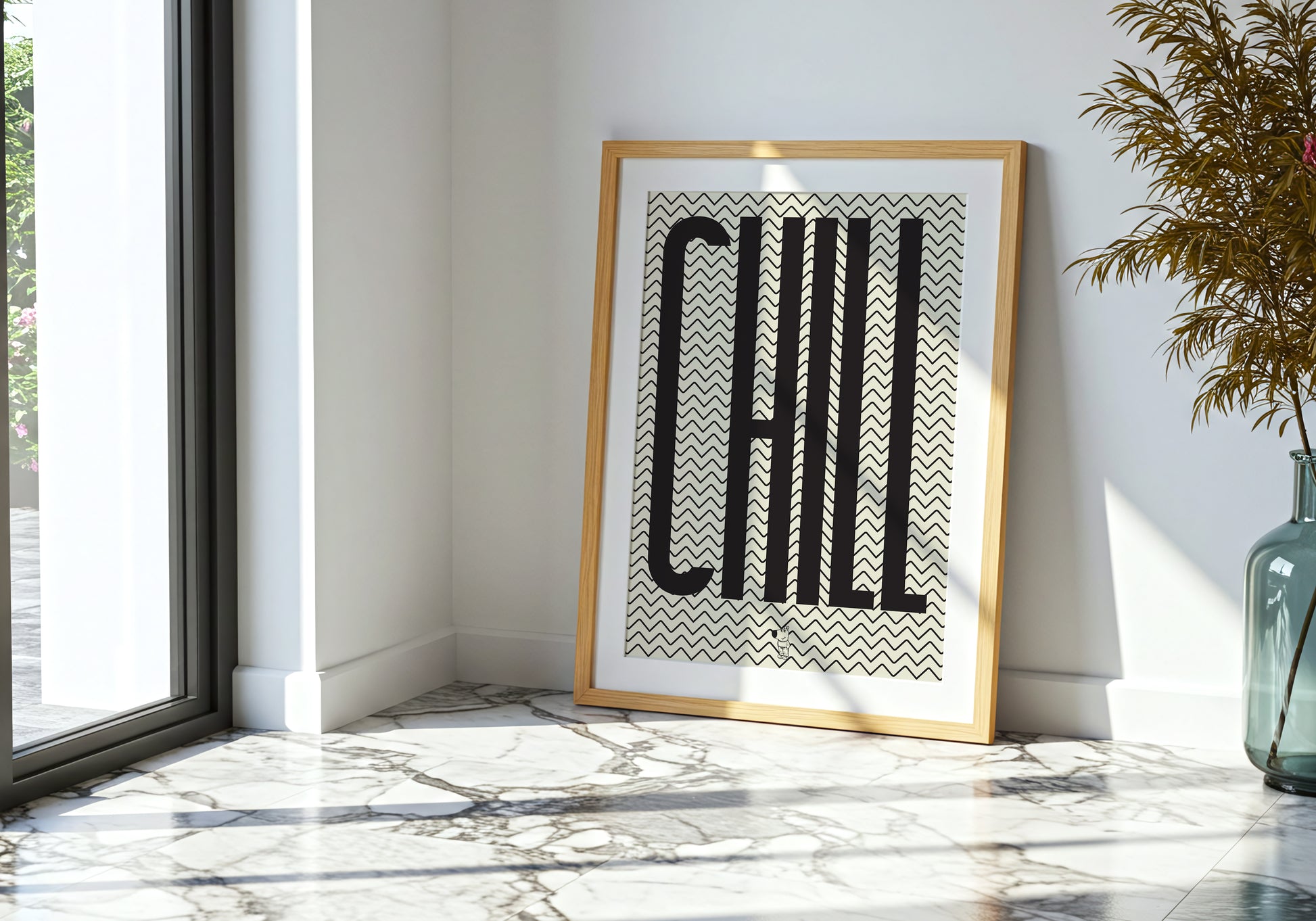 Un poster tipografico dal carattere deciso: la parola CHILL domina la scena su uno sfondo a zig-zag che crea ritmo e movimento. Un design semplice ma d’impatto, perfetto per dare un tocco fresco, ironico e super rilassato a qualsiasi ambiente.