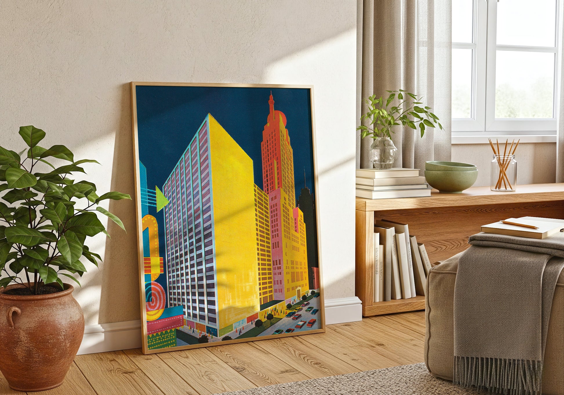 Un poster che cattura l’energia scintillante della grande città: palazzi illuminati, colori vibranti e un’atmosfera da metropoli che non dorme mai. Lo stile rétro e grafico richiama le iconiche locandine urbane del Novecento, trasformando la scena in un’esplosione visiva di luci e movimento.