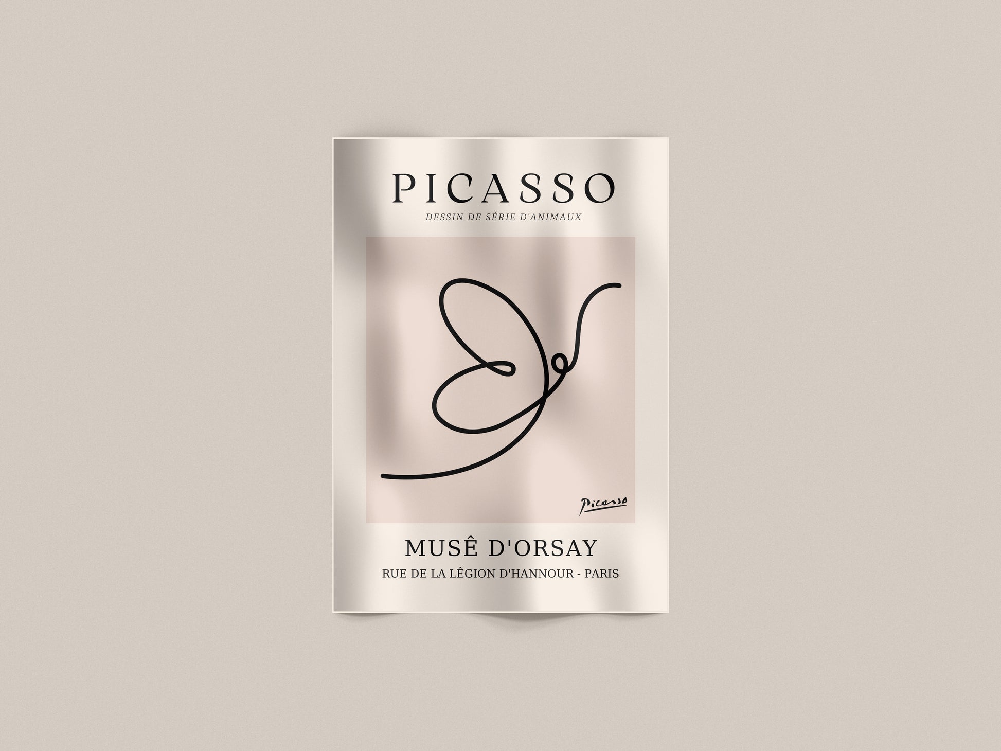 Poster in stile museale caratterizzato da un elegante disegno a linea continua, essenziale e fluido, capace di suggerire una forma animale con un solo gesto grafico. La composizione minimalista, insieme alla tipografia raffinata e all’impostazione da manifesto espositivo, crea un’estetica pulita, sofisticata e perfetta per spazi moderni e luminosi.