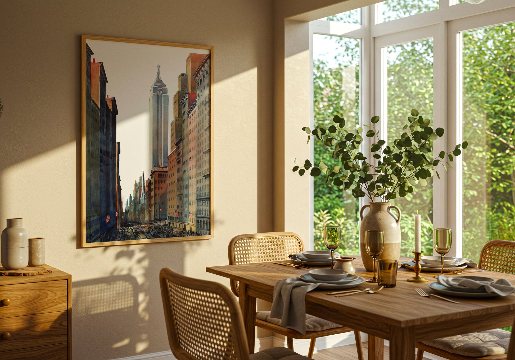 Toni caldi e dettagli illustrati creano una scena metropolitana dal fascino vintage. Perfetto per aggiungere carattere e profondità agli ambienti.