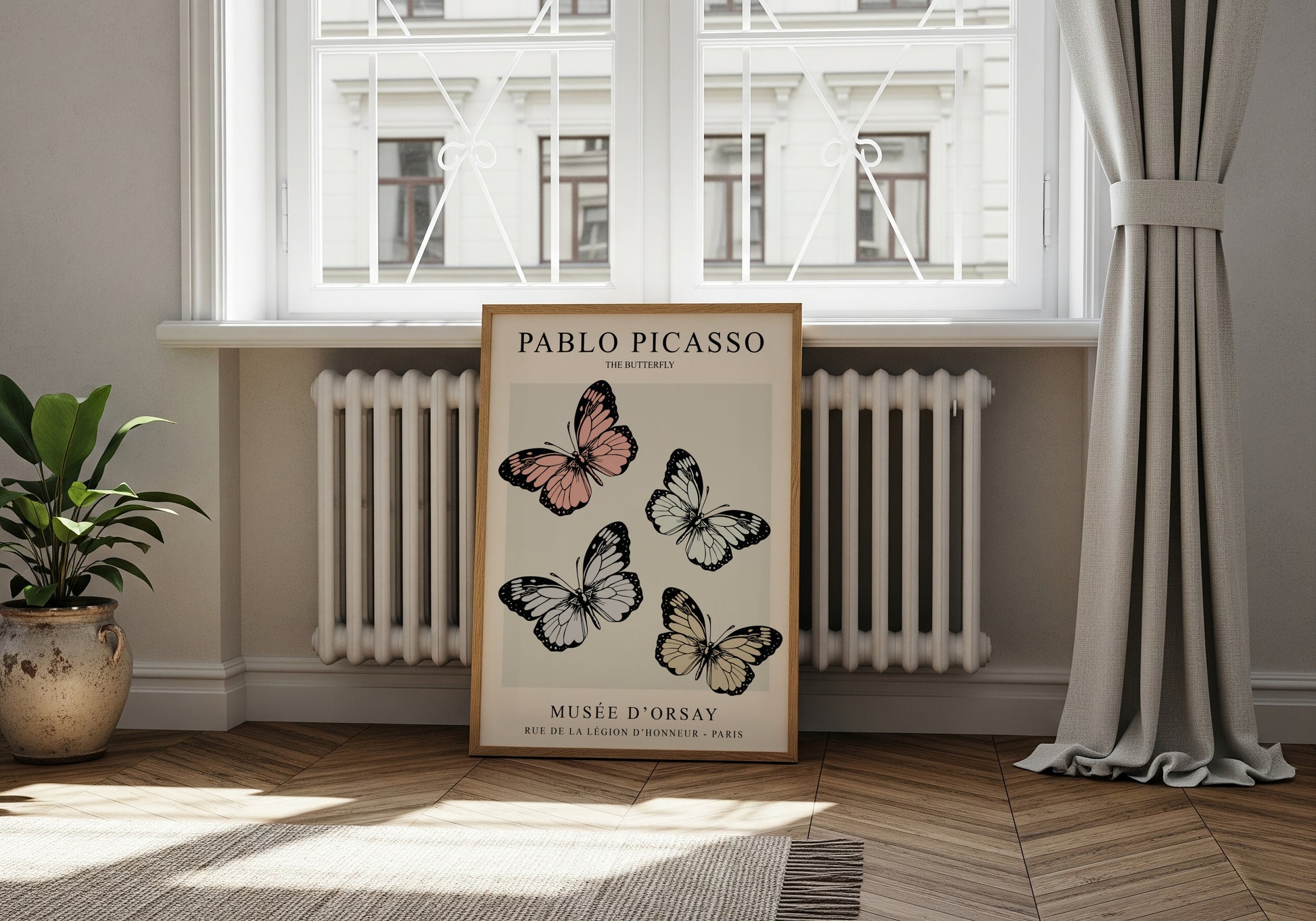 Poster ispirato all’estetica museale, con quattro farfalle illustrate in toni delicati su fondo neutro. La composizione pulita e bilanciata, unita alla tipografia elegante, richiama i manifesti espositivi delle grandi gallerie parigine.