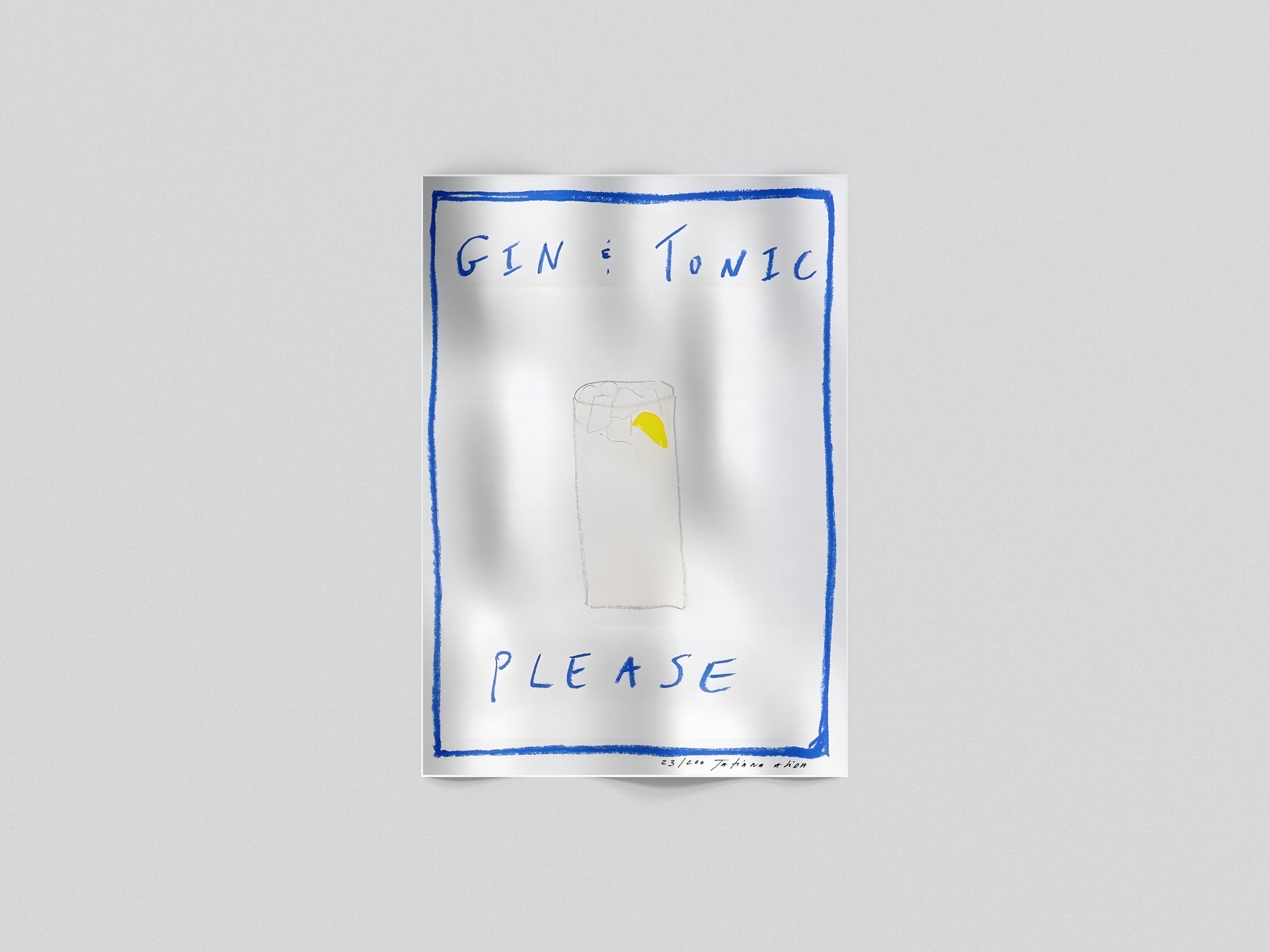Un poster leggero e brillante dedicato al classico dei classici: il Gin Tonic. Il tratto a mano libera, la cornice blu irregolare e il tocco di giallo del limone danno all’illustrazione un’aria vivace e spensierata. Un design essenziale ma pieno di carattere, perfetto per chi ama i drink semplici, freschi e senza troppe complicazioni.