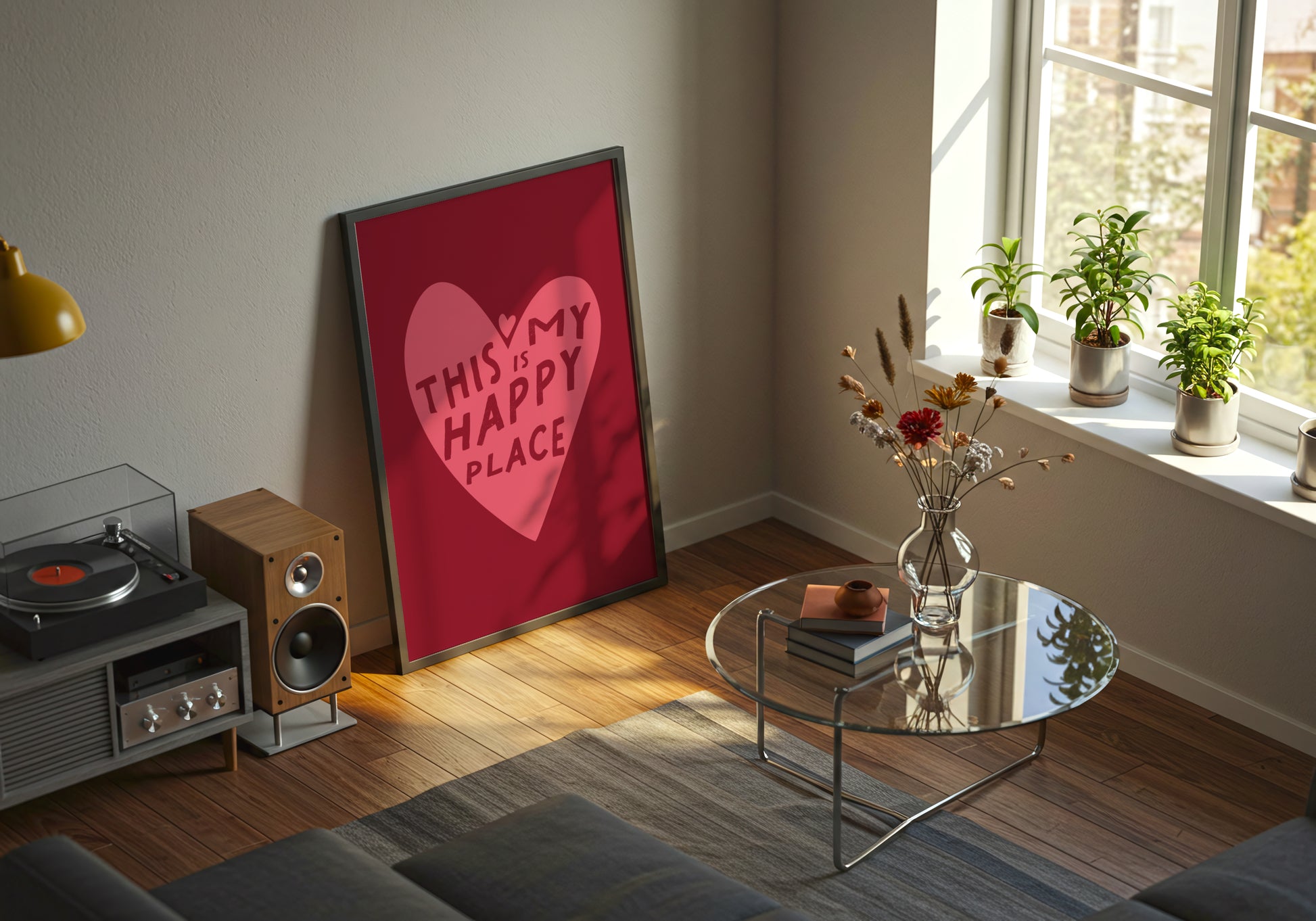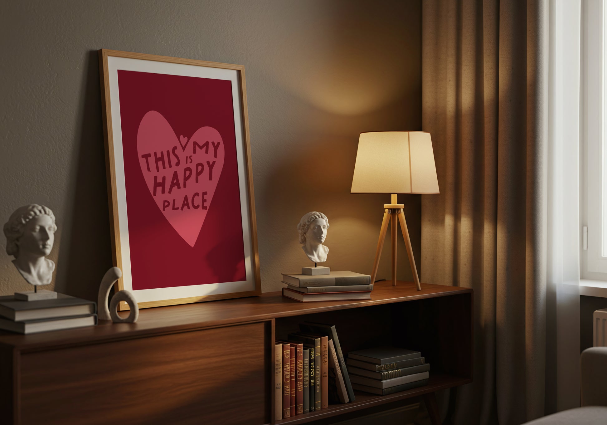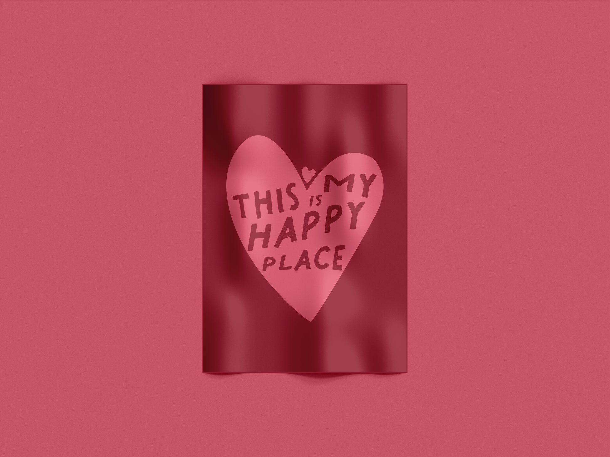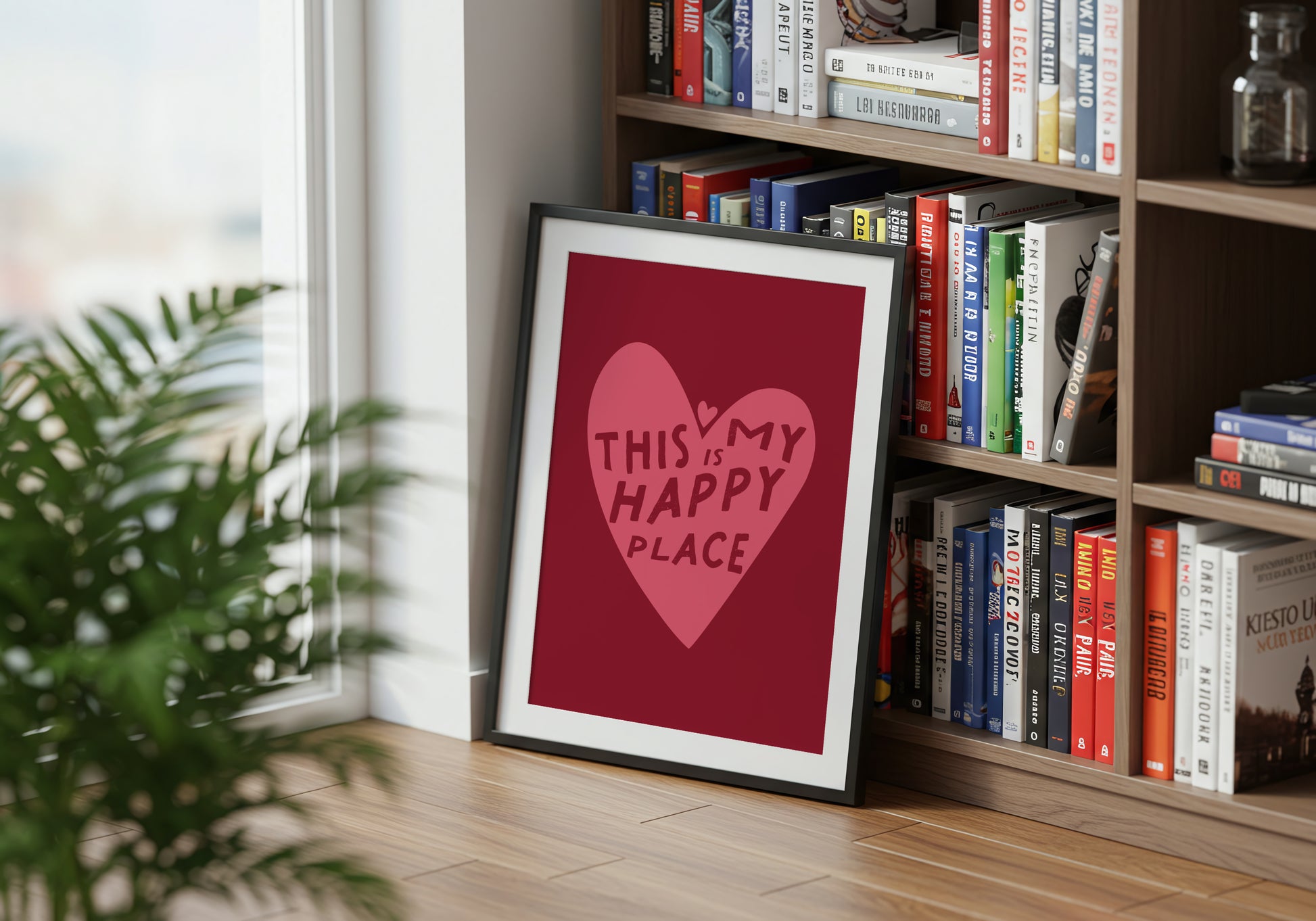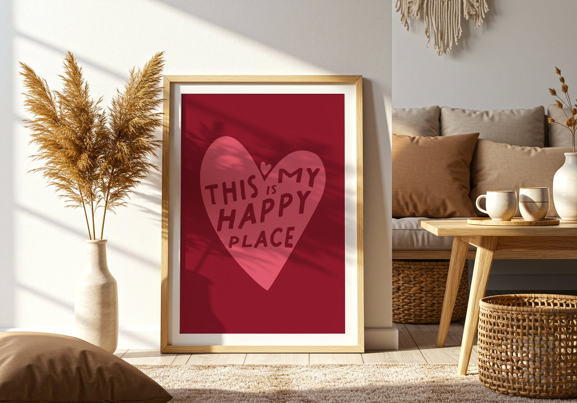Poster vivace con cuore rosa su fondo bordeaux e scritta This Is My Happy Place.