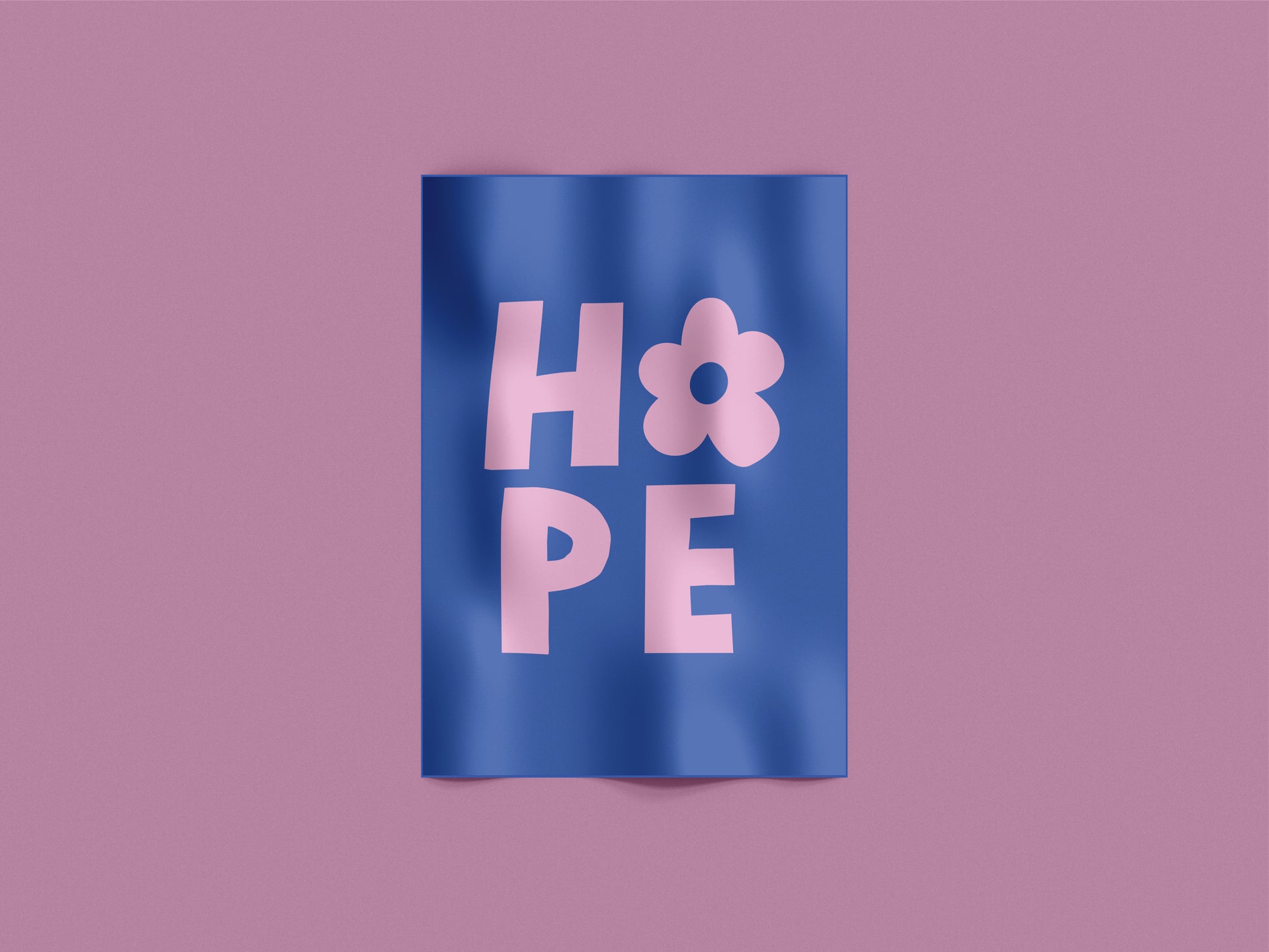 Poster minimal con la parola HOPE in rosa su sfondo blu acceso, con la “O” sostituita da un fiore stilizzato.