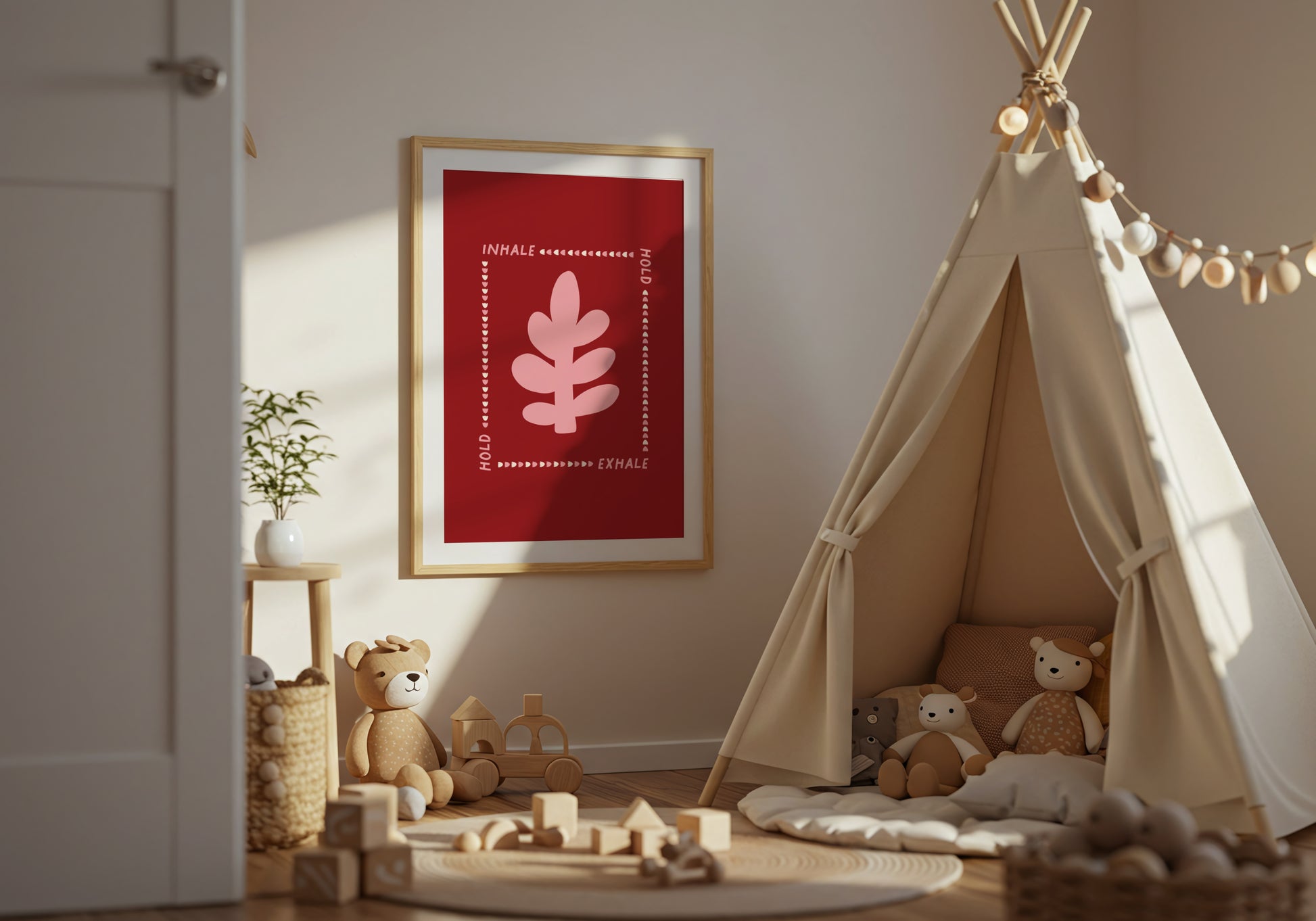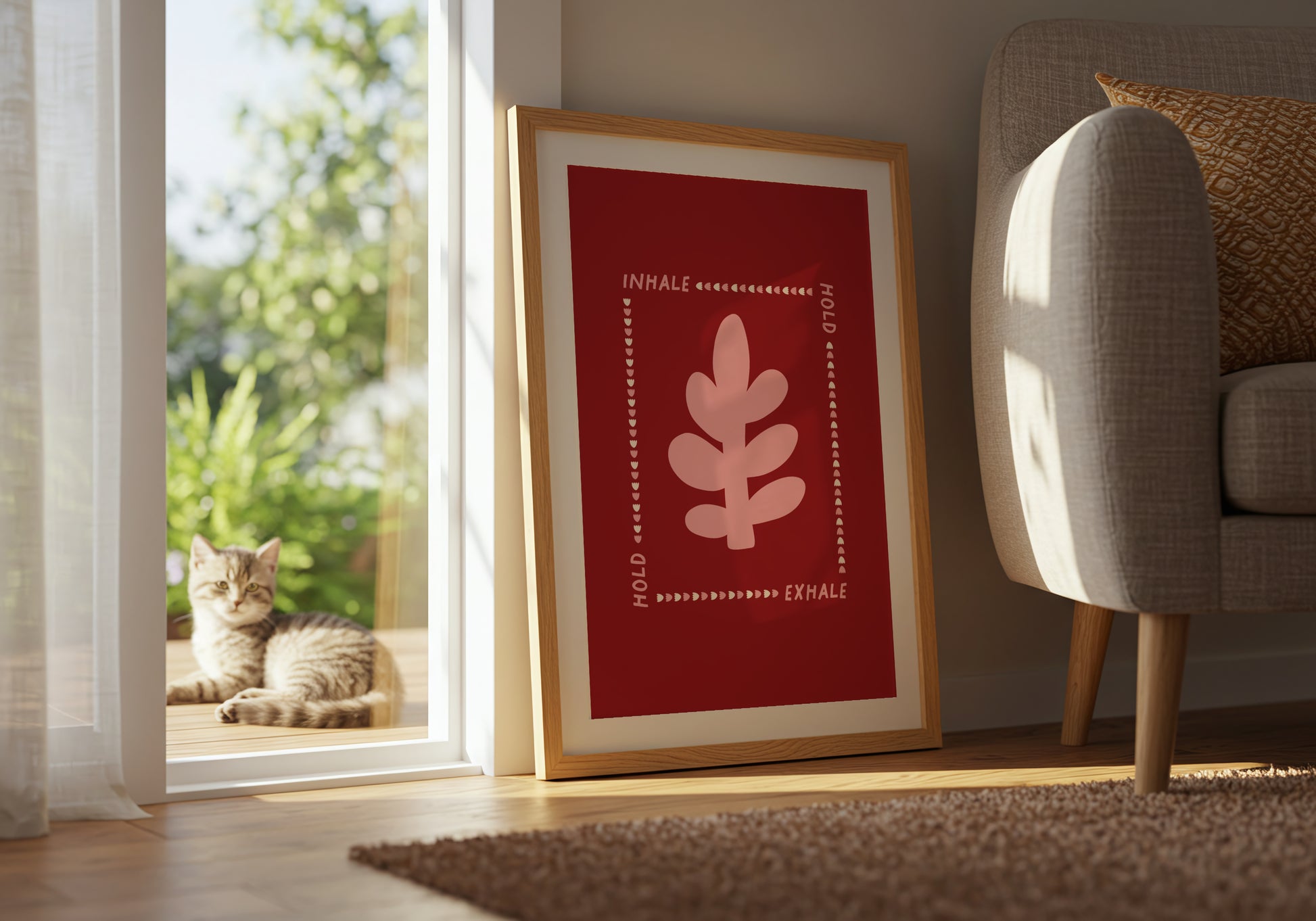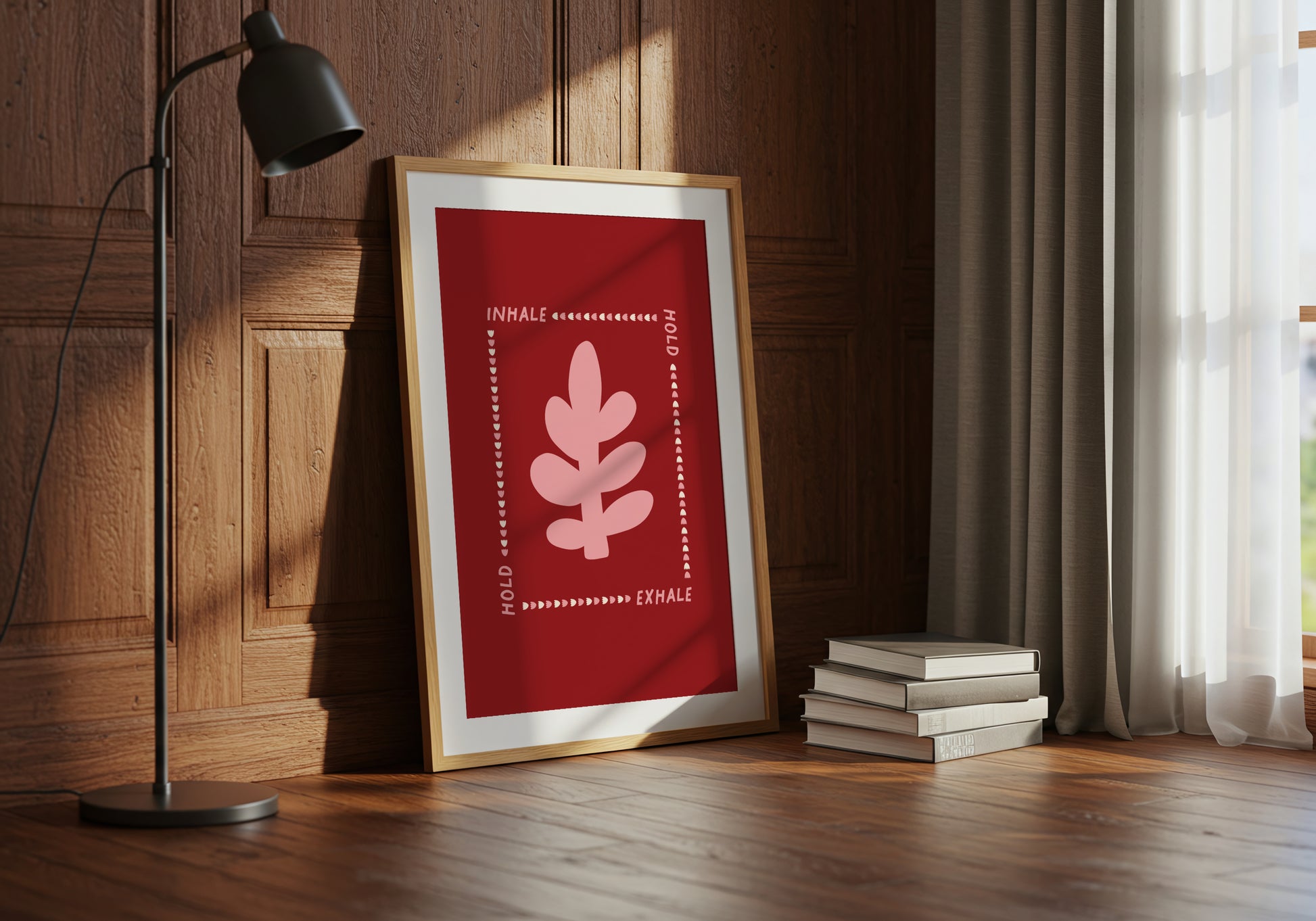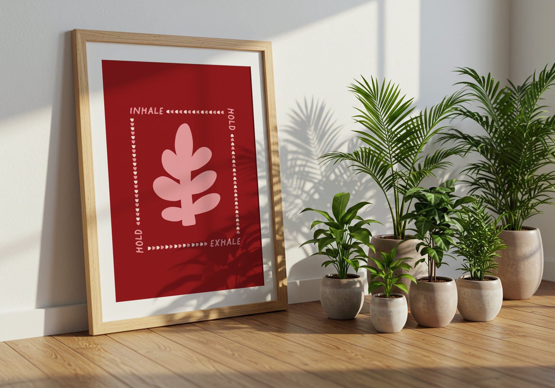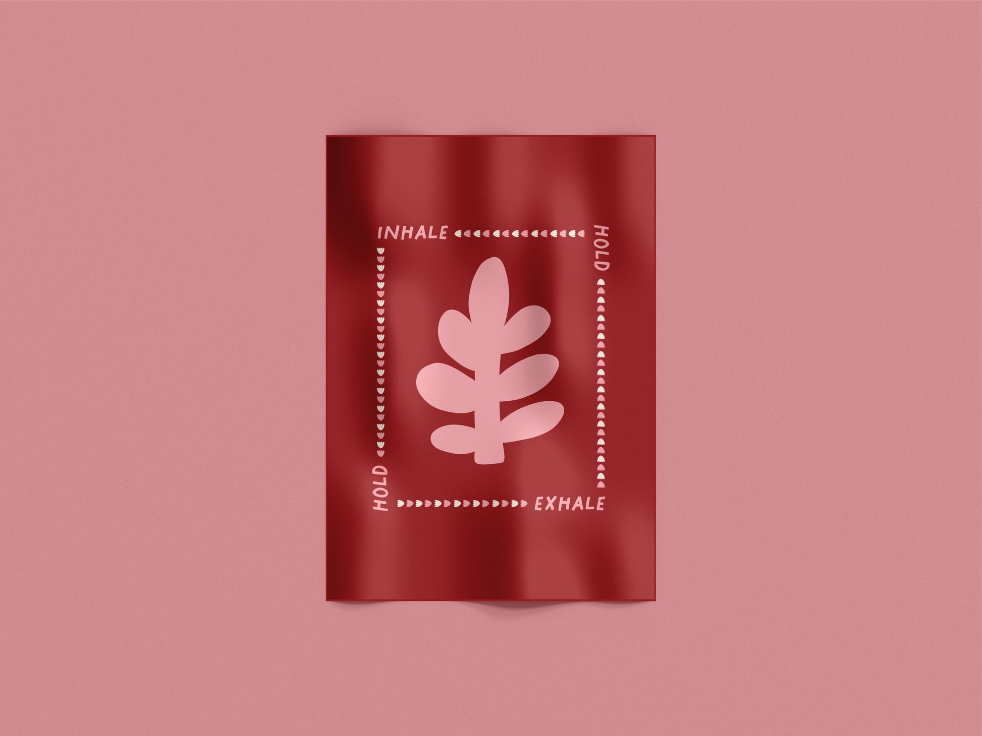 Poster minimalista con foglia stilizzata e scritte Inhale · Hold · Exhale, nei toni rilassanti del rosa e del bordeaux.