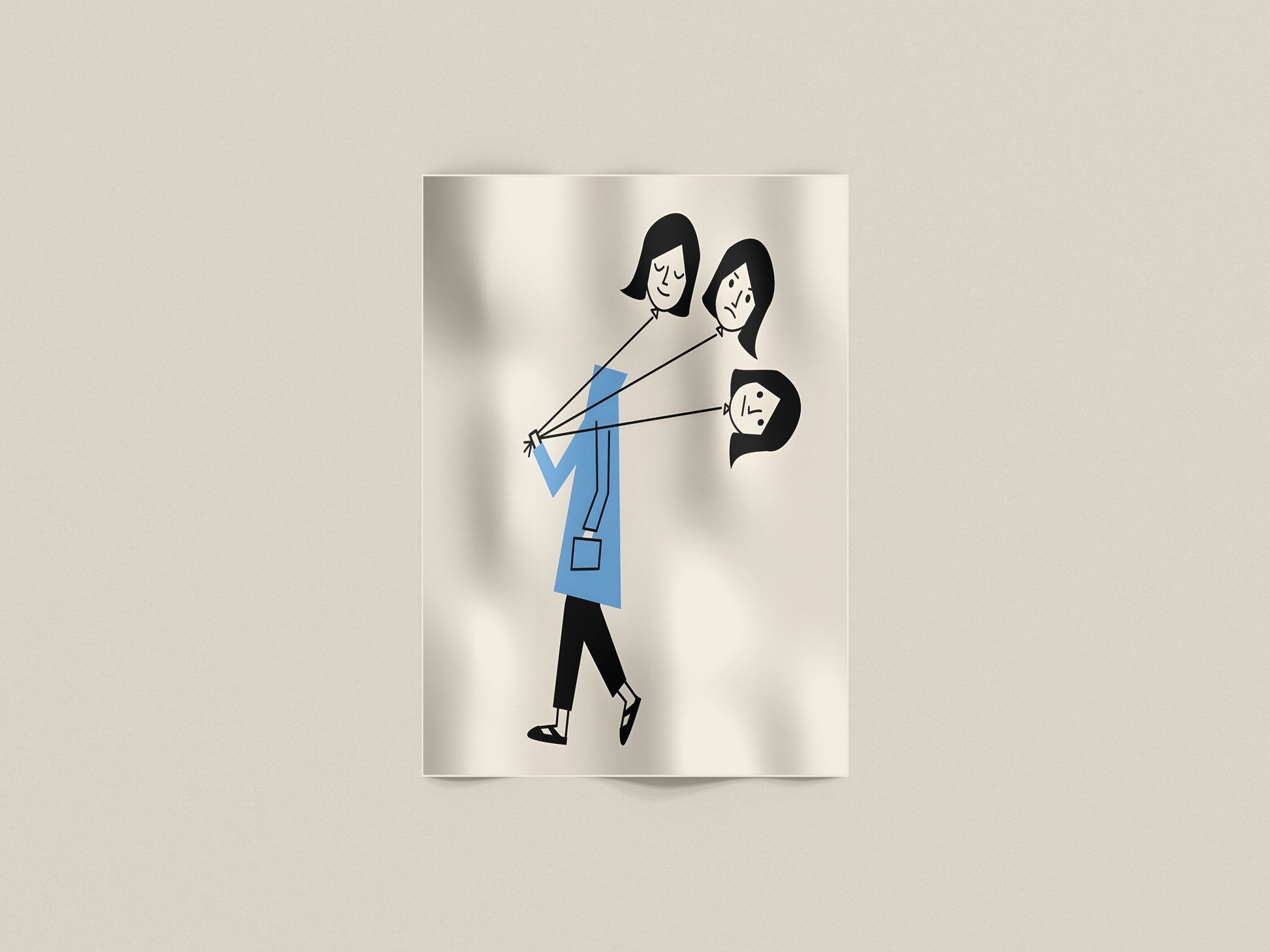 Un’illustrazione divertente e sorprendentemente vera: una figura che cammina trascinando con sé tre diverse espressioni, come se dovesse scegliere quale “faccia” indossare oggi.