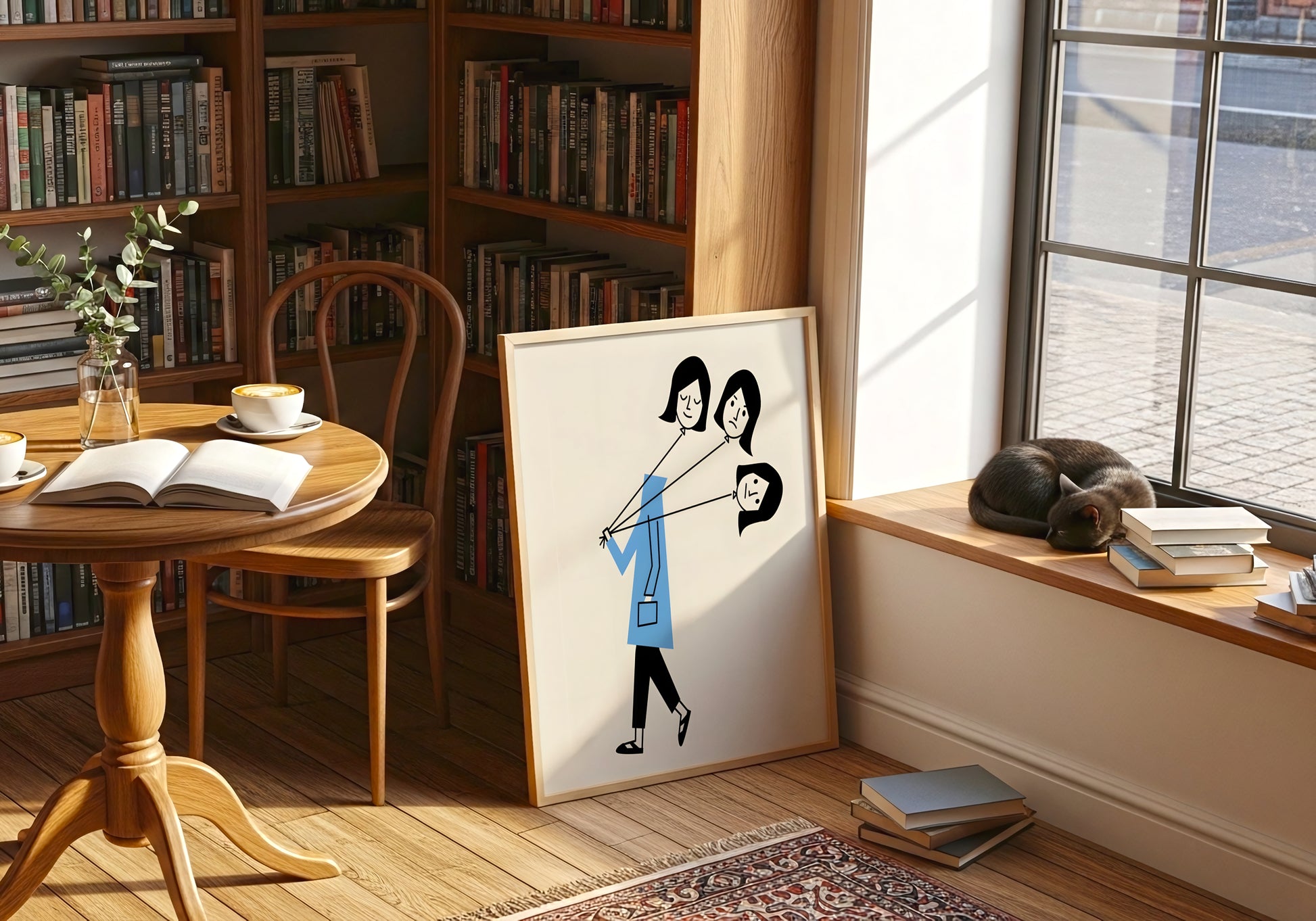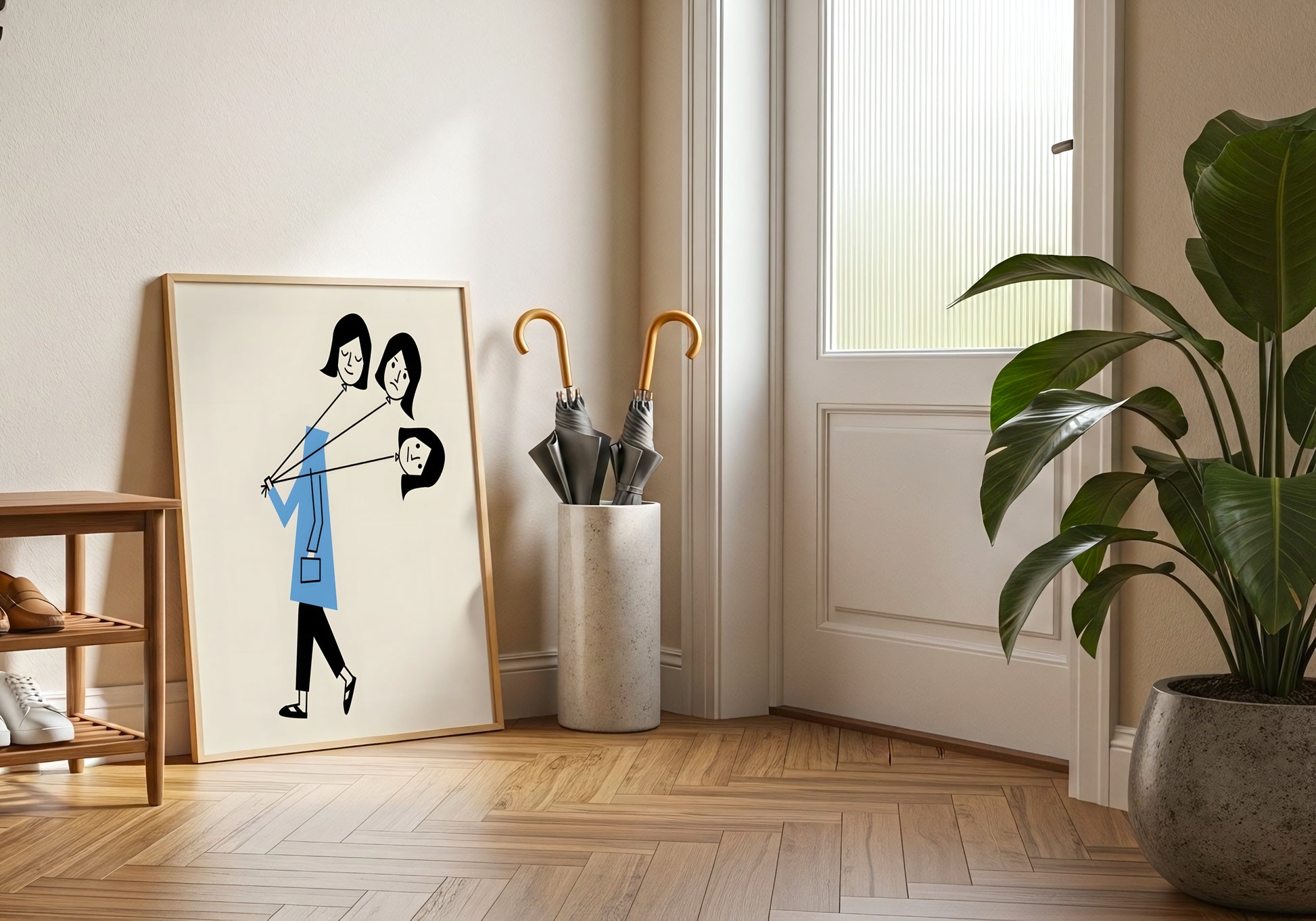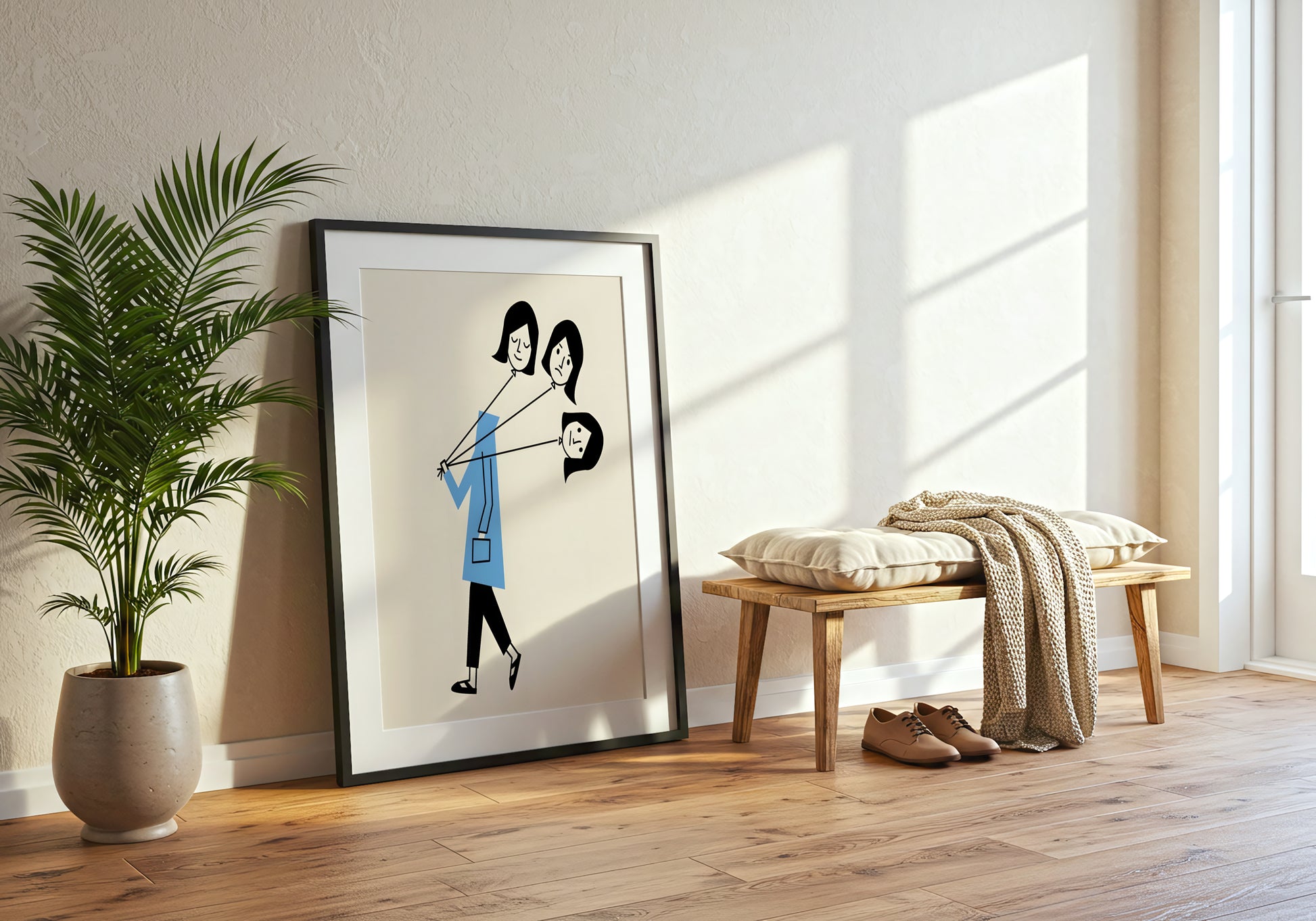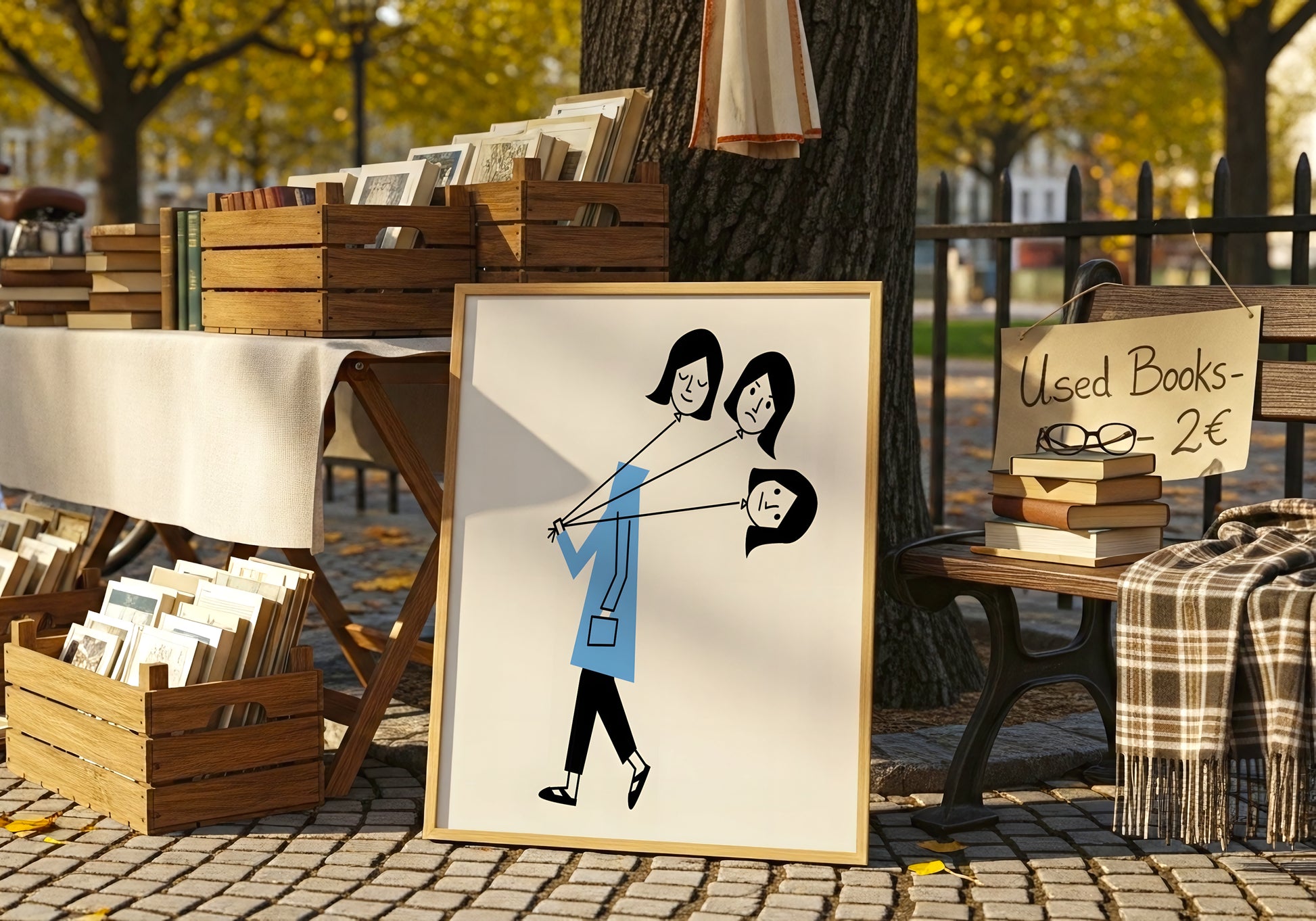 Il tratto minimal, quasi da vignetta editoriale, rende il messaggio immediato: ogni giorno è un piccolo trasloco di emozioni — alcune leggere, alcune un po’ storte, altre pronte a prendersi la scena.
