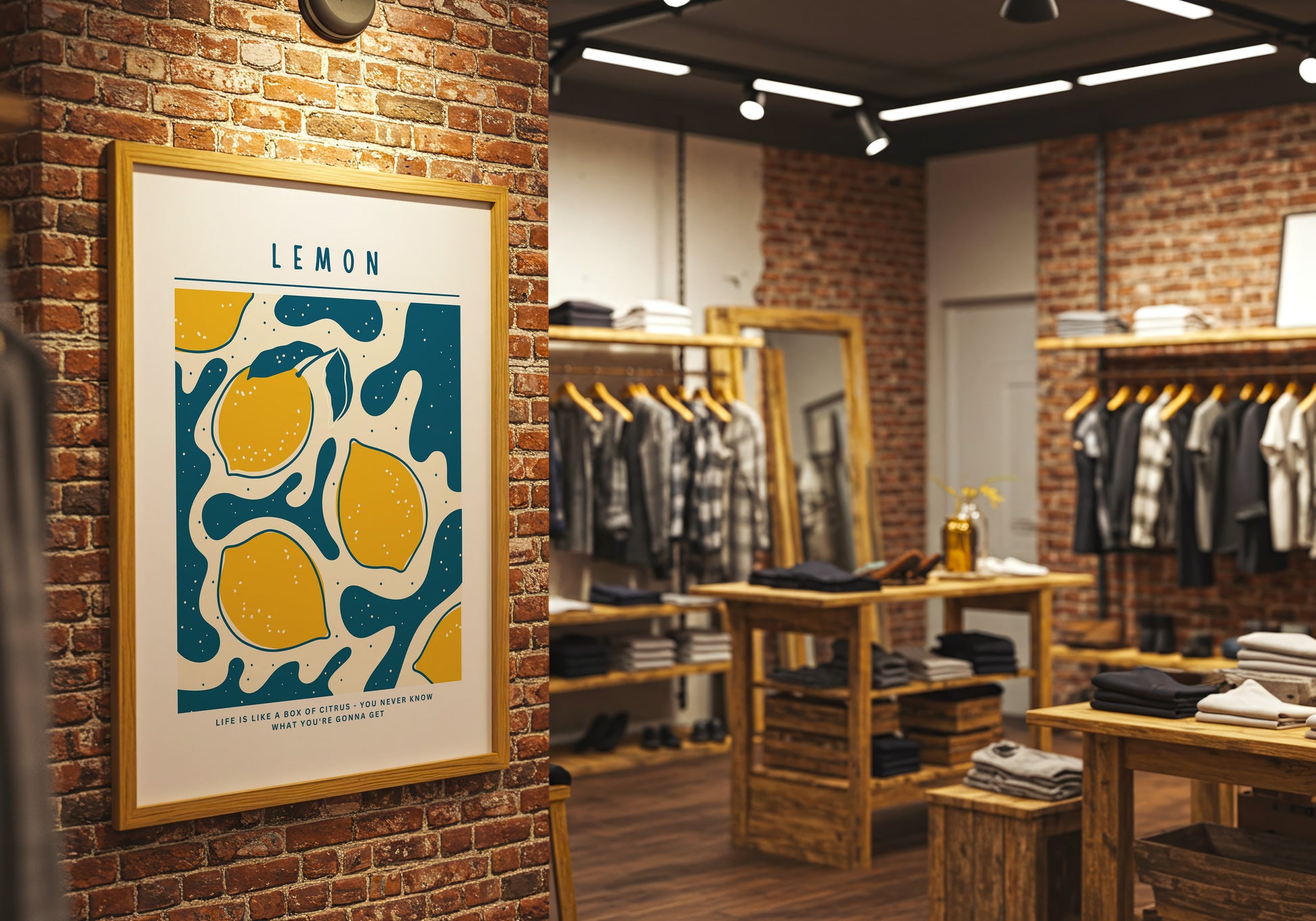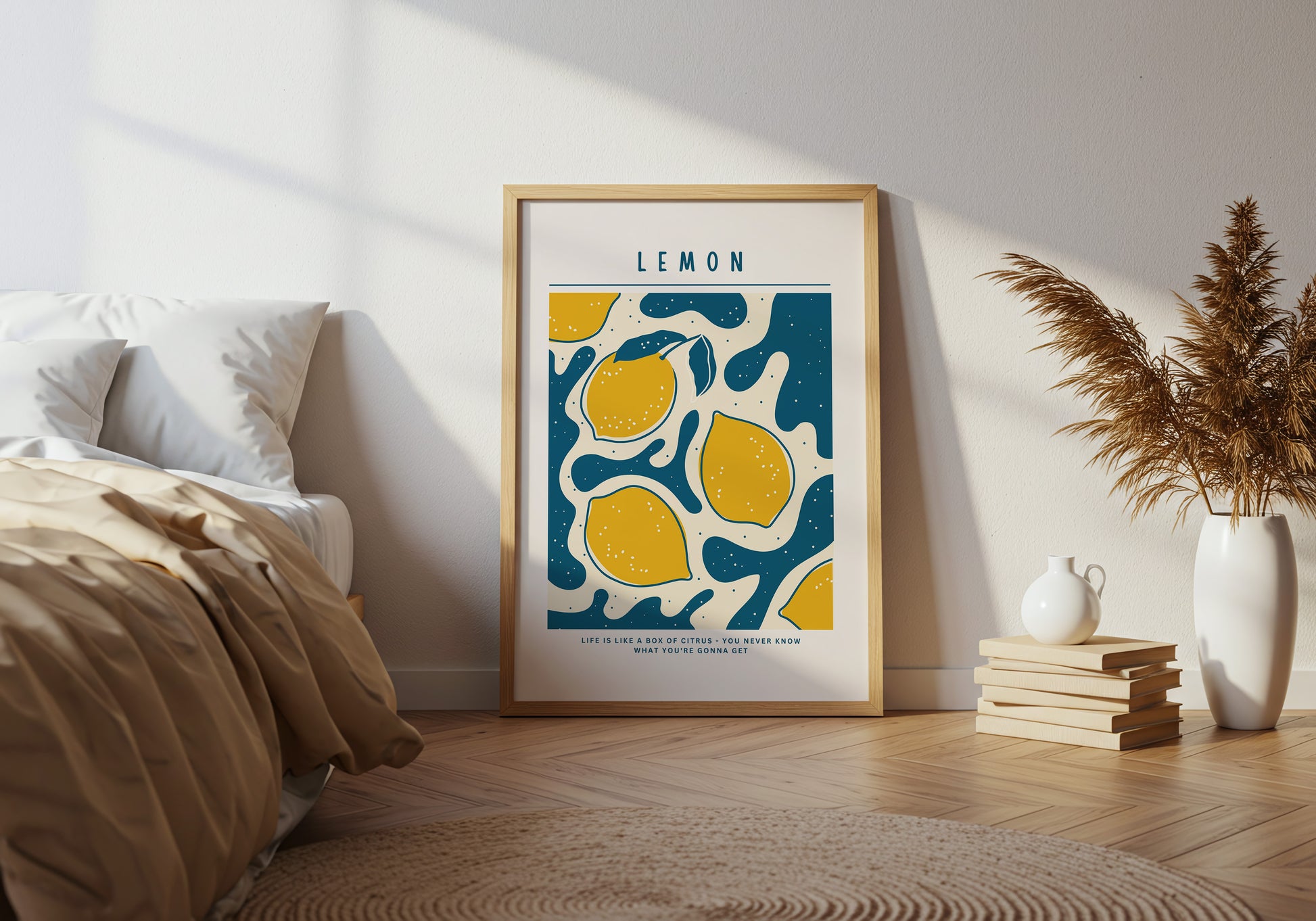 Un poster dal design fresco e moderno che celebra l’essenza vibrante del limone. Le tonalità di giallo e blu evocano il profumo d’estate e l’energia del Mediterraneo, con una composizione grafica dinamica e leggera. Perfetto per dare un tocco di colore e positività alla tua cucina, al soggiorno o a uno spazio creativo.