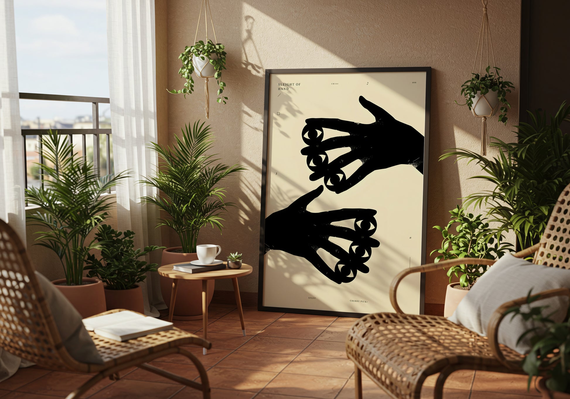 Un’immagine dal tono enigmatico, in cui due mani nere stilizzate emergono su fondo chiaro, decorate con motivi a forma di occhi che trasformano le dita in simboli inquieti e osservanti. La composizione, semplice ma intensa, crea un’atmosfera misteriosa e quasi surreale, perfetta per chi ama un’estetica grafica forte e concettuale.