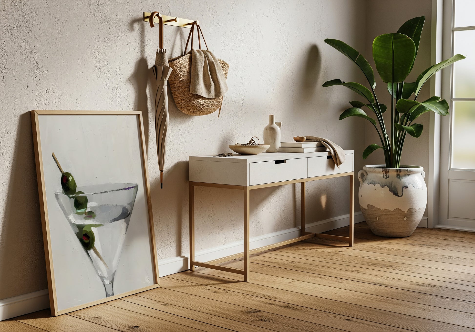 Un’immagine pulita e raffinata che ritrae un martini cristallino decorato con olive verdi su stuzzicadenti. Le pennellate morbide e le tonalità chiare creano un’atmosfera fresca e sofisticata, ideale per ambienti moderni, cucine dal gusto ricercato o angoli dedicati al buon bere.