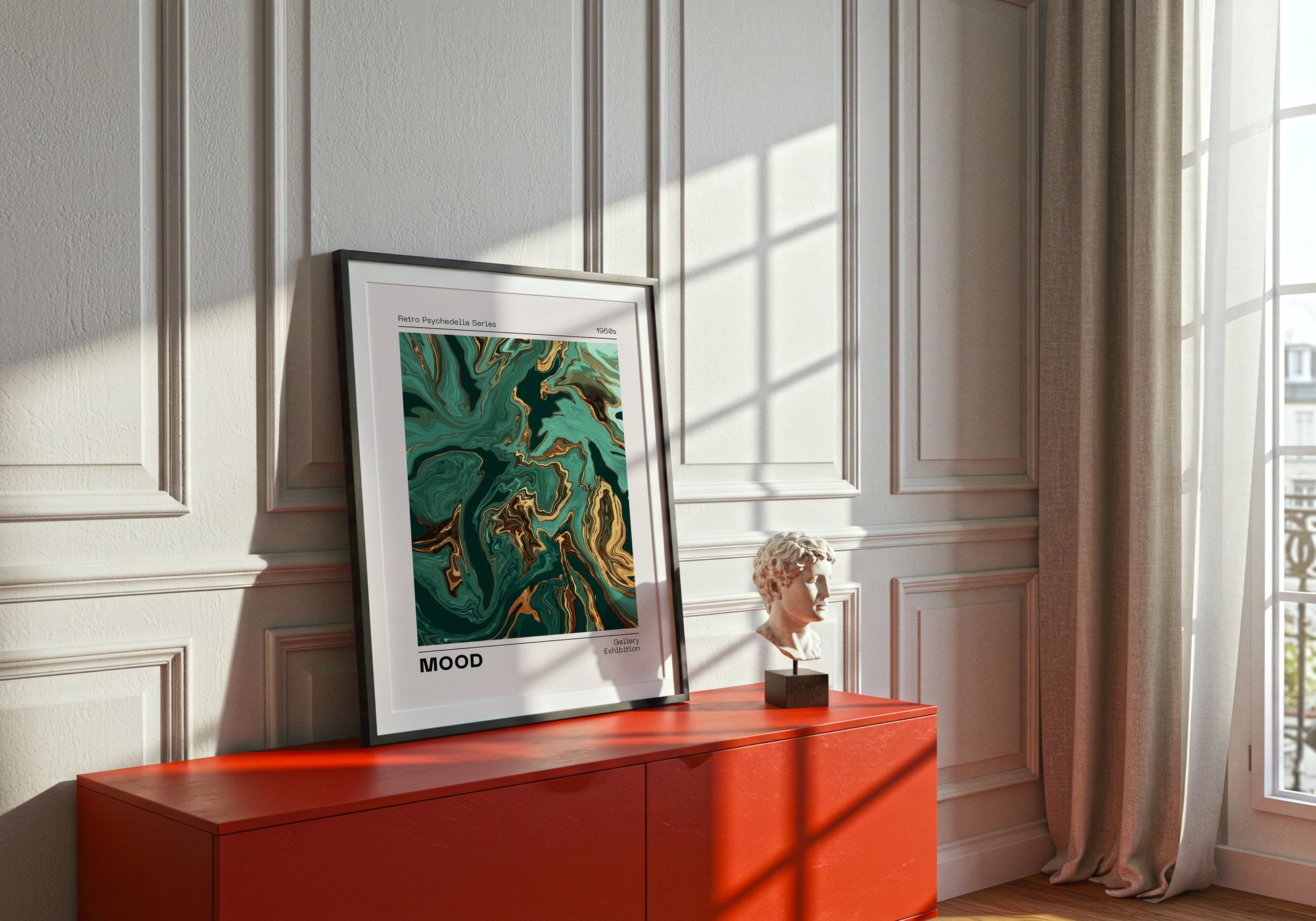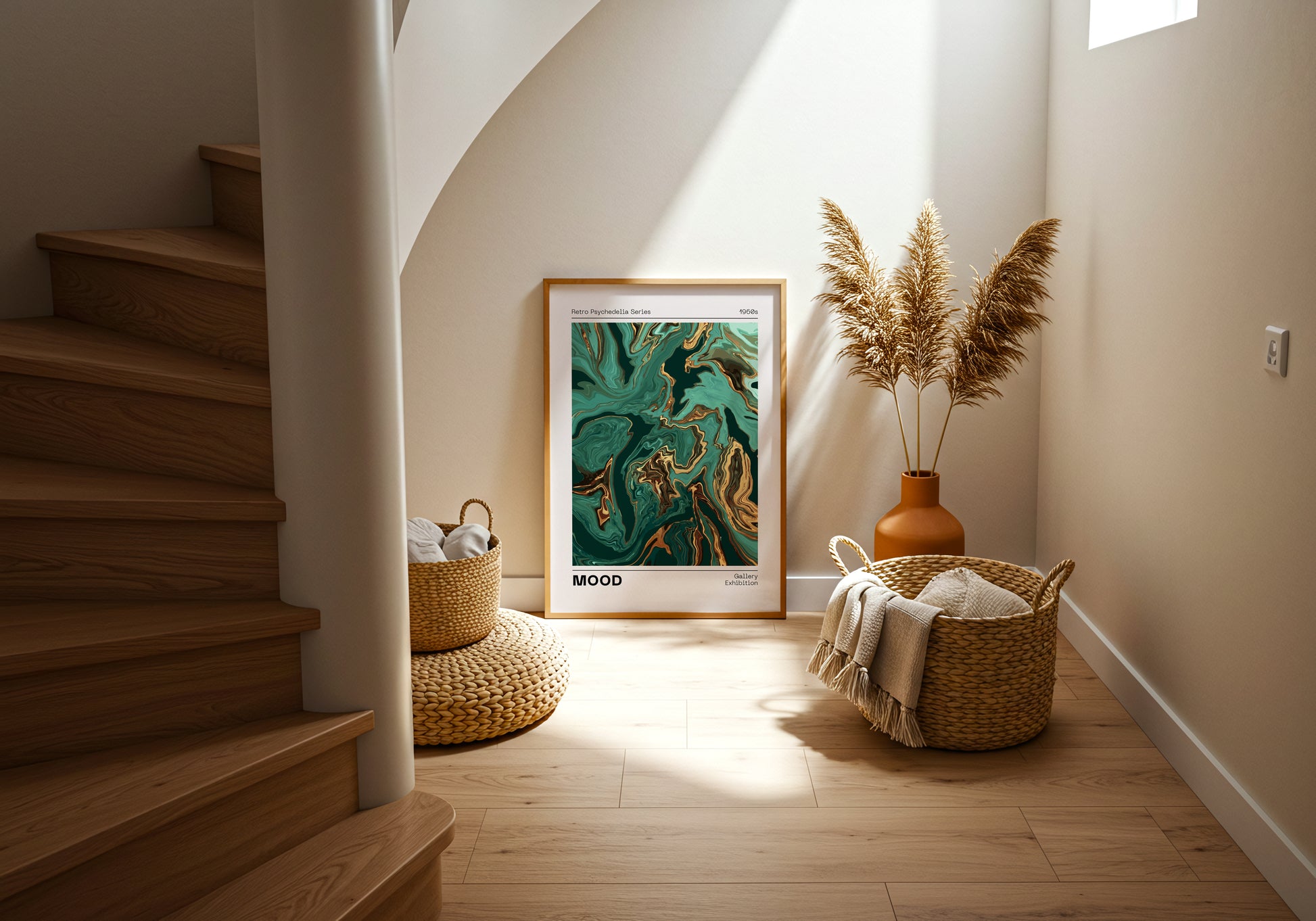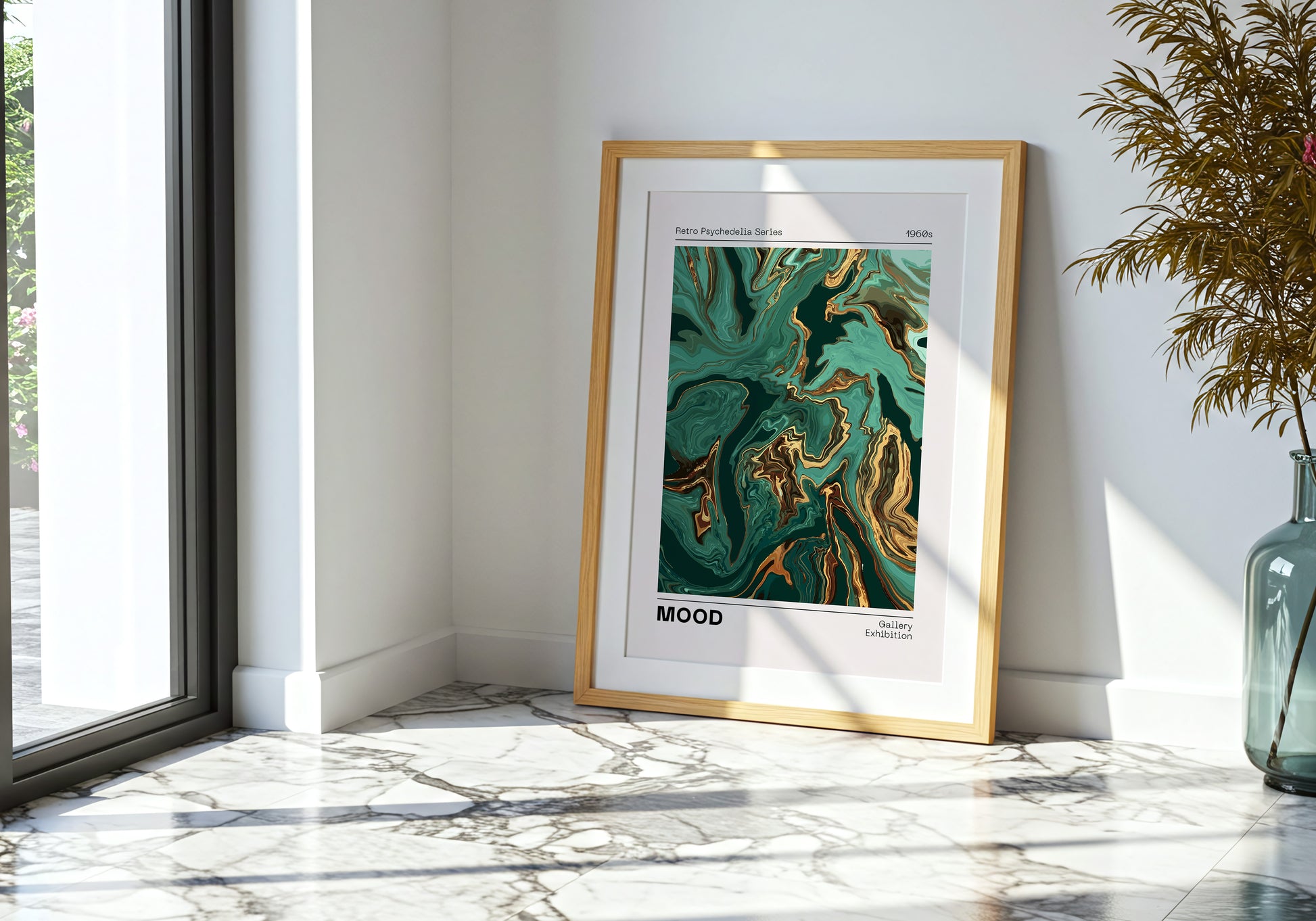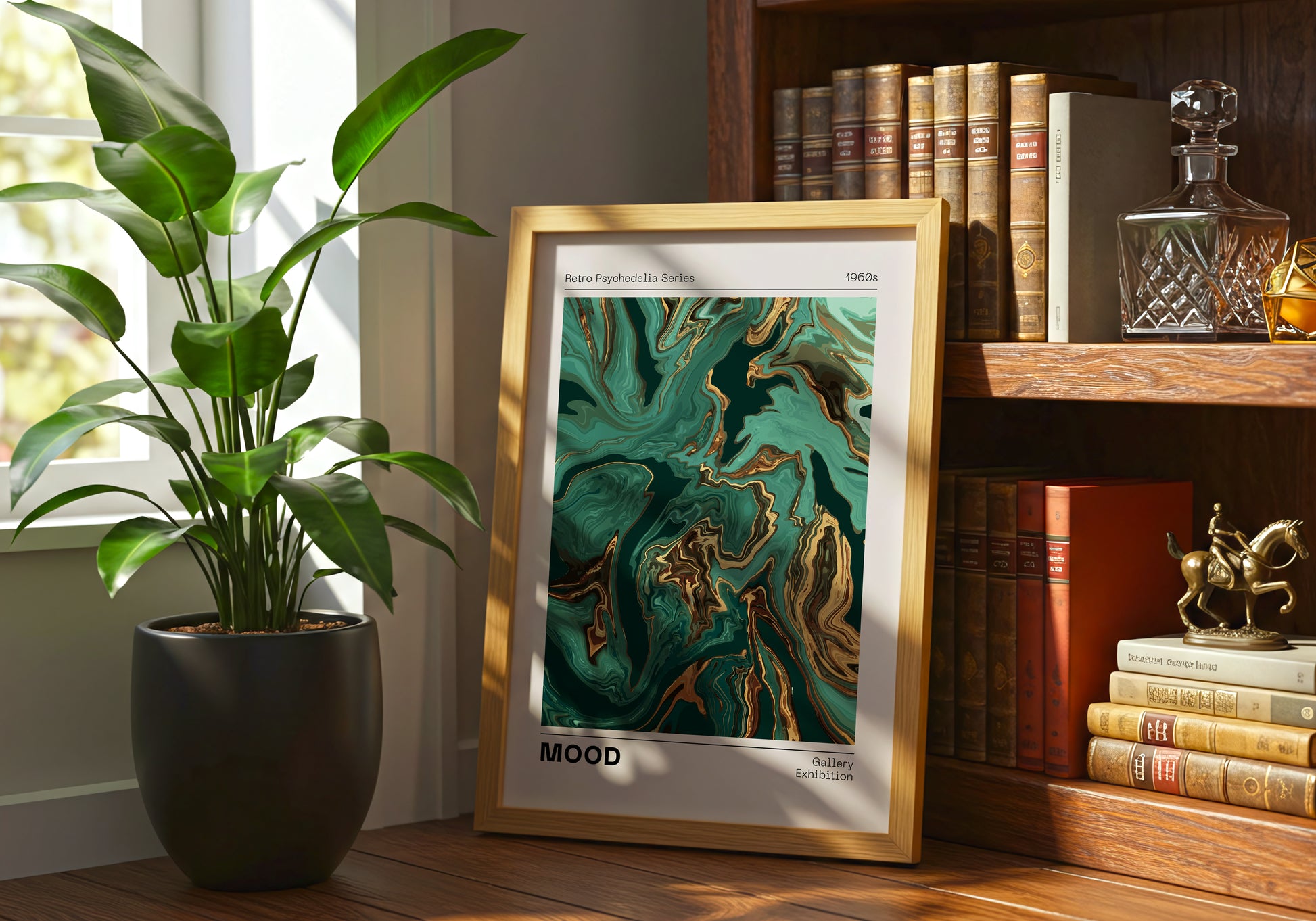 Poster dal carattere psichedelico e rétro, con onde di colore verde, nero e oro che si mescolano creando un effetto fluido e ipnotico. Una stampa ideale per aggiungere profondità, stile e atmosfera agli ambienti moderni.