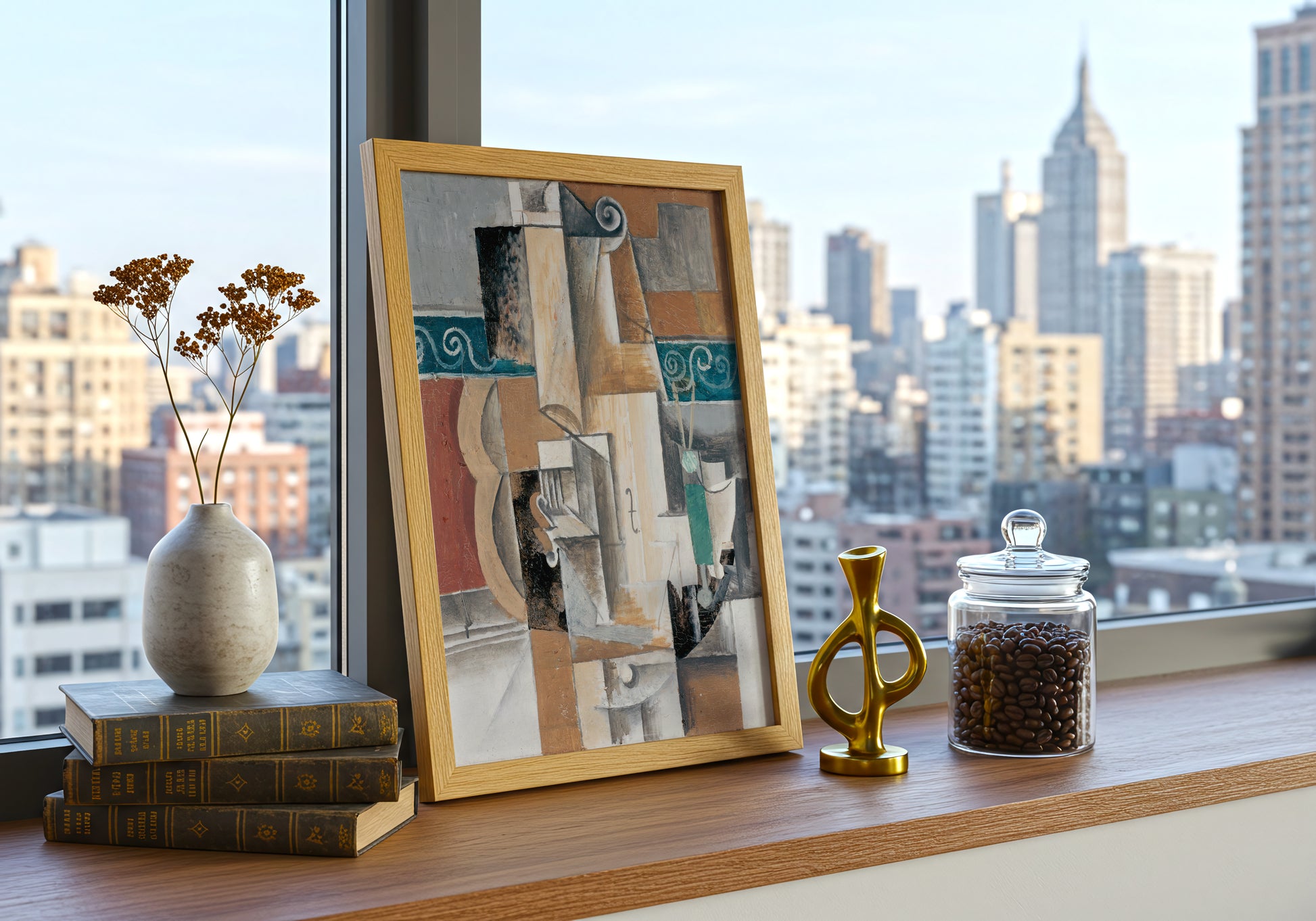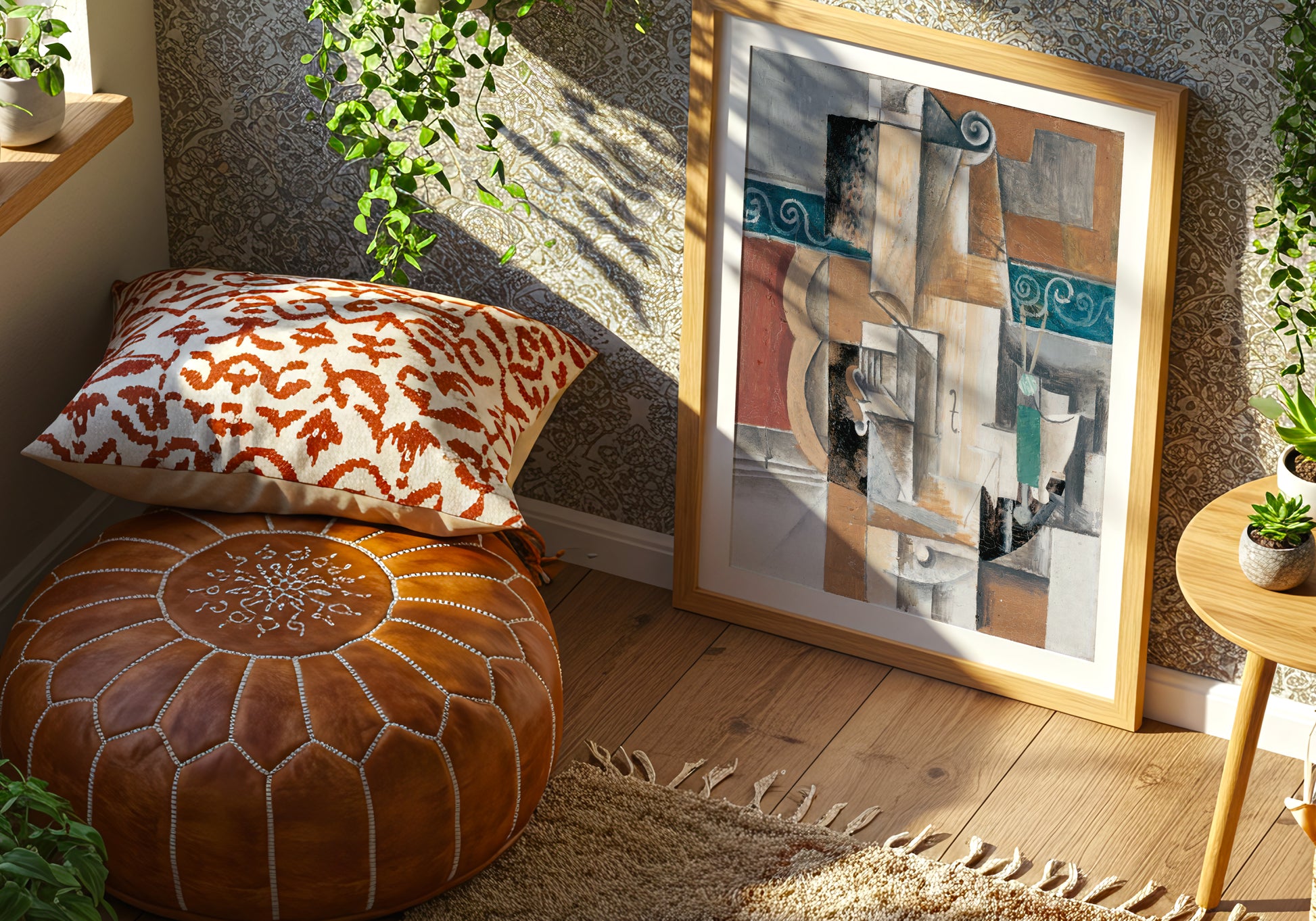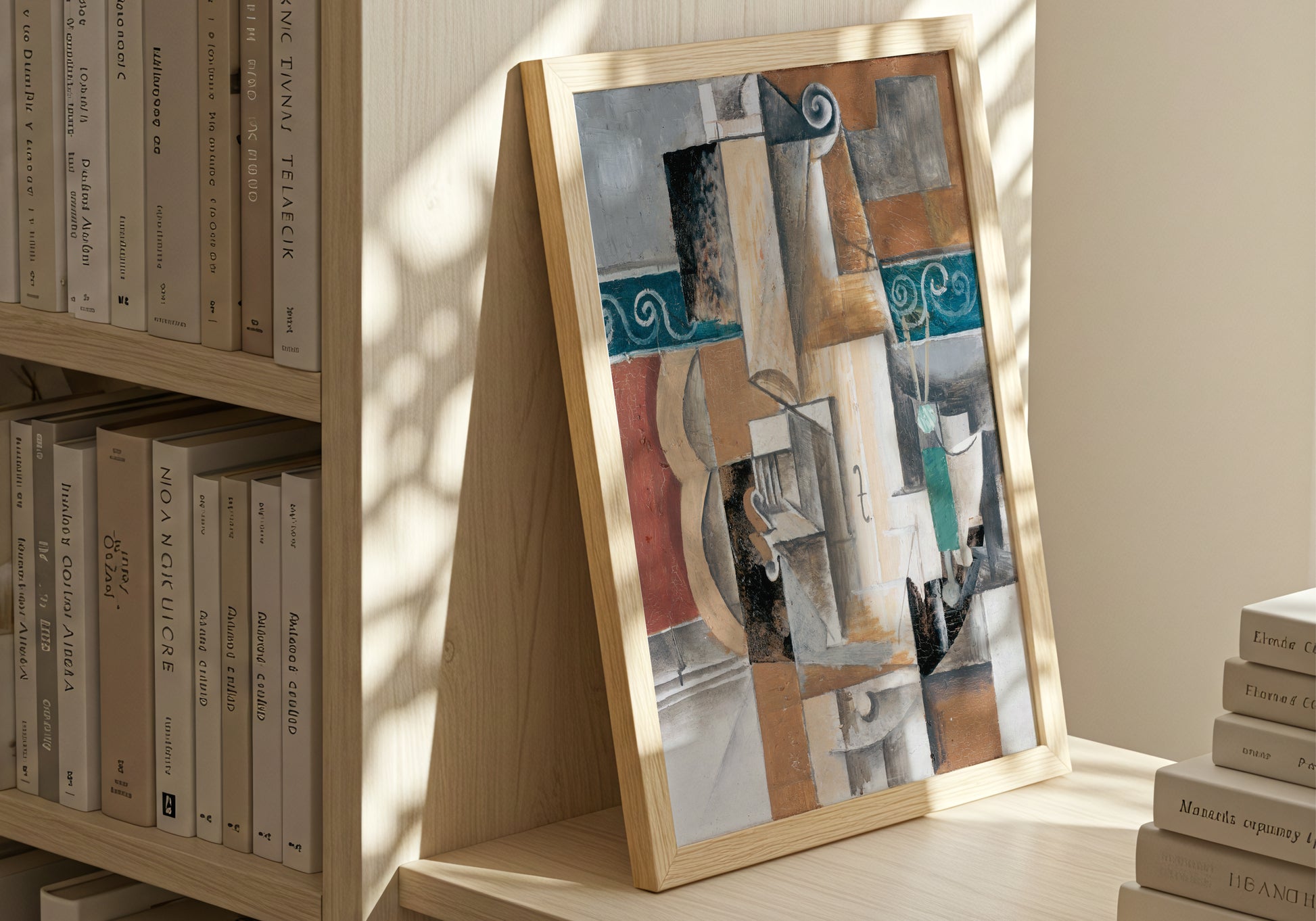 Un intreccio di forme geometriche, texture materiche e colori terrosi che si sovrappongono in perfetta armonia: questo poster è un chiaro richiamo al periodo cubista di Picasso. La composizione frammentata invita l’occhio a ricostruire oggetti familiari osservandoli da prospettive multiple, creando un effetto dinamico e sofisticato. Un pezzo d’arte ideale per chi ama il design astratto, le linee spezzate e l’estetica senza tempo del cubismo.